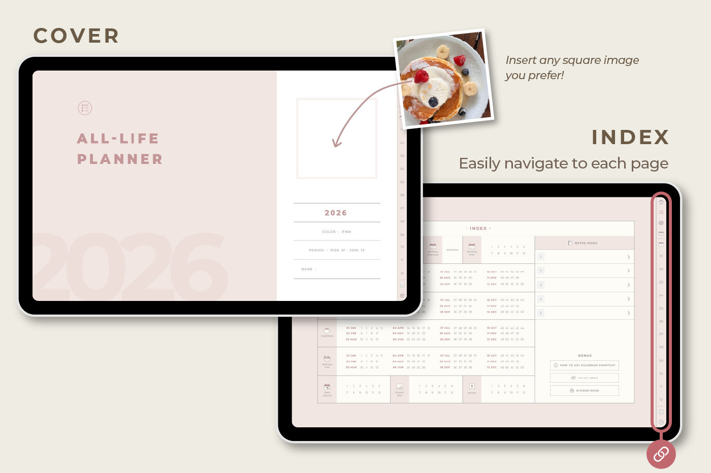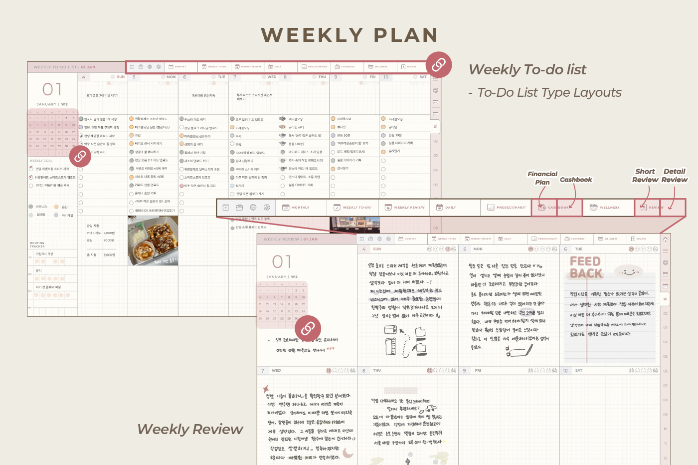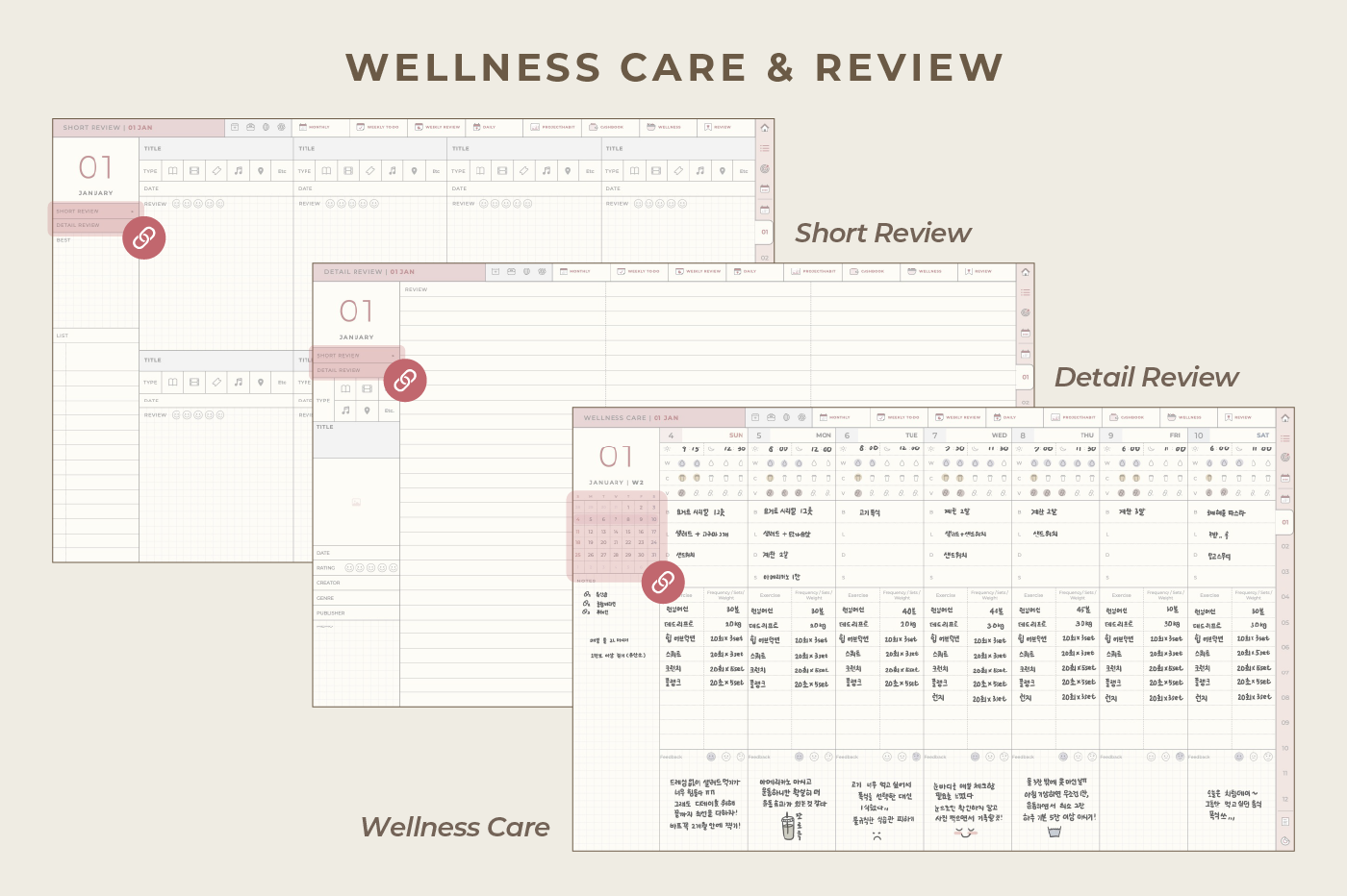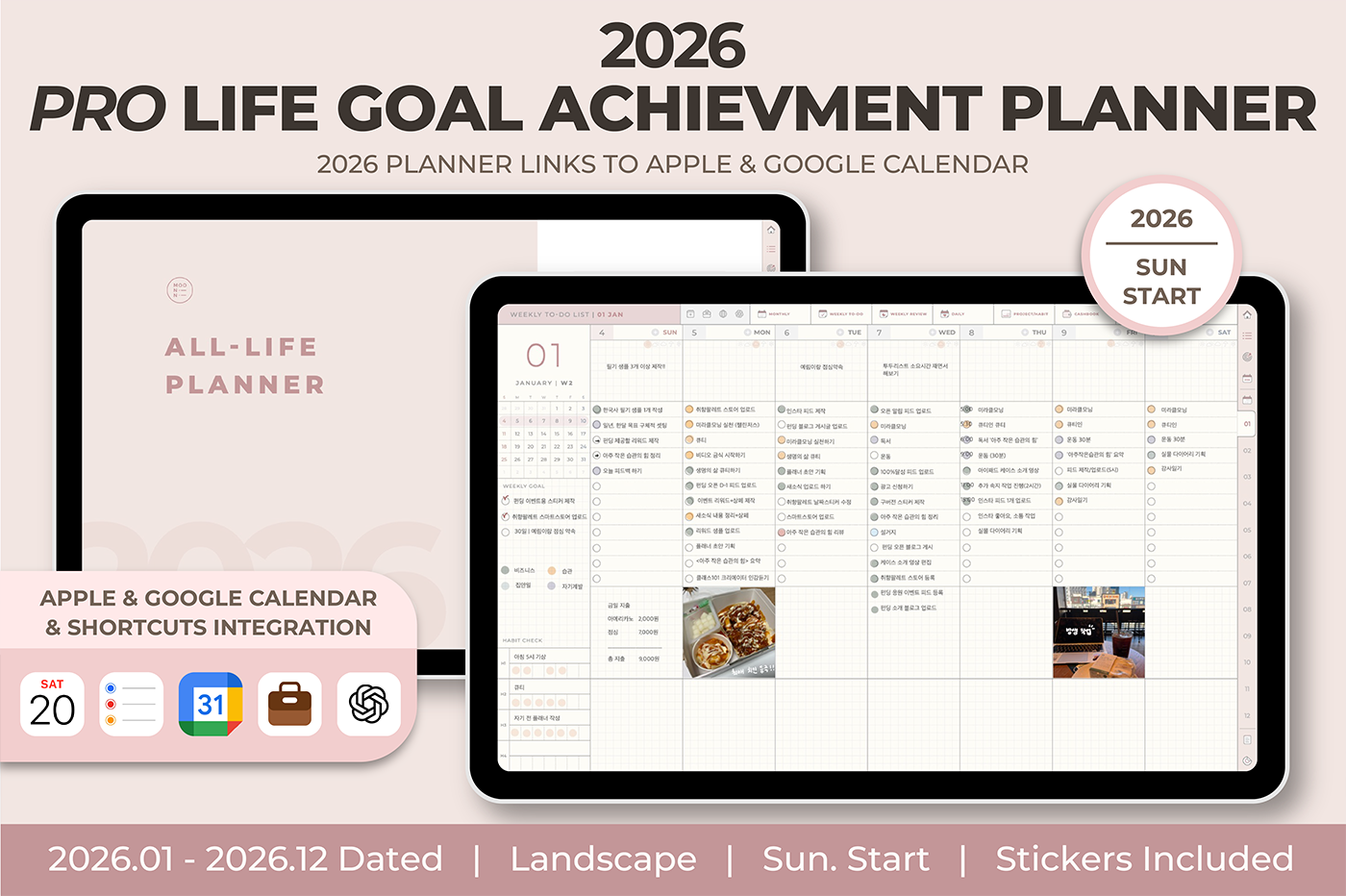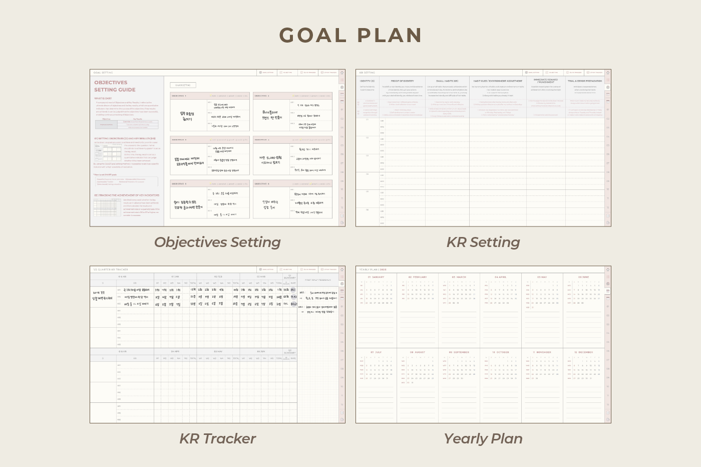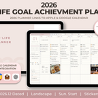 [Page Composition] - Hyperlinks - User Guide - Apple & Google Calendar Integration - Shortcuts Integration (Utility, Google Translate, ChatGPT) - Cover - Index - OKR Goal Setting - Yearly / Monthly Plans - Weekly To-do List / Riview - Daily Journal - Cashbook - Wellness Care - Notes (24 types) - Stickers - Color Code