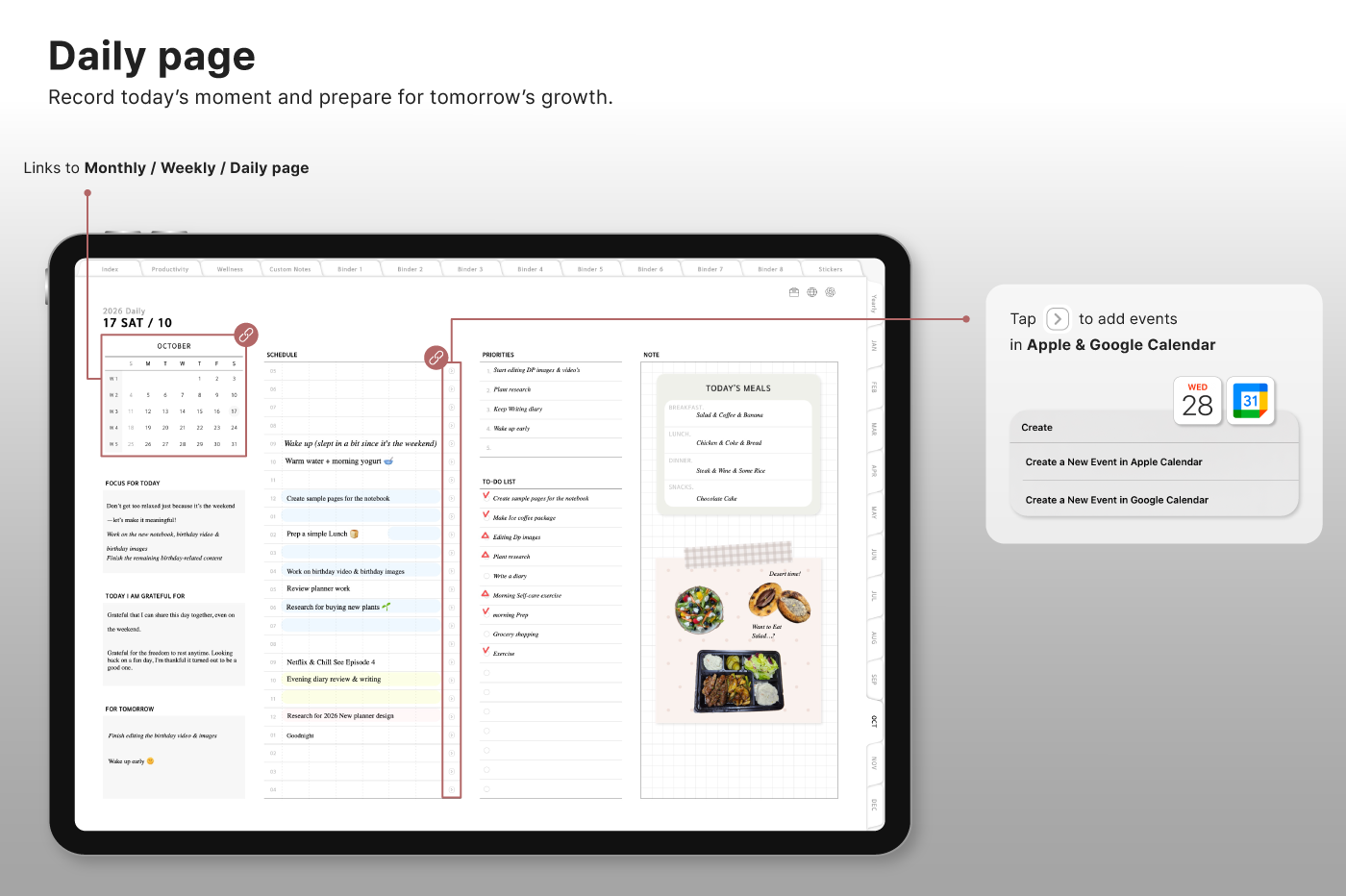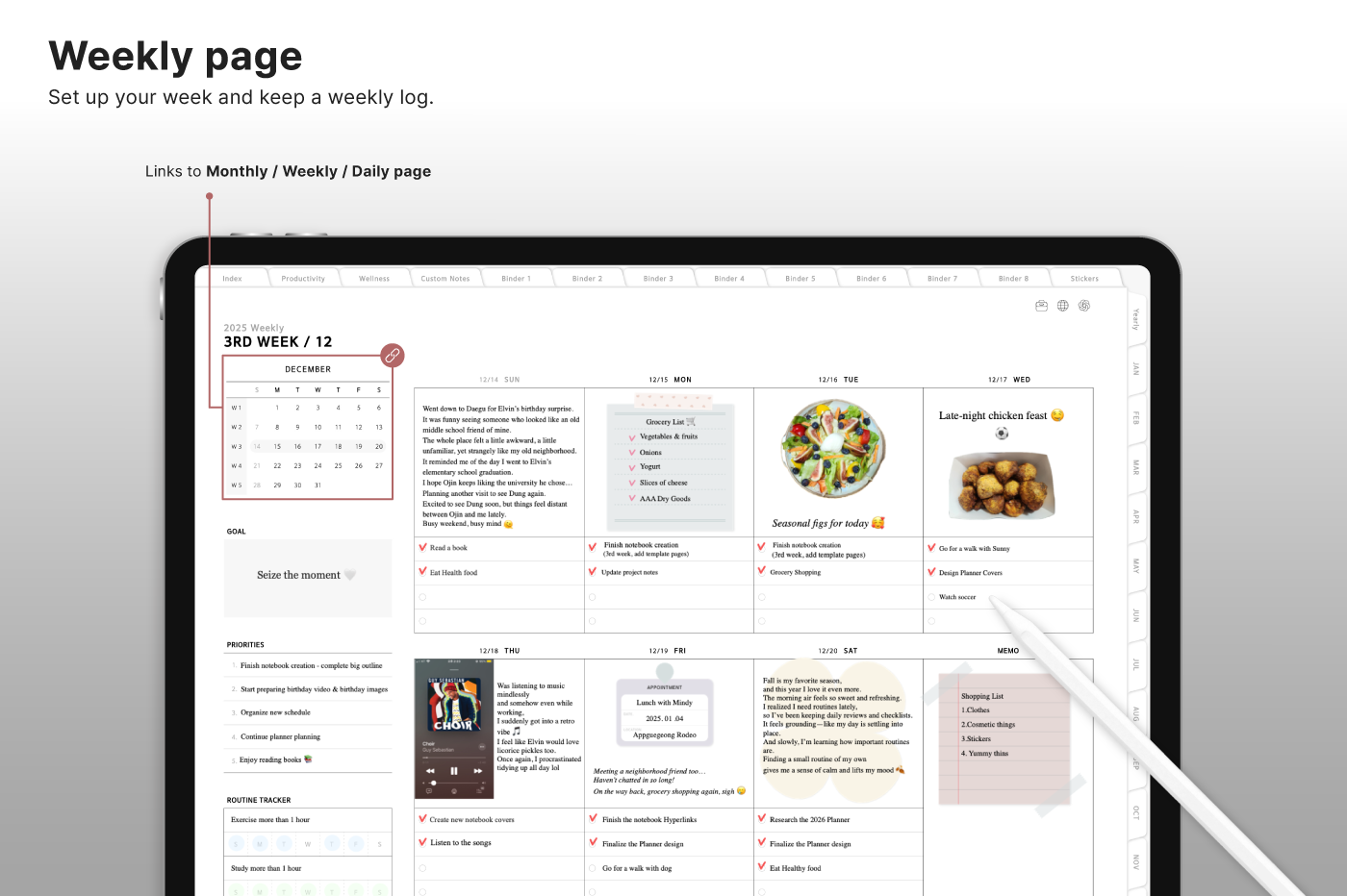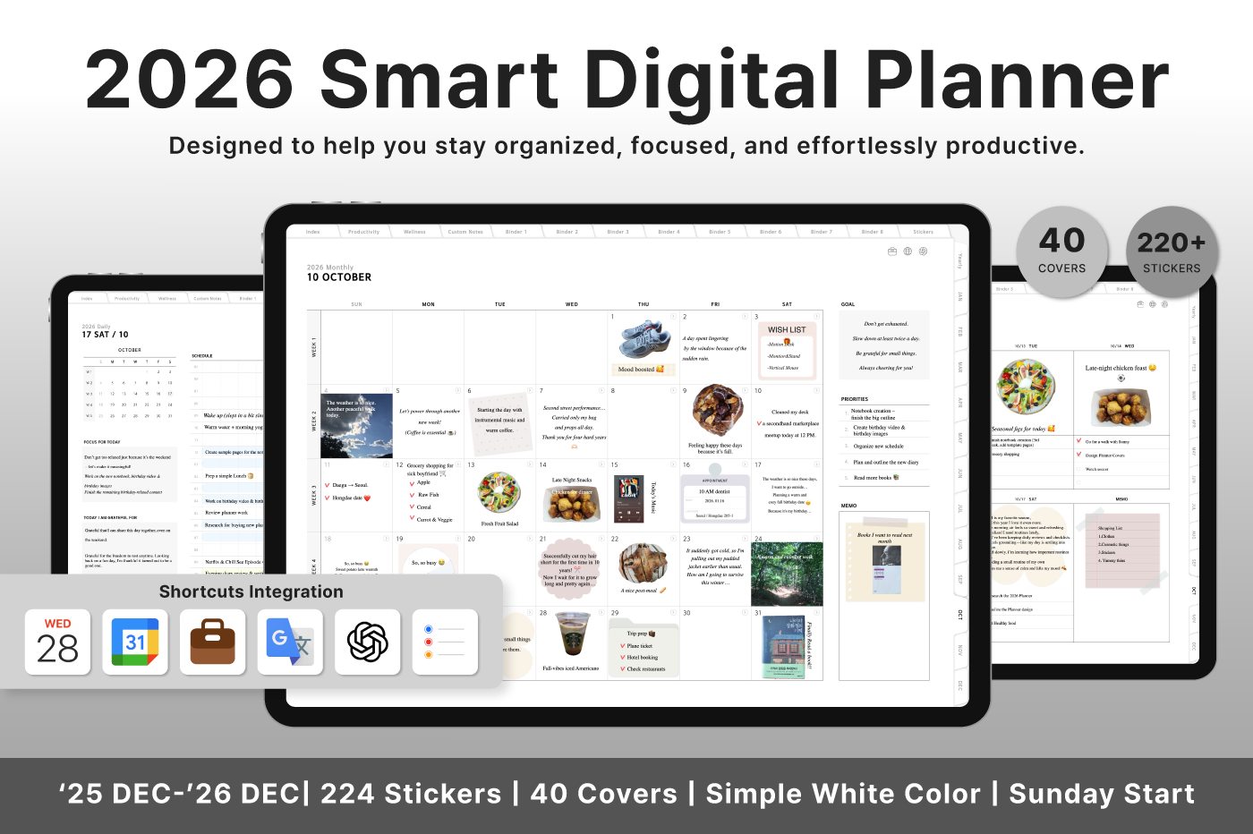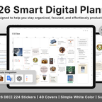 Build a convenient recording habit with an intuitive layout and hyperlink tabs that let you move easily between each page. [Page Composition] - Hyperlinks - User Guide - Apple & Google Calendar Integration - Shortcuts Integration (Utility, Google Translate, ChatGPT) - Dec '25 Included - Covers (40) - Calendar, Year at a Glance, Vision Board - Monthly / Weekly / Daily Plans - Productivity (6 types) - Wellness (7 types) - Note Binders (8) - Notes (24 types) - 220+ Stickers