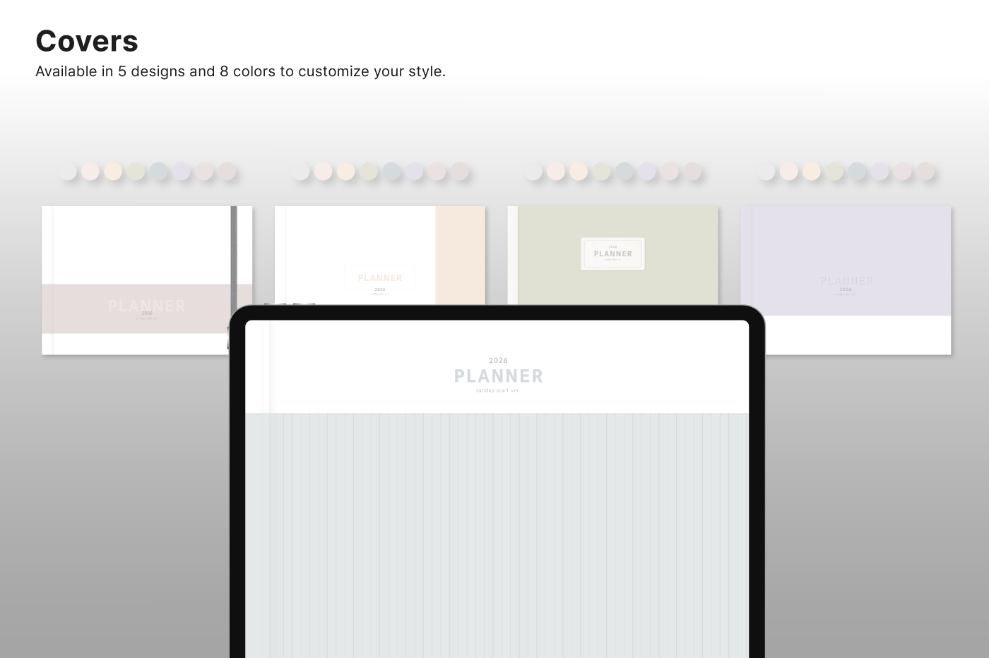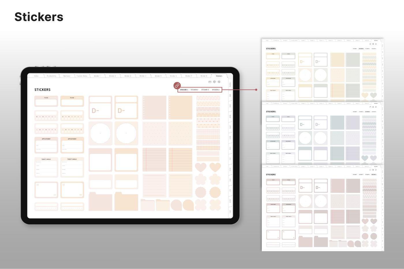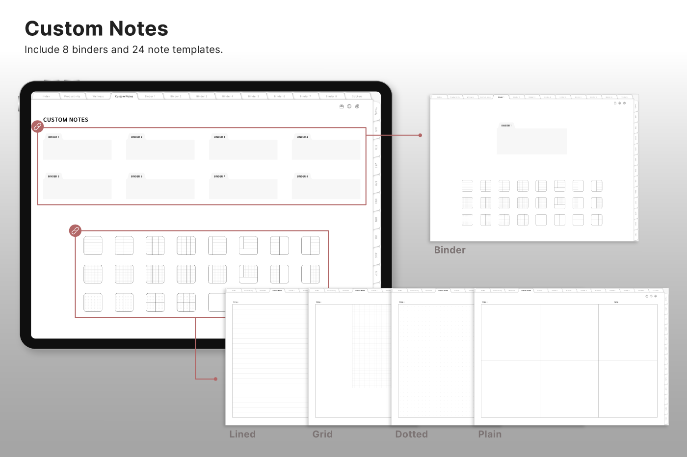 Build a convenient recording habit with an intuitive layout and hyperlink tabs that let you move easily between each page. [Page Composition] - Hyperlinks - User Guide - Apple & Google Calendar Integration - Shortcuts Integration (Utility, Google Translate, ChatGPT) - Dec '25 Included - Covers (40) - Calendar, Year at a Glance, Vision Board - Monthly / Weekly / Daily Plans - Productivity (6 types) - Wellness (7 types) - Note Binders (8) - Notes (24 types) - 220+ Stickers