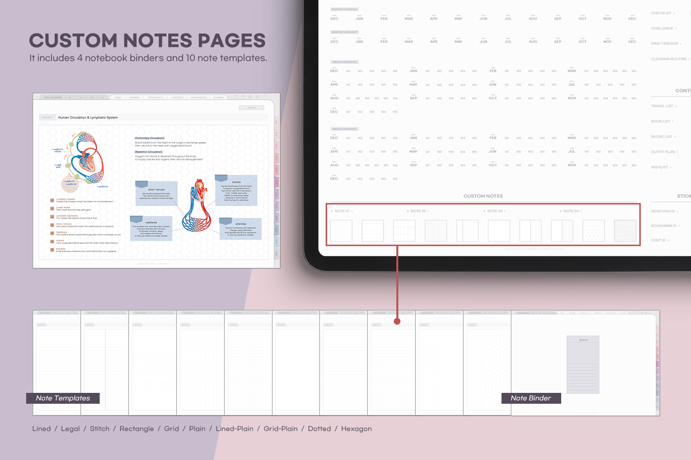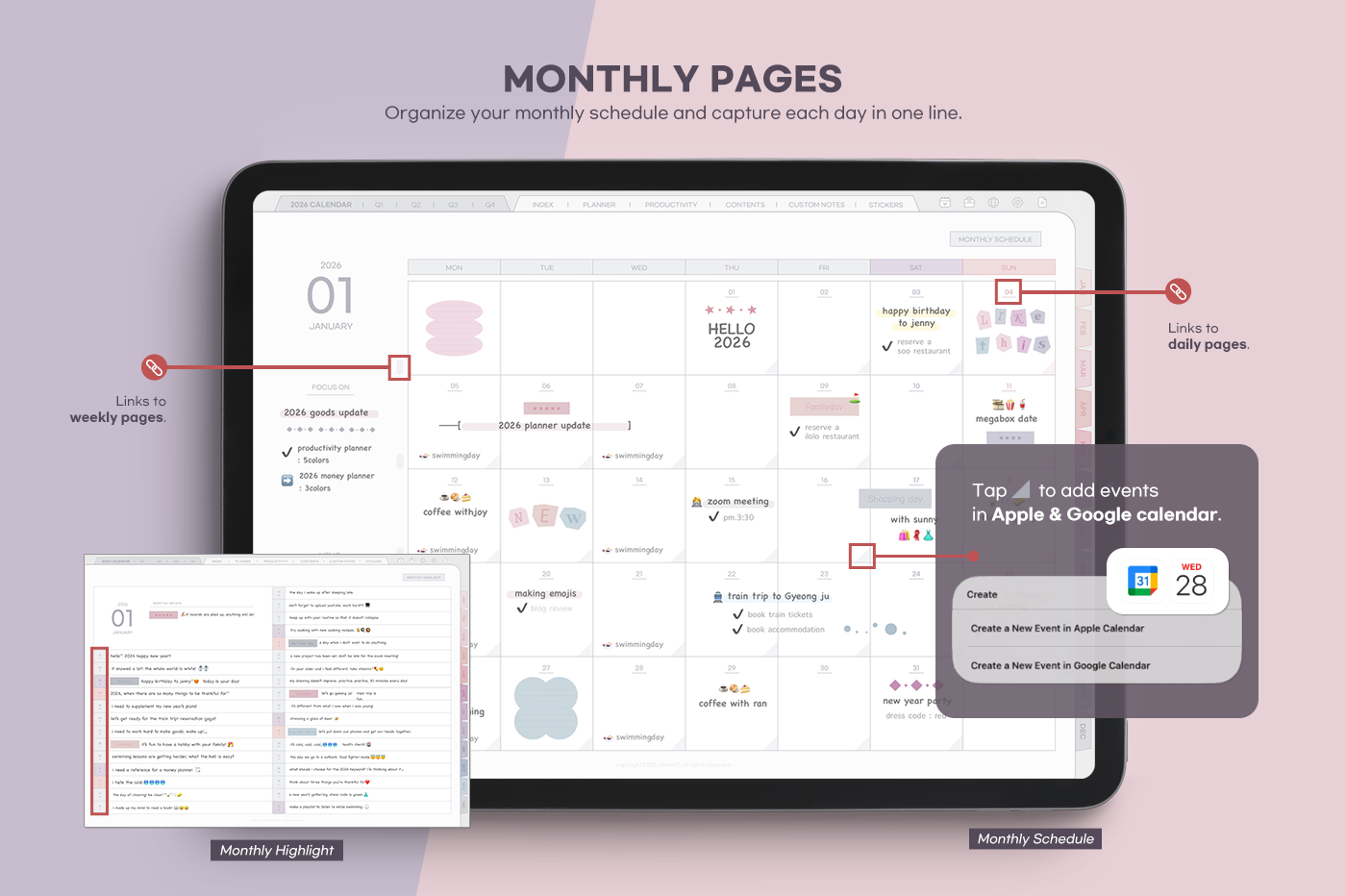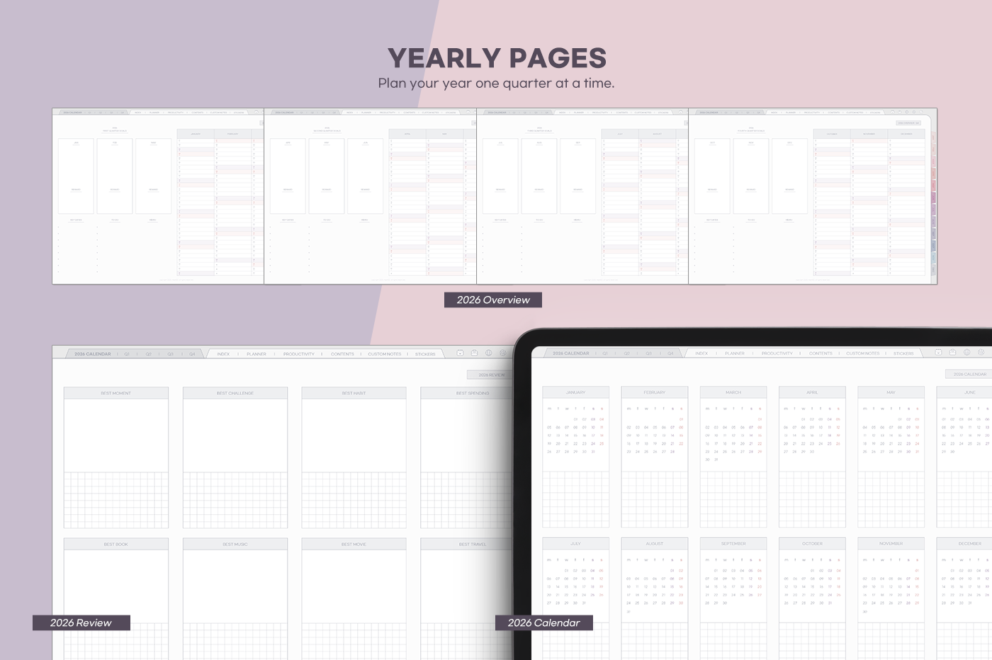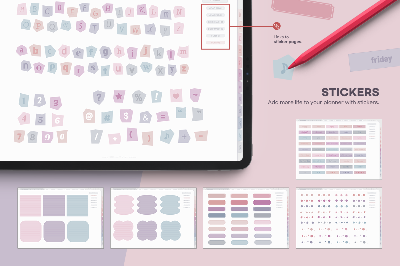 An all-in-one planner featuring eye-comforting colors and more than 20 special template pages. [Page Composition] - User Guide - Apple & Google Calendar Integration - Shortcuts Integration (Utility, Google Translate, ChatGPT) - Dec '25 Included - Covers (3) - Yearly : Calendar, Overview, Review - Quarterly Plans - Monthly (2 types) - Weekly (2 types) - Daily - Productivity (10 types) - Special Contents (10 types) - Note Binders (4) - Notes (10 types) - 200+ Stickers