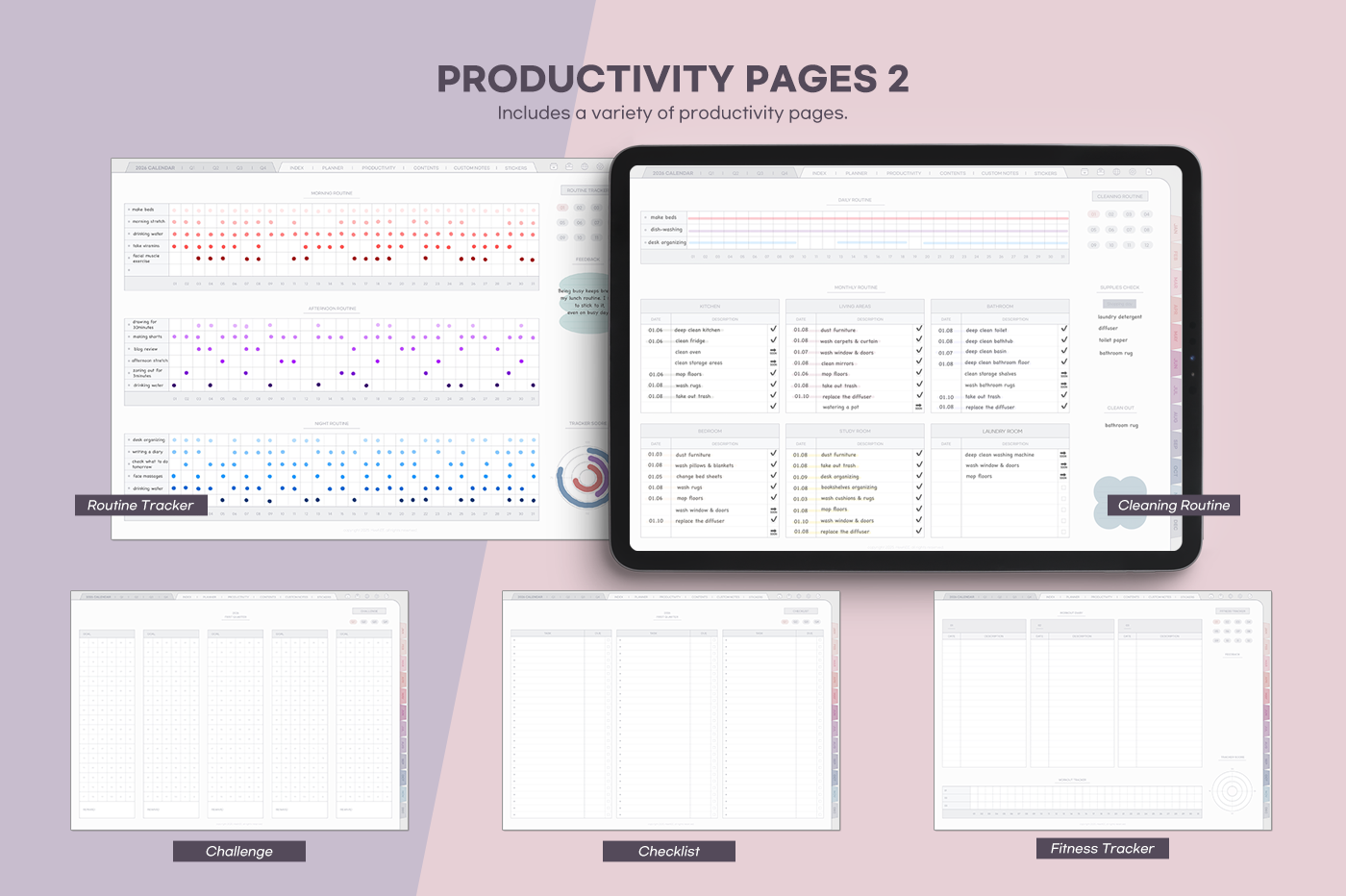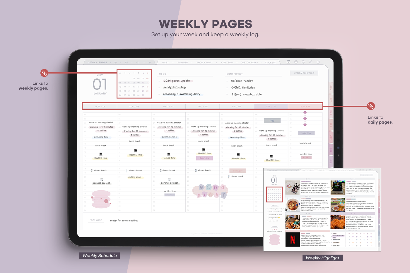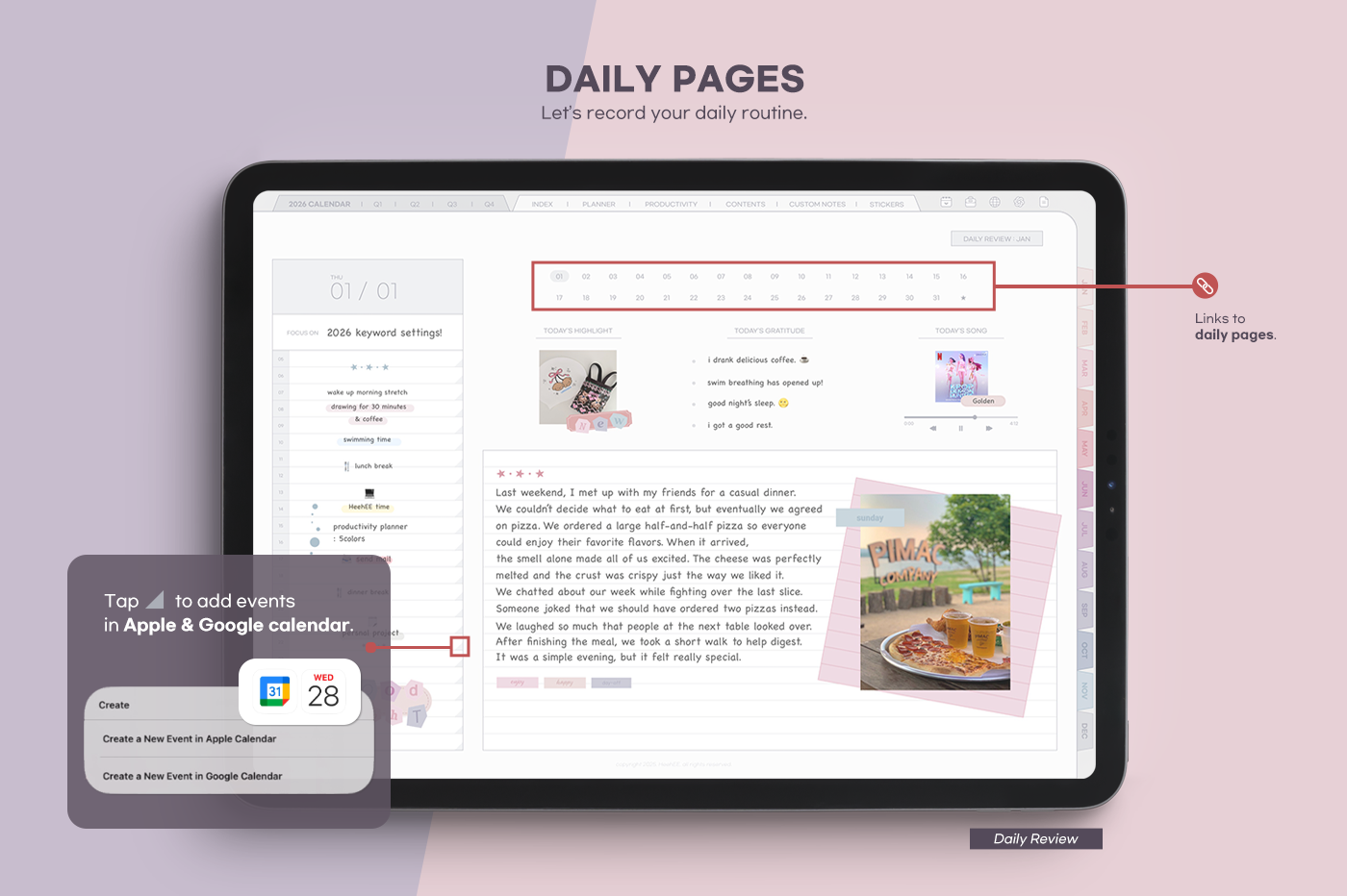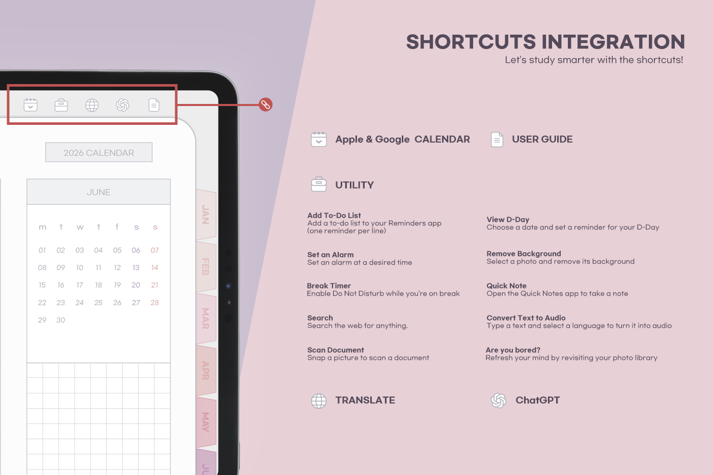 An all-in-one planner featuring eye-comforting colors and more than 20 special template pages. [Page Composition] - User Guide - Apple & Google Calendar Integration - Shortcuts Integration (Utility, Google Translate, ChatGPT) - Dec '25 Included - Covers (3) - Yearly : Calendar, Overview, Review - Quarterly Plans - Monthly (2 types) - Weekly (2 types) - Daily - Productivity (10 types) - Special Contents (10 types) - Note Binders (4) - Notes (10 types) - 200+ Stickers
