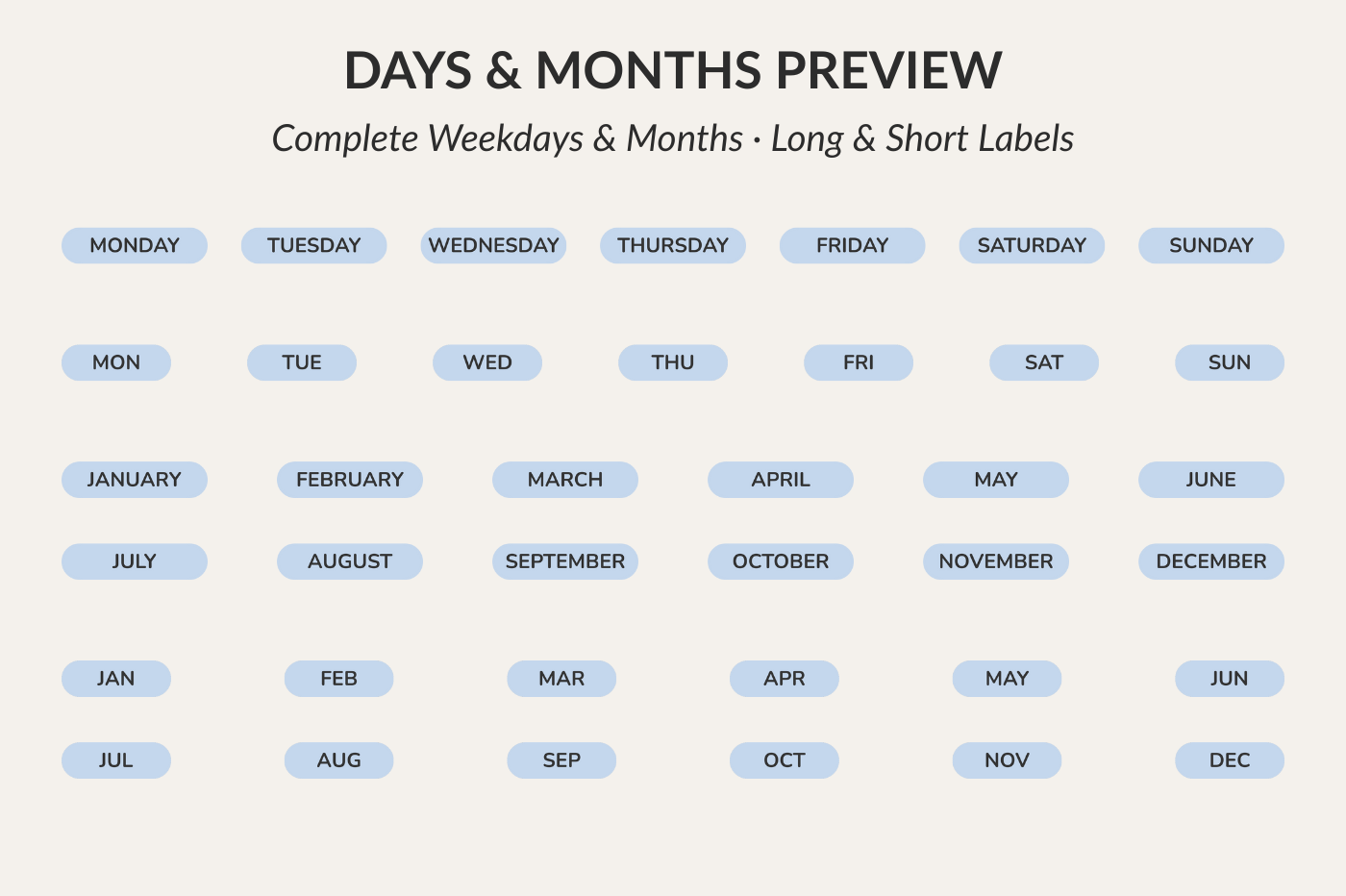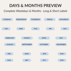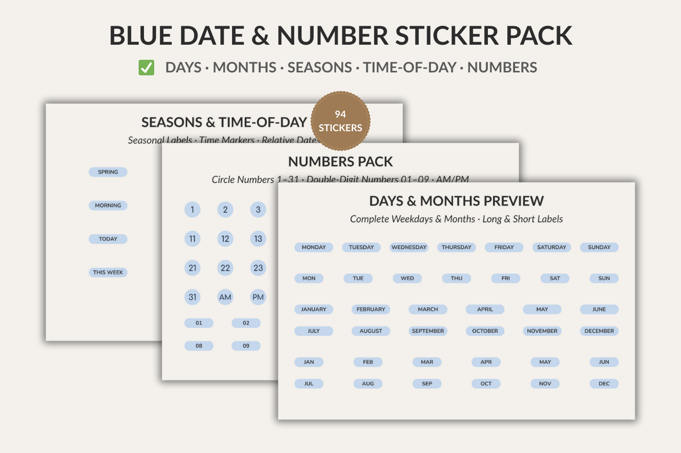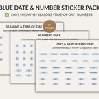 Blue date and number stickers for digital planning. Includes 94 pieces: weekdays, months, seasons, time-of-day labels, relative dates, numbers 01–09, and circle numbers 1–31. Perfect for daily, weekly, and monthly planners, journals, calendars, study planners, and minimal layouts. Goodnotes .collection included.