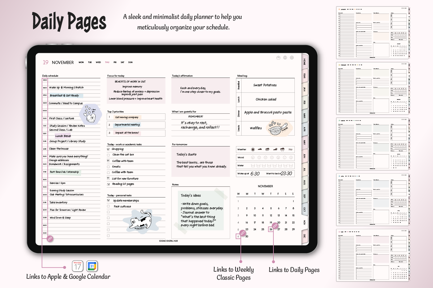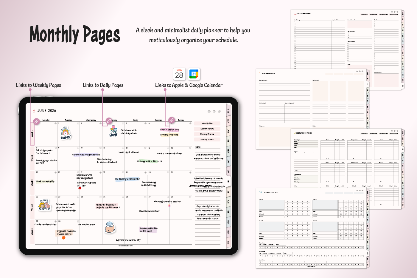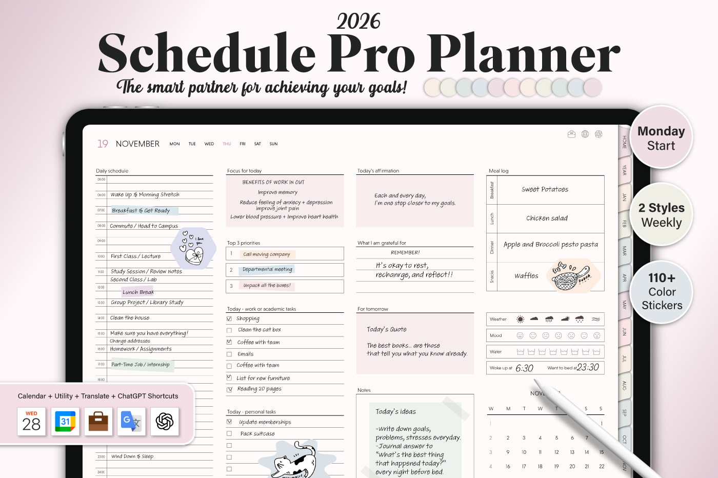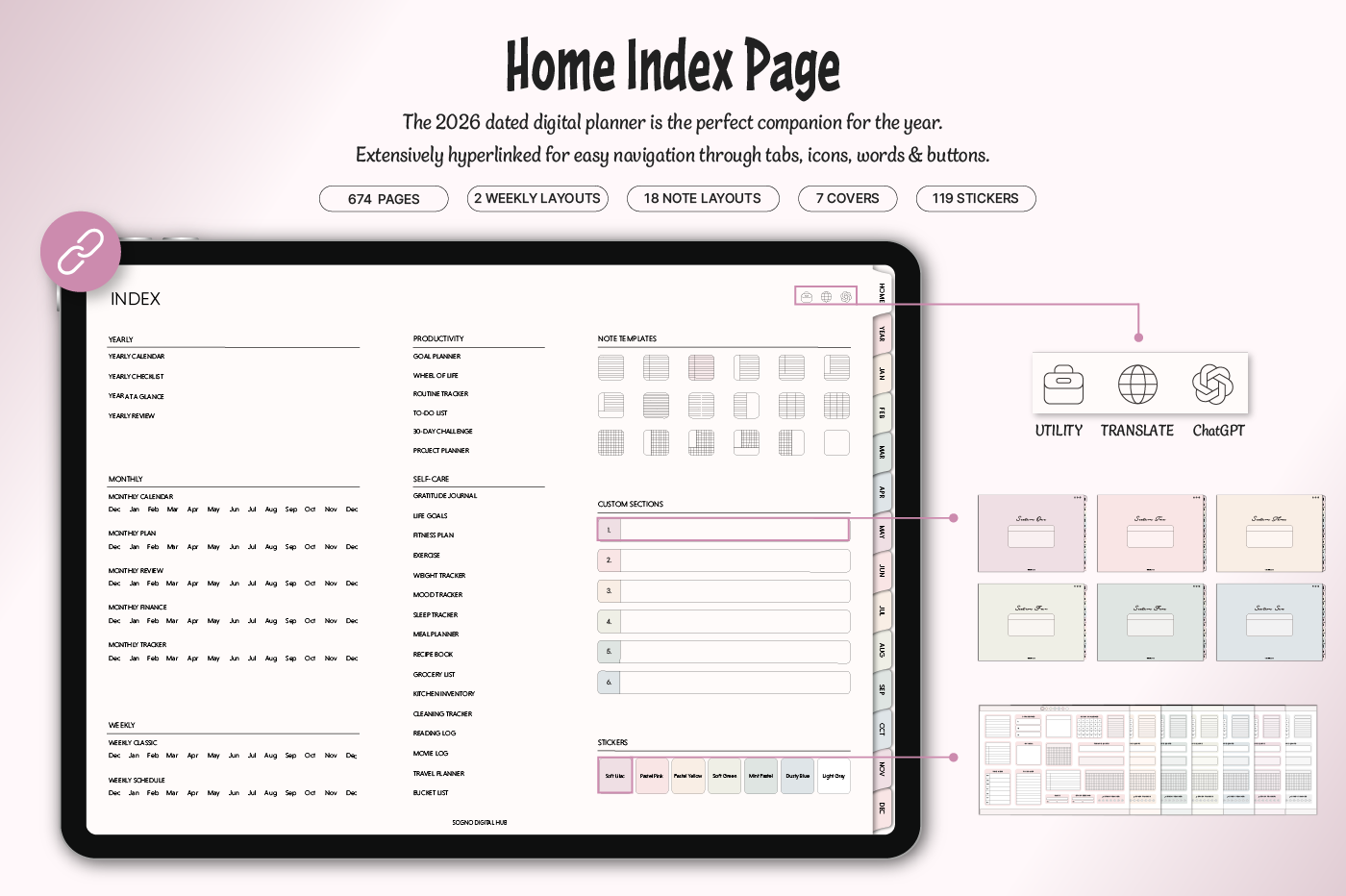 [Page Composition] - Hyperlinks - User Guide - Apple & Google Calendar Integration - Shortcuts Integration (Utility, Google Translate, ChatGPT) - Dec '25 Included - Covers (7) - Yearly : Calendar, Checklist, Year at a Glance, Review - Monthly : Calendar, Plan, Finance, Tracker - Weekly / Daily Plans - Productivity (6 types) - Self-Care (16 types) - Note Binders (6) - Notes (18 types) - Stickers