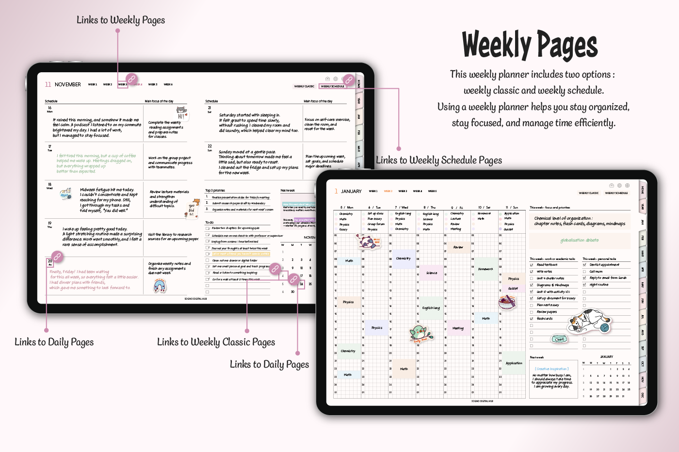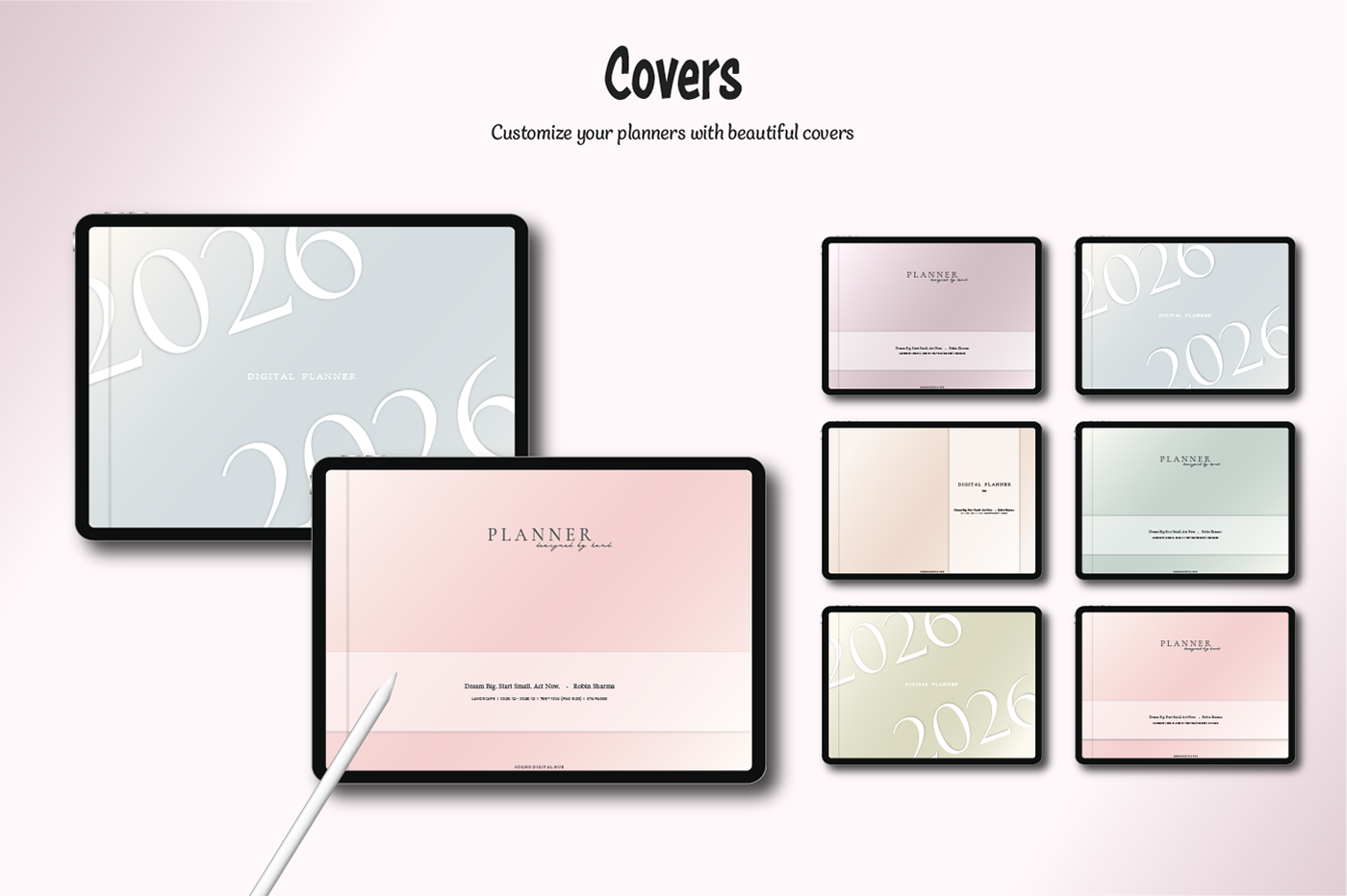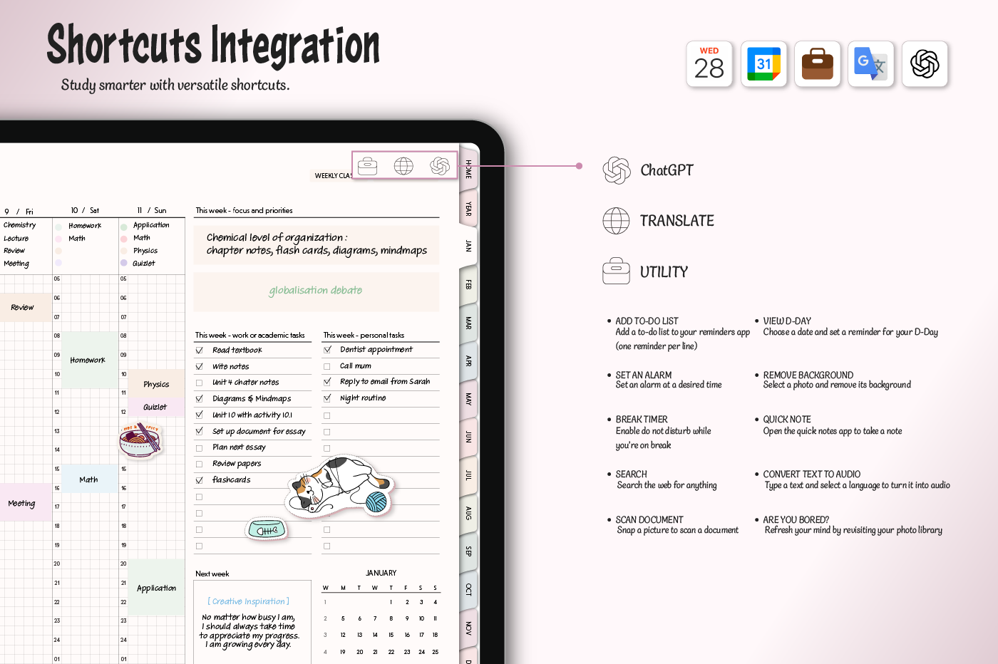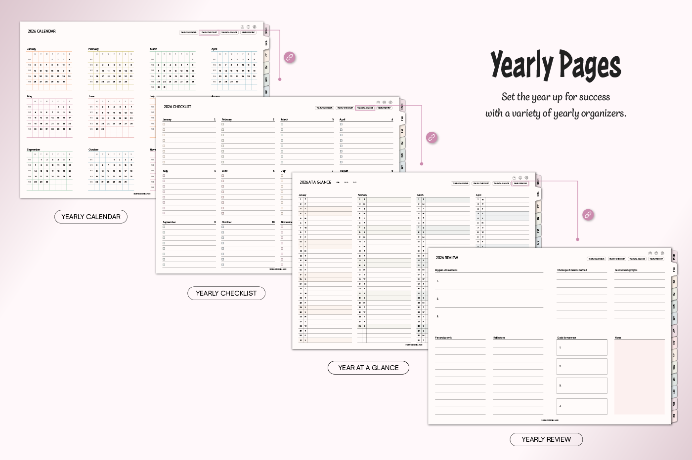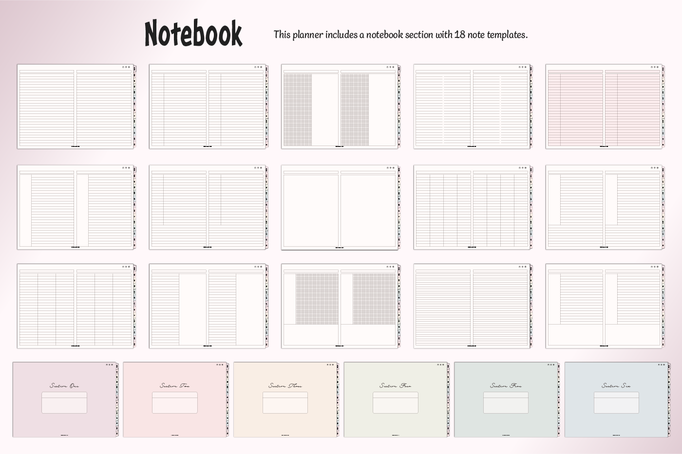 [Page Composition] - Hyperlinks - User Guide - Apple & Google Calendar Integration - Shortcuts Integration (Utility, Google Translate, ChatGPT) - Dec '25 Included - Covers (7) - Yearly : Calendar, Checklist, Year at a Glance, Review - Monthly : Calendar, Plan, Finance, Tracker - Weekly / Daily Plans - Productivity (6 types) - Self-Care (16 types) - Note Binders (6) - Notes (18 types) - Stickers