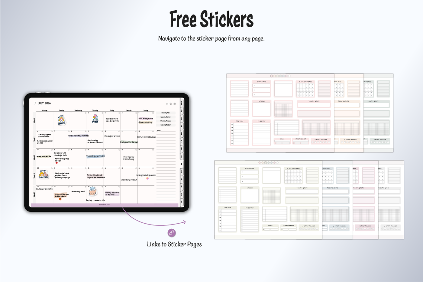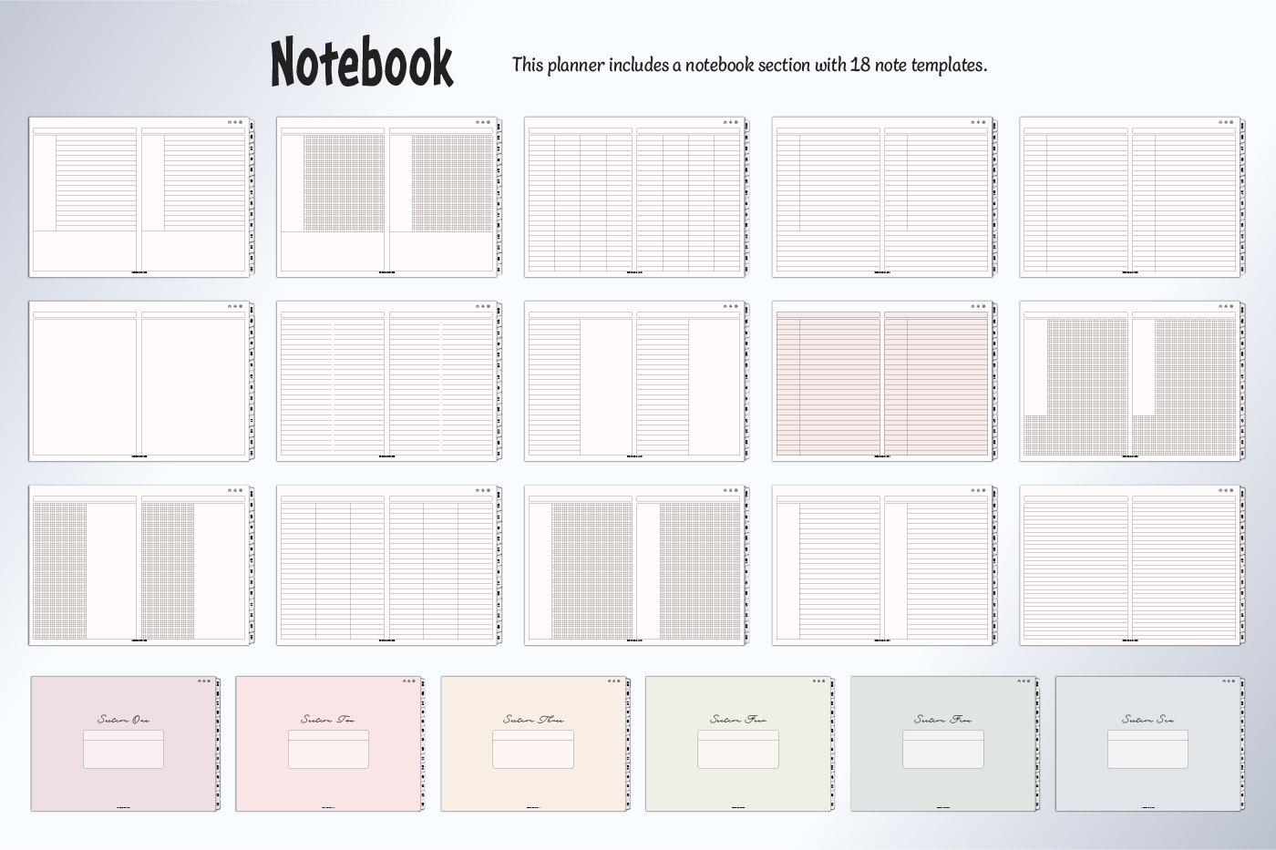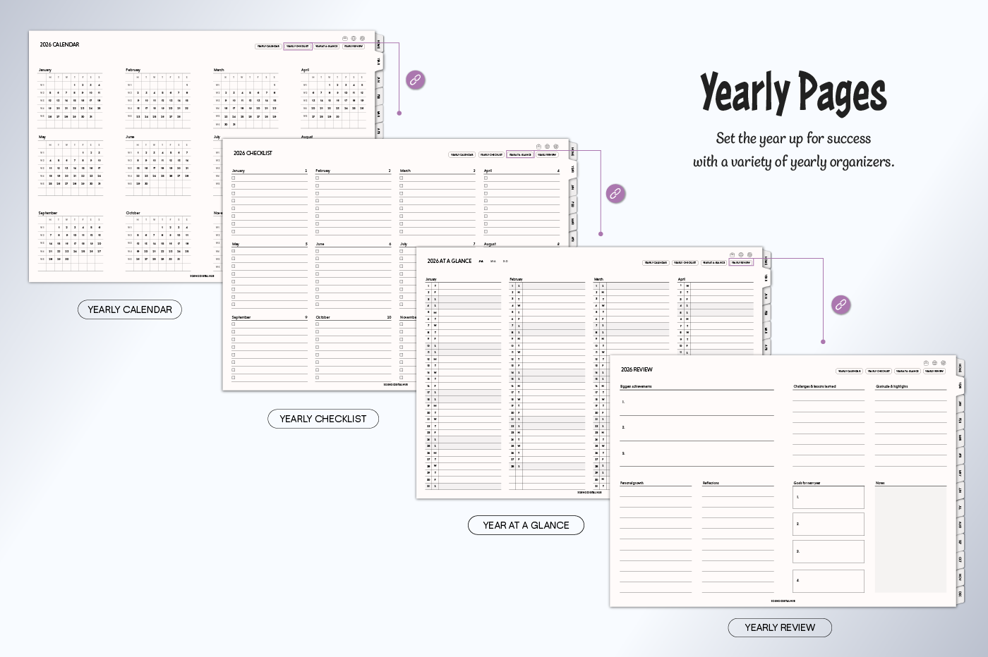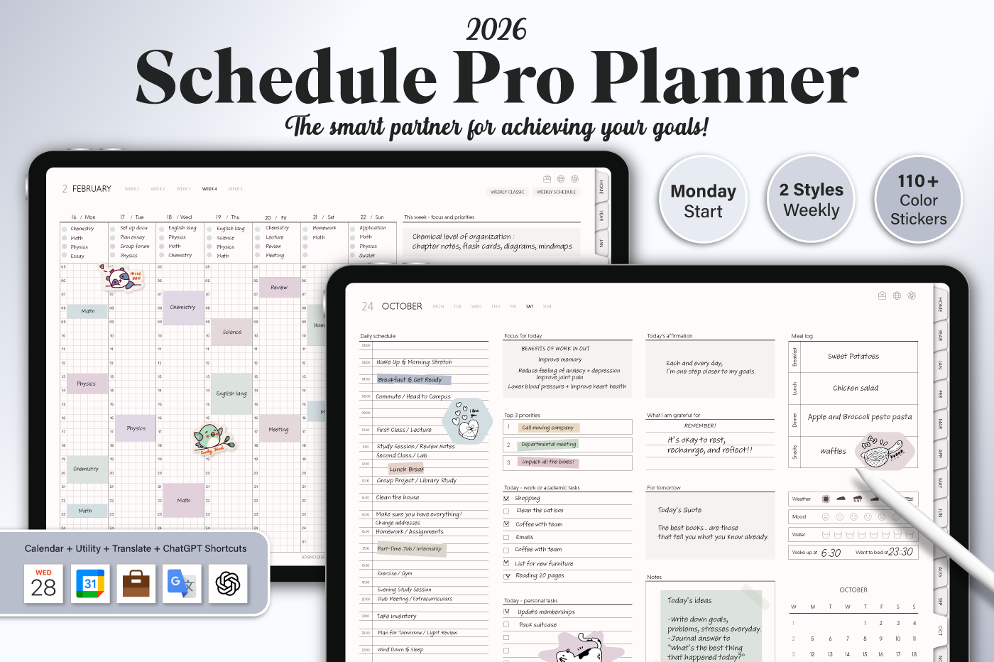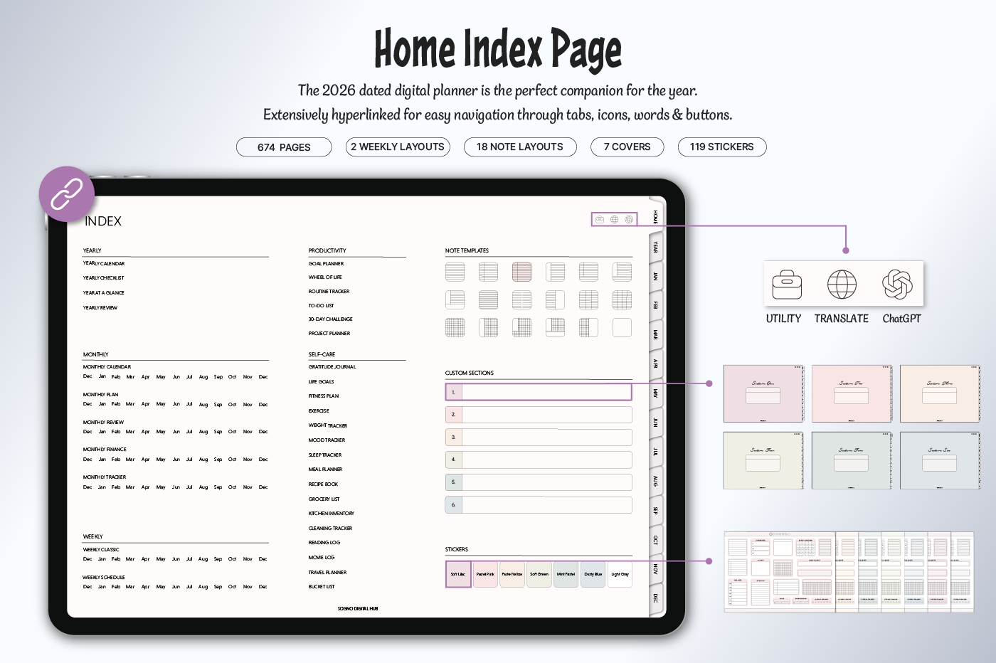 [Page Composition] - Hyperlinks - User Guide - Apple & Google Calendar Integration - Shortcuts Integration (Utility, Google Translate, ChatGPT) - Dec '25 Included - Covers (7) - Yearly : Calendar, Checklist, Year at a Glance, Review - Monthly : Calendar, Plan, Finance, Tracker - Weekly / Daily Plans - Productivity (6 types) - Self-Care (16 types) - Note Binders (6) - Notes (18 types) - Stickers