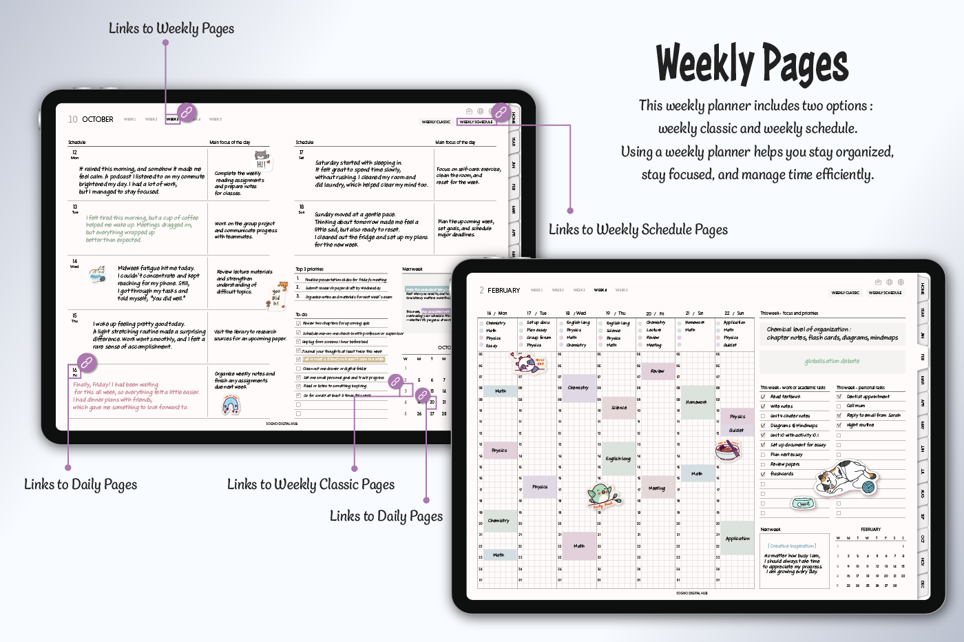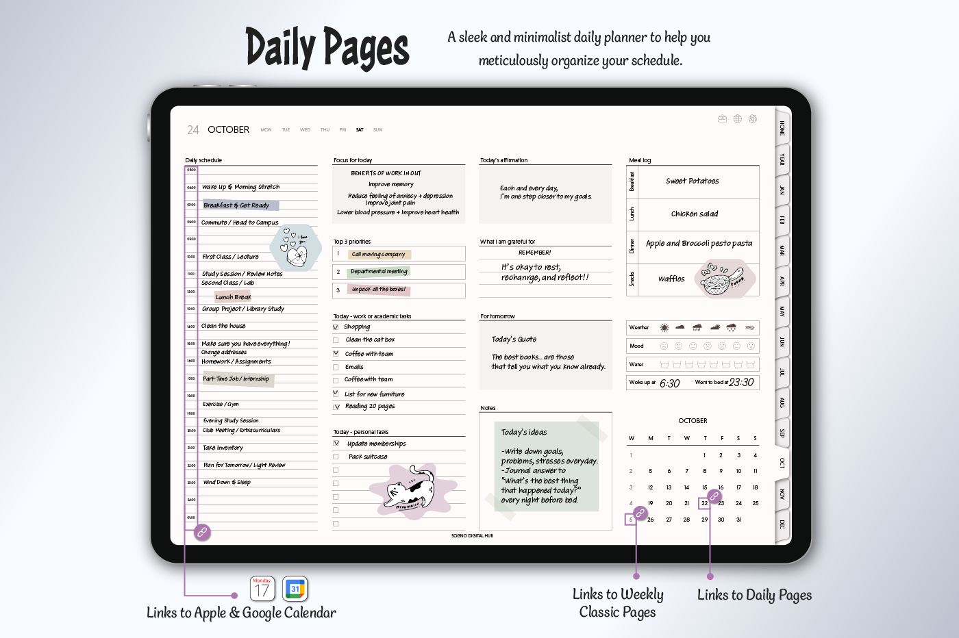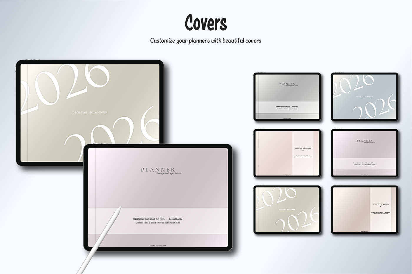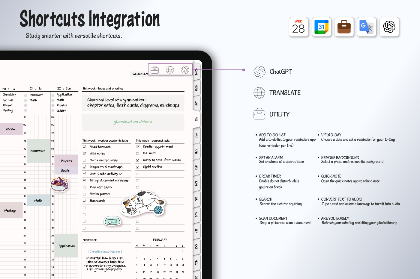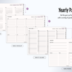 [Page Composition] - Hyperlinks - User Guide - Apple & Google Calendar Integration - Shortcuts Integration (Utility, Google Translate, ChatGPT) - Dec '25 Included - Covers (7) - Yearly : Calendar, Checklist, Year at a Glance, Review - Monthly : Calendar, Plan, Finance, Tracker - Weekly / Daily Plans - Productivity (6 types) - Self-Care (16 types) - Note Binders (6) - Notes (18 types) - Stickers
