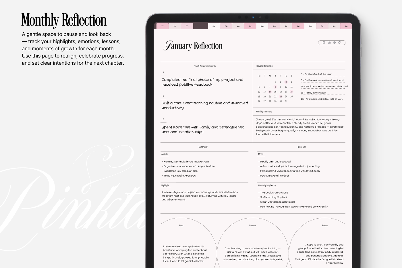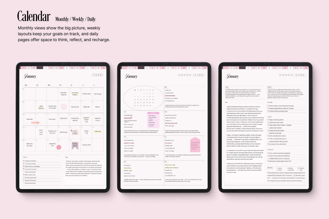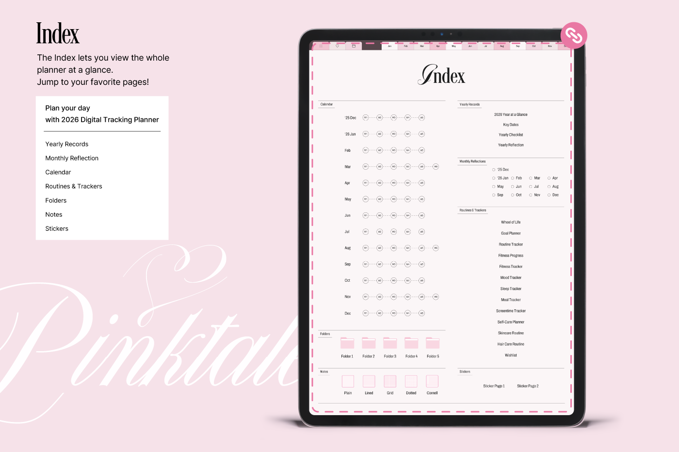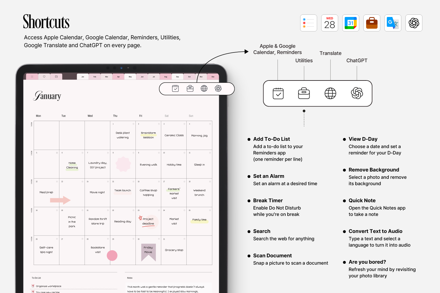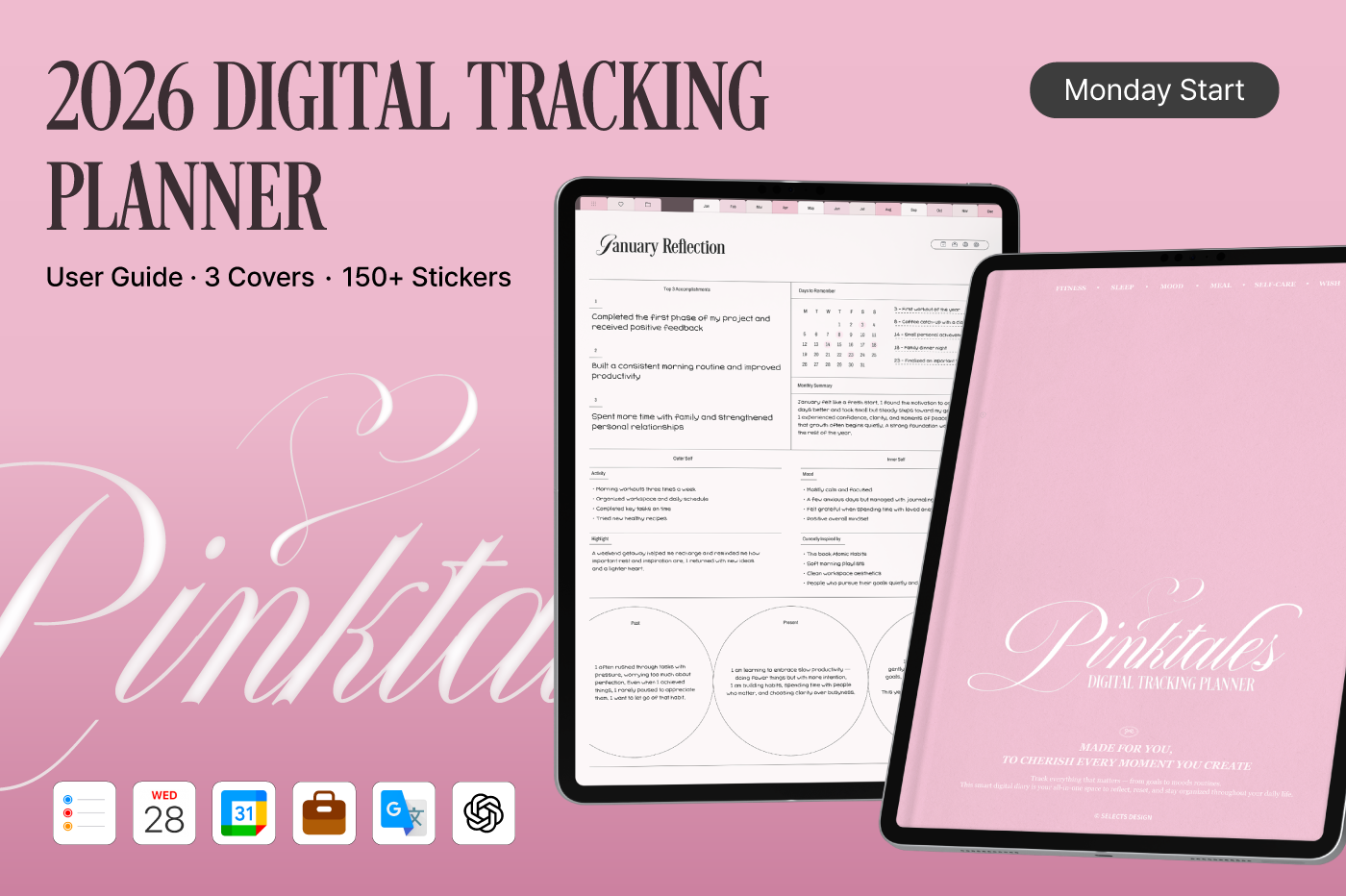 [Page Composition] - Hyperlinks - User Guide - Apple & Google Calendar Integration - Shortcuts Integration (Utility, Google Translate, ChatGPT) - Dec '25 Included - Covers (3) - Yearly / Monthly / Weekly / Daily Plans - Monthly Records & Reflections - Routines & Trackers (13 types) - Note Binders (5) - Notes (5 types) - 150+ Stickers