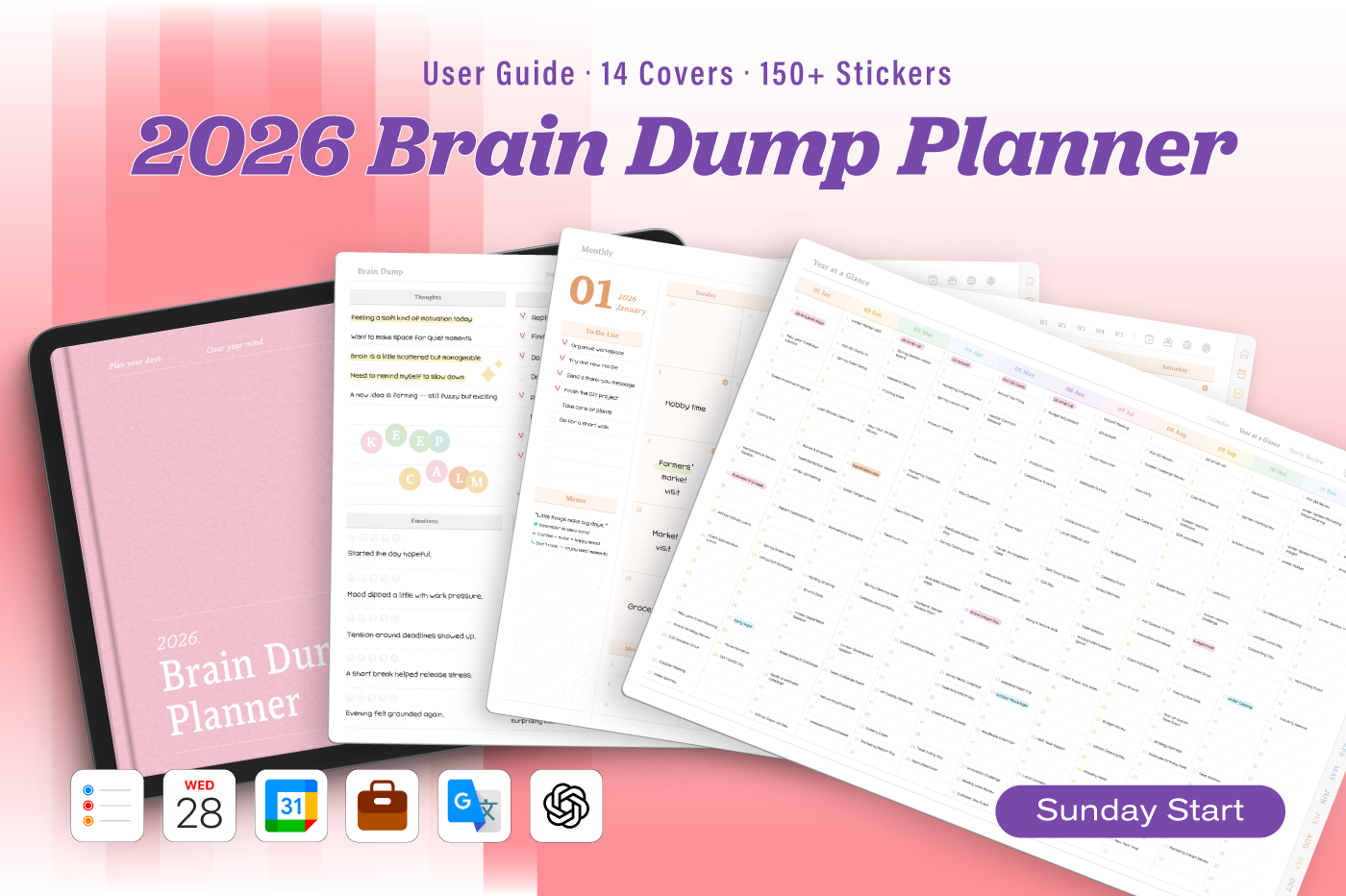 [Page Composition] - Hyperlinks - User Guide - Apple & Google Calendar Integration - Shortcuts Integration (Utility, Google Translate, ChatGPT) - Dec '25 Included - Covers (14) - Yearly / Monthly / Weekly / Daily Plans - Brain Dump (8 types) - Lifestyle (8 types) - Note Binders (7) - Notes (7 types) - 150+ Stickers