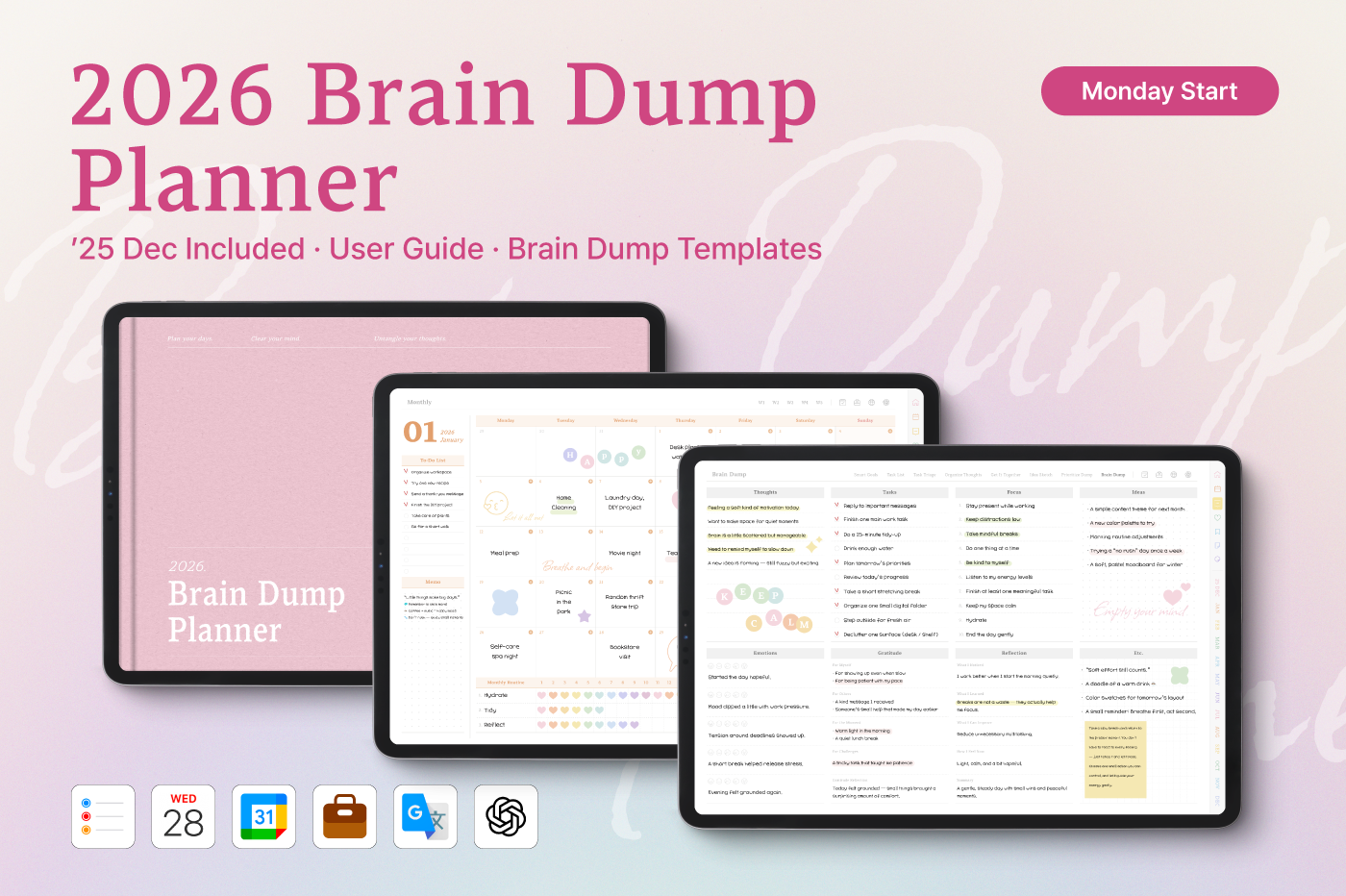 [Page Composition] - Hyperlinks - User Guide - Apple & Google Calendar Integration - Shortcuts Integration (Utility, Google Translate, ChatGPT) - Dec '25 Included - Covers (14) - Yearly / Monthly / Weekly / Daily Plans - Brain Dump (8 types) - Lifestyle (8 types) - Note Binders (7) - Notes (7 types) - 150+ Stickers