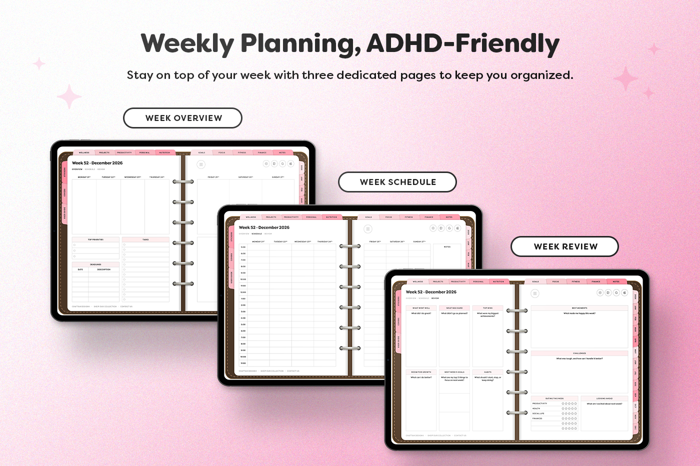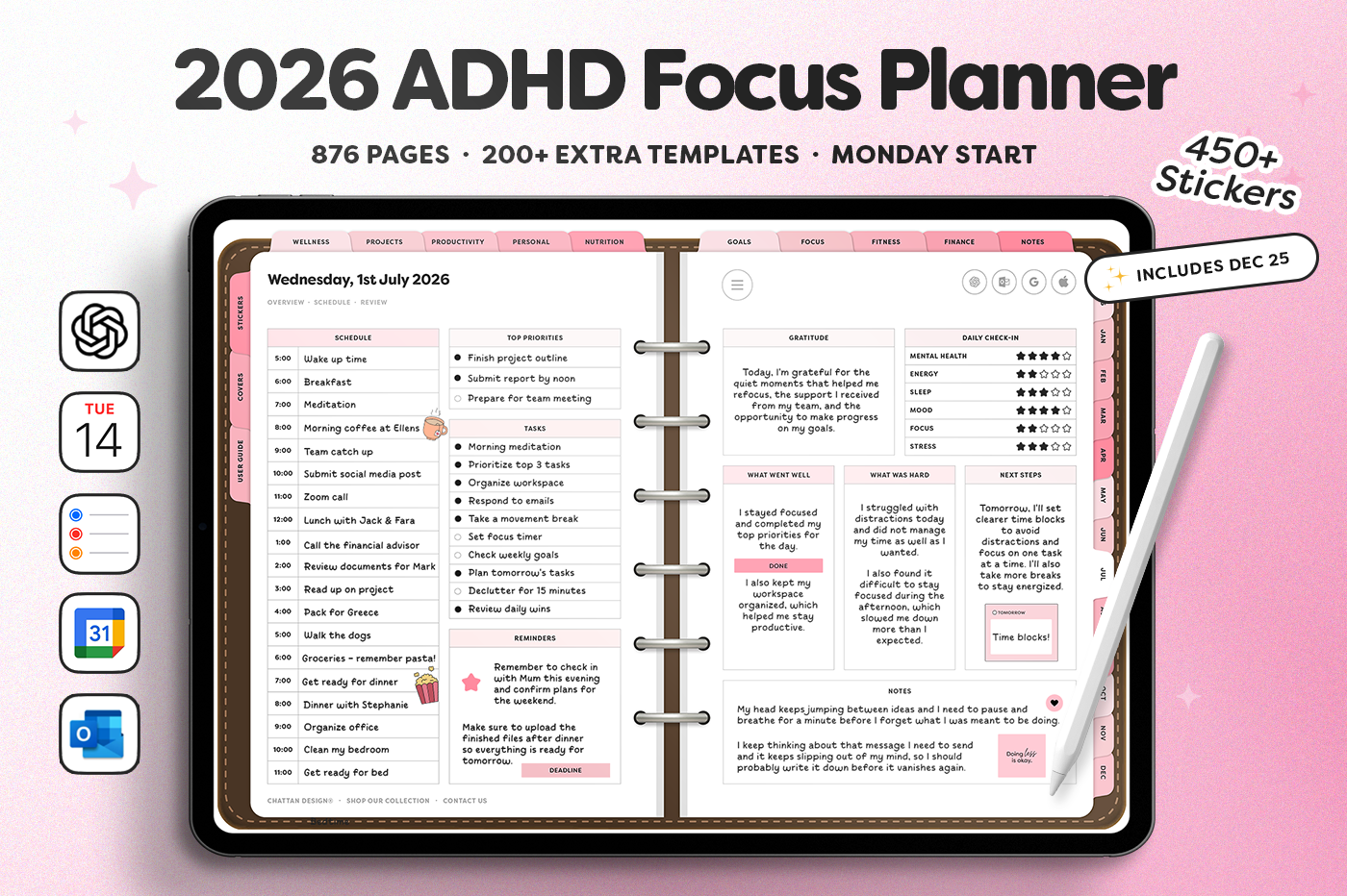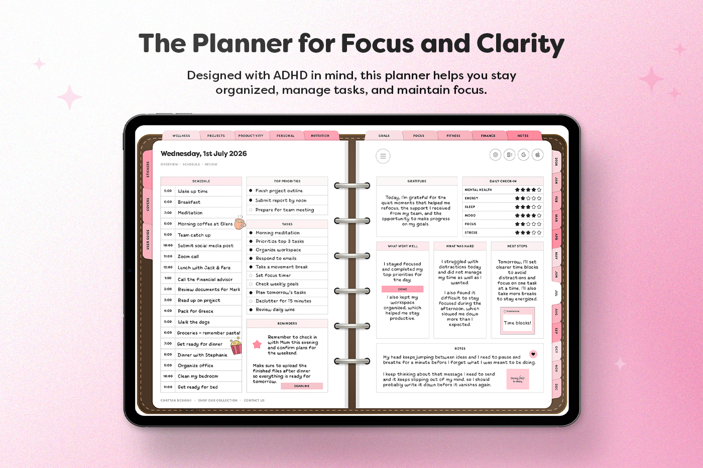 The 2026 ADHD Focus Planner builds on the version that Goodnotes named the best planner for 2025 and gives you a simple way to stay on track without feeling boxed in. Each page is designed to help you organise your day in a way that feels natural, with space for planning, tracking habits, managing tasks, and keeping your thoughts in one place. You get flexible layouts for both busy days and quiet ones, along with digital stickers that make planning feel light and enjoyable. This planner supports the way your attention moves and keeps everything clear, calm, and easy to return to.