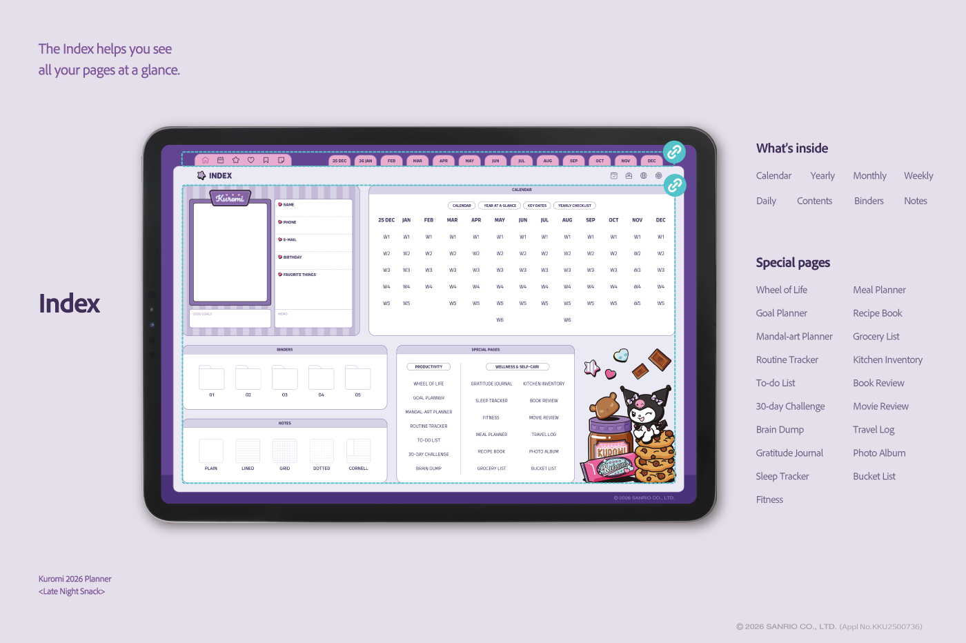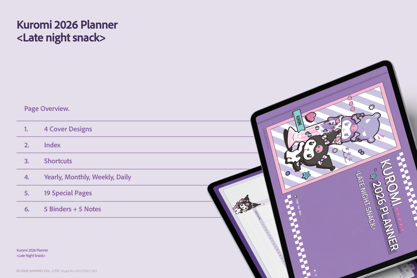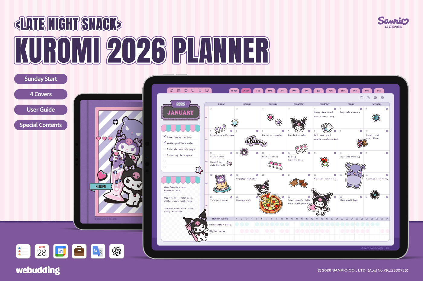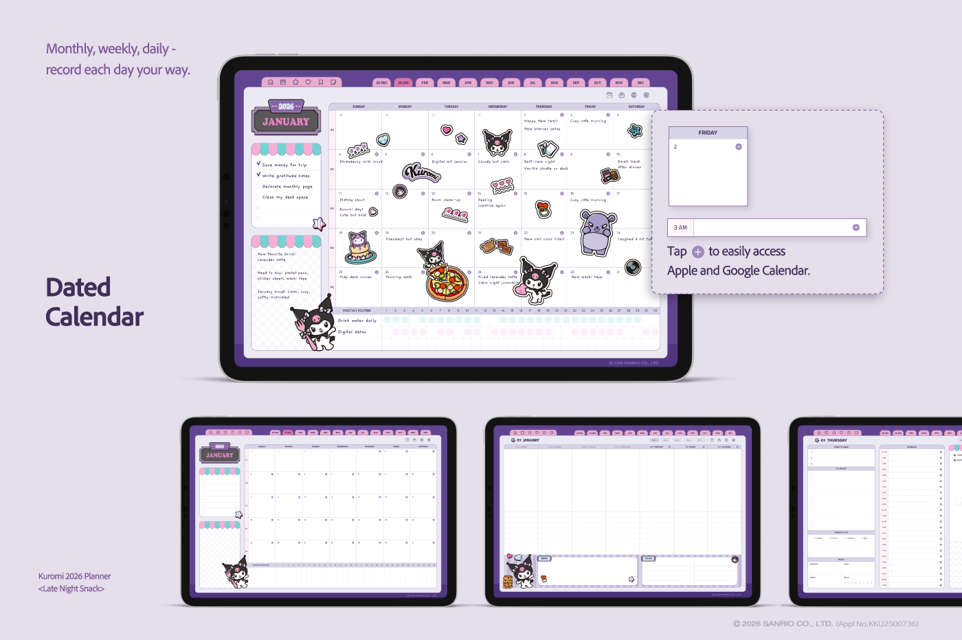 ** This free preview contains select pages with watermarks. To unlock the complete digital stationery without watermarks, use the download link found within the preview file.** This product is for personal use only. Any unlawful use of the content may results in revoke of access. [Page Composition] - Sunday Start - Apple & Google Calendar Integration (Apple devices only) - Shortcuts Integration (Calendar, Utility, Translate, ChatGPT) - Hyperlinks - Covers (4) - Calendar - Index - Monthly / Weekly / Daily Plans - Productivity (7 Types) - Wellness & Self-Care (12 Types) - Binders (5) - Notes (5 Types) This product is permitted to a License agreement between Sanrio Korea Co., Ltd. and Webudding Inc., and unauthorized reproduction of this product and its characters is prohibited.