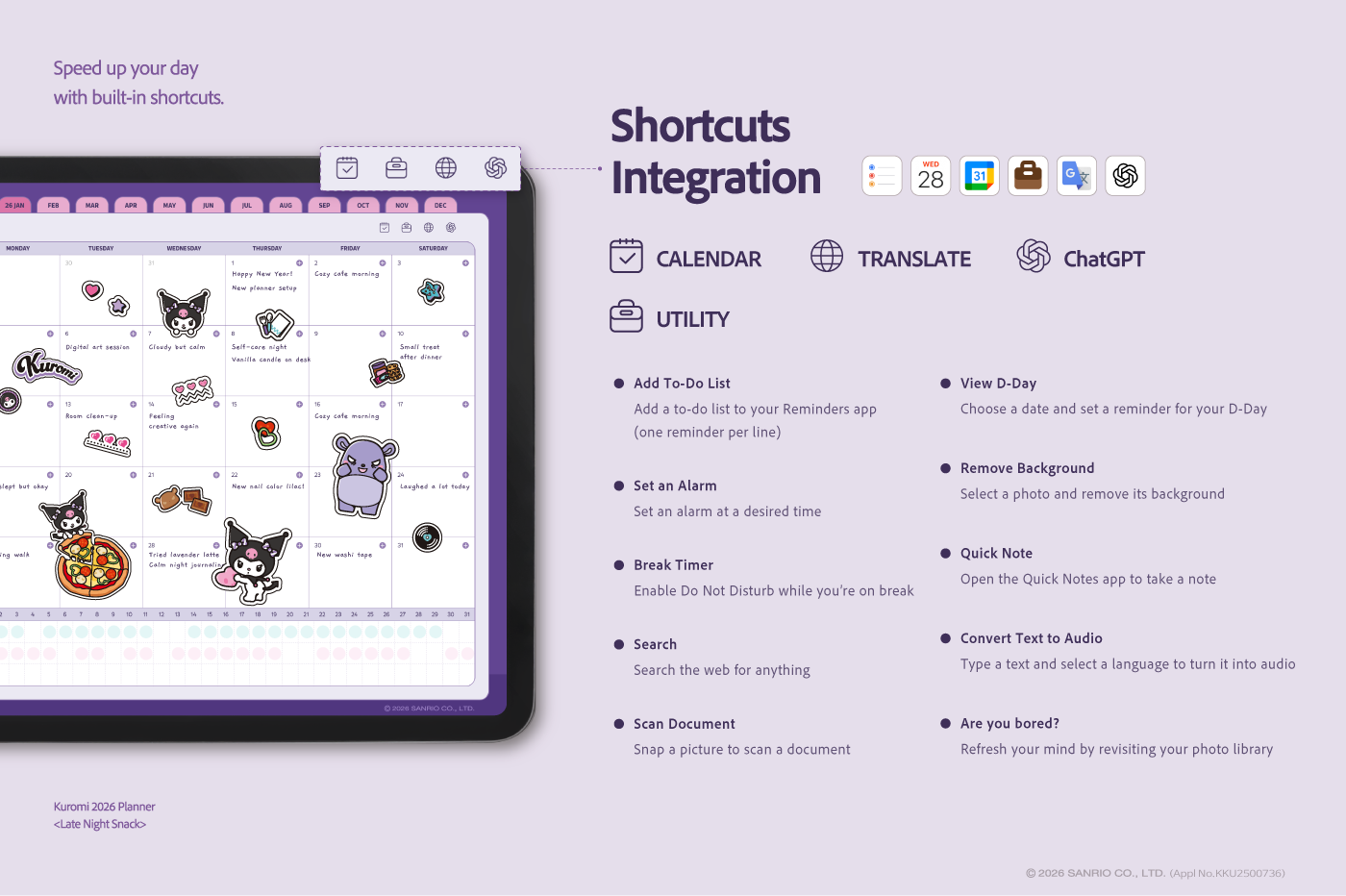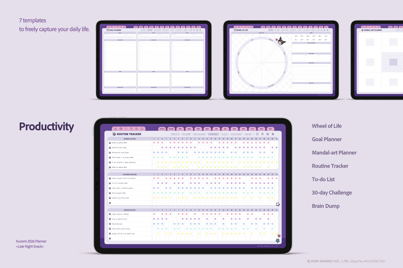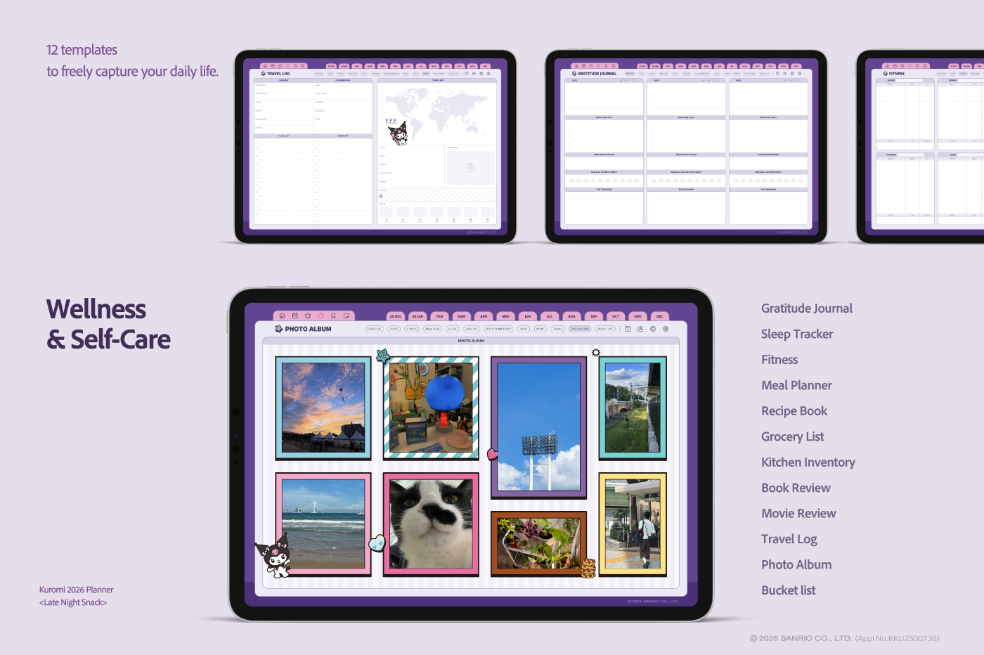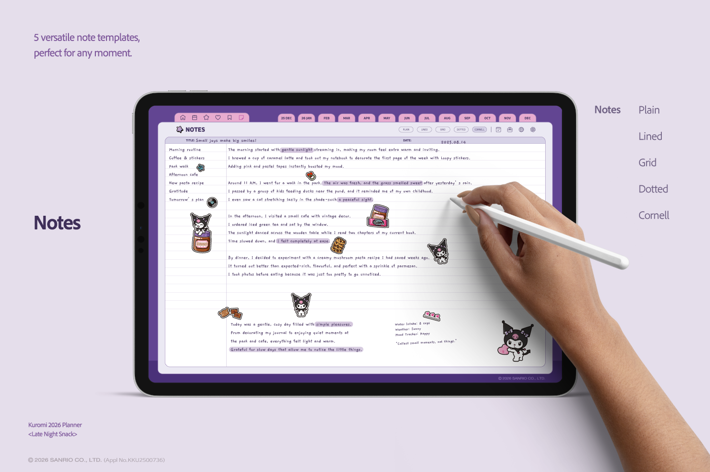 ** This free preview contains select pages with watermarks. To unlock the complete digital stationery without watermarks, use the download link found within the preview file.** This product is for personal use only. Any unlawful use of the content may results in revoke of access. [Page Composition] - Sunday Start - Apple & Google Calendar Integration (Apple devices only) - Shortcuts Integration (Calendar, Utility, Translate, ChatGPT) - Hyperlinks - Covers (4) - Calendar - Index - Monthly / Weekly / Daily Plans - Productivity (7 Types) - Wellness & Self-Care (12 Types) - Binders (5) - Notes (5 Types) This product is permitted to a License agreement between Sanrio Korea Co., Ltd. and Webudding Inc., and unauthorized reproduction of this product and its characters is prohibited.