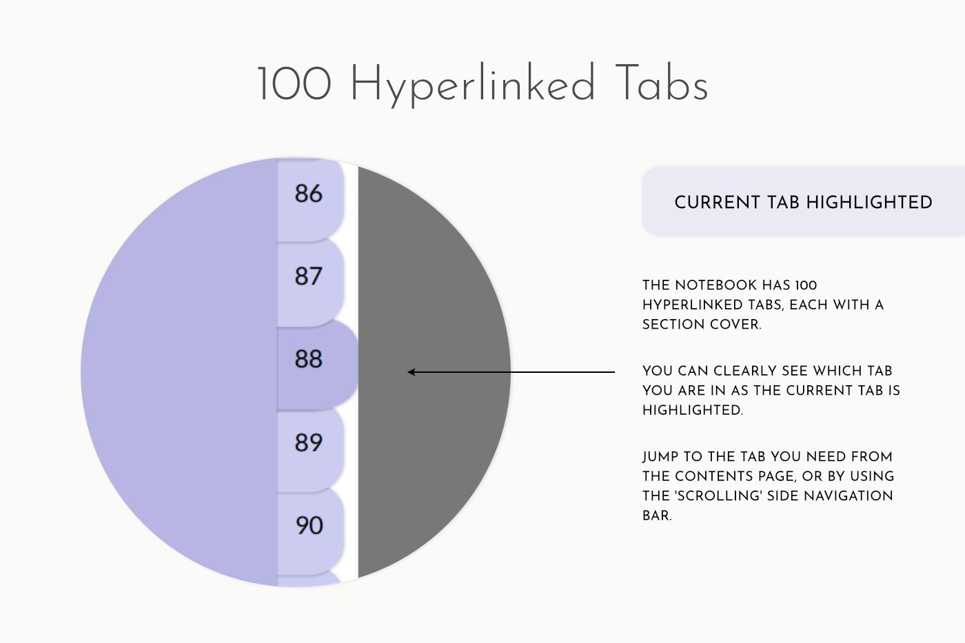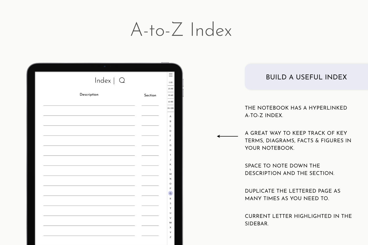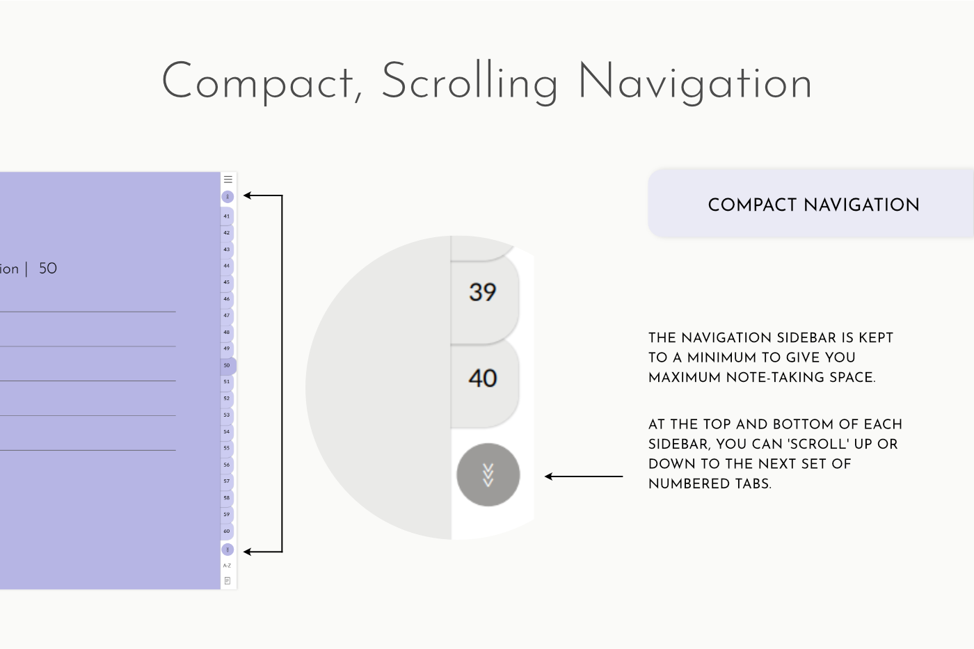 * Scrolling, compact navigation, maximum note-taking space . * Clean, spacious portrait layout gives you plenty of room to write, draw and create. * 100 hyperlinked tabs for big projects or complex subjects. * A-to-Z index keeps your notes organised and quickly find diagrams, facts & figures.