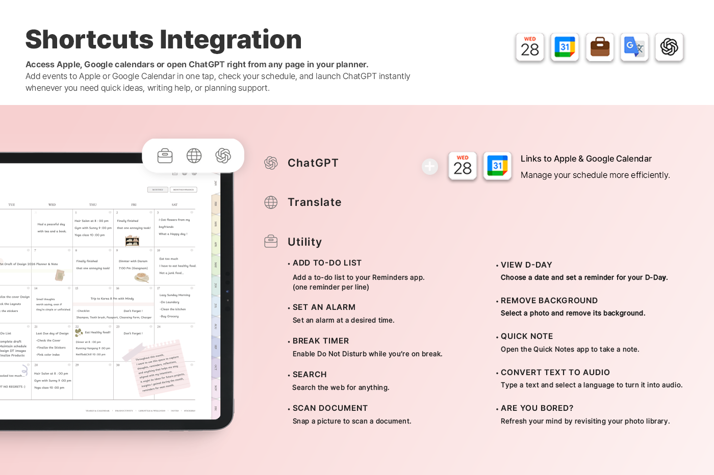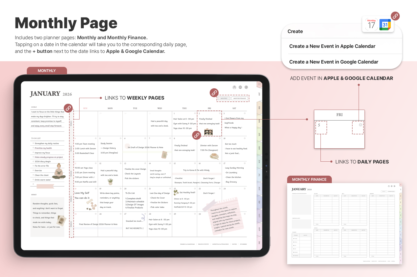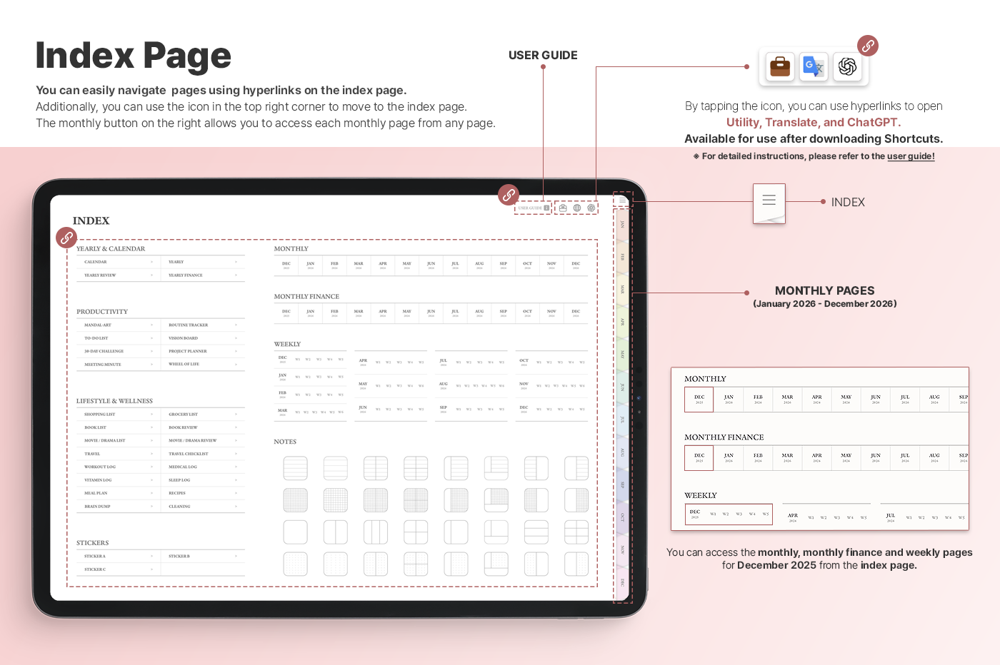 A planner with a simple, intuitive layout that makes it easy to manage goals, schedules, and tasks. [Page Composition] - Hyperlinks - User Guide - Apple & Google Calendar Integration - Shortcuts Integration (Utility, Google Translate, ChatGPT) - Dec '25 Included - Covers (5) - Yearly / Monthly / Weekly / Daily - Monthly Finance - Productivity (8 types) - Lifestyle & Wellness (16 types) - Notes (32 types) - 100+ Stickers