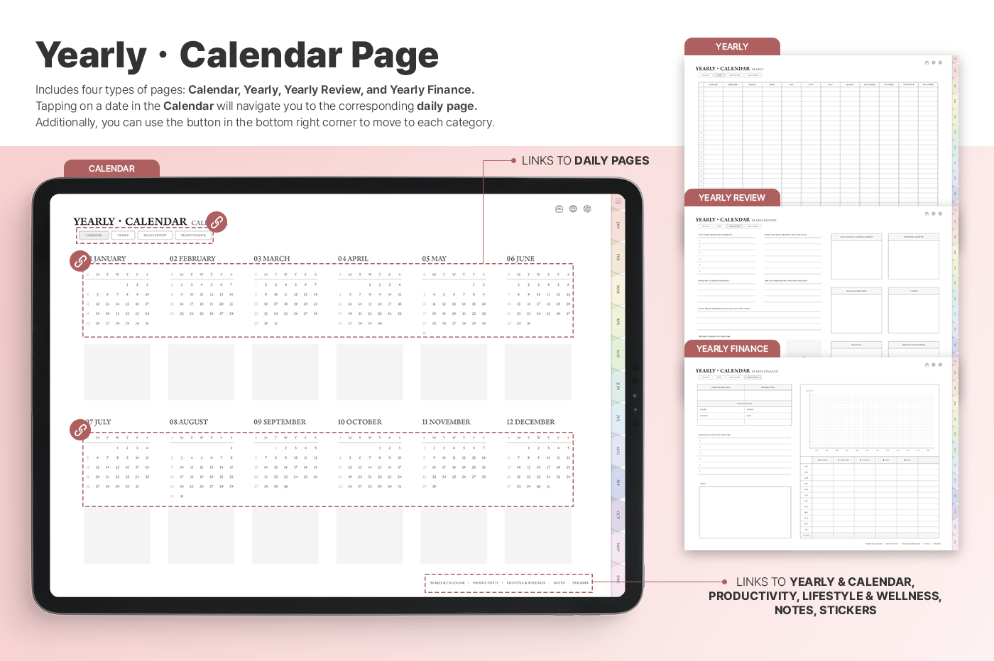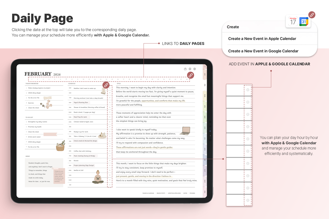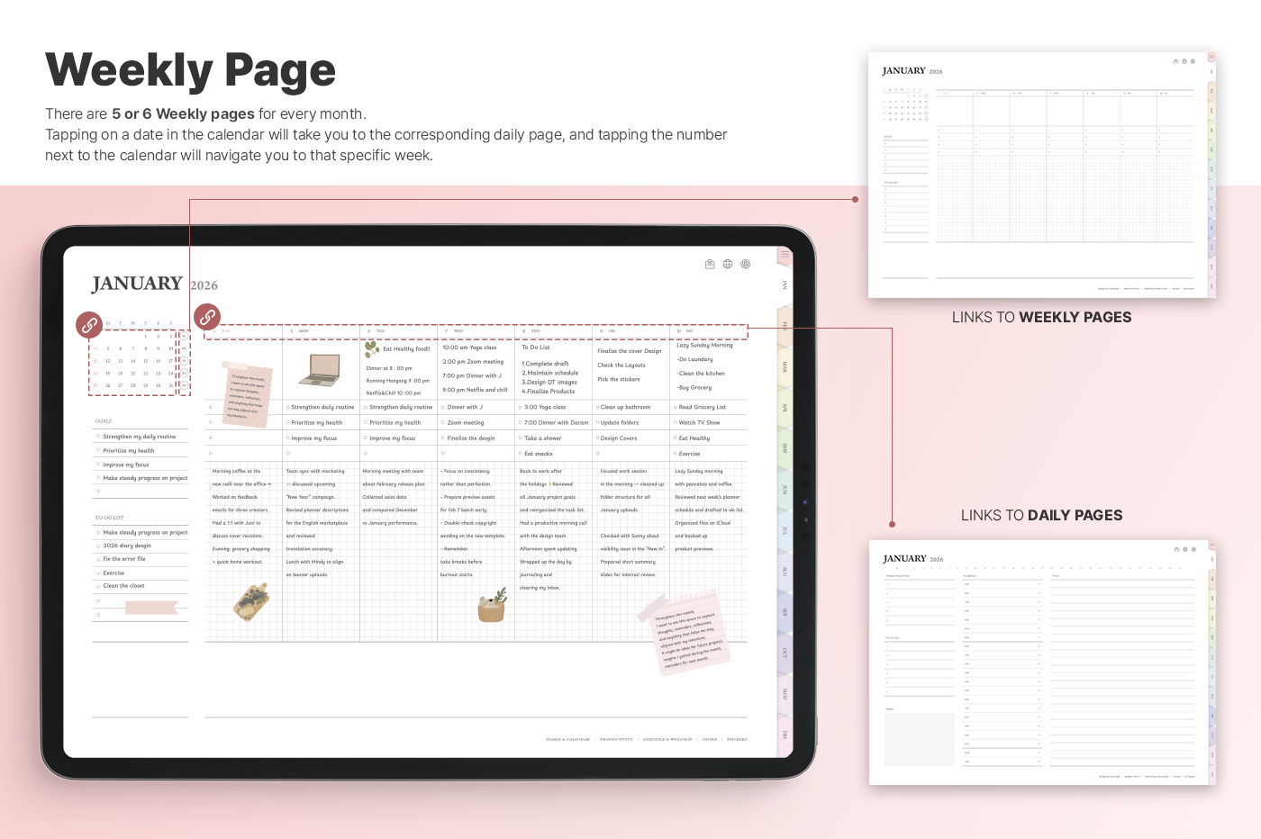 A planner with a simple, intuitive layout that makes it easy to manage goals, schedules, and tasks. [Page Composition] - Hyperlinks - User Guide - Apple & Google Calendar Integration - Shortcuts Integration (Utility, Google Translate, ChatGPT) - Dec '25 Included - Covers (5) - Yearly / Monthly / Weekly / Daily - Monthly Finance - Productivity (8 types) - Lifestyle & Wellness (16 types) - Notes (32 types) - 100+ Stickers