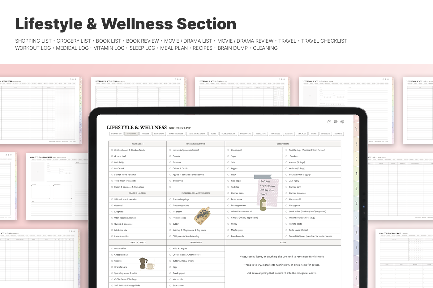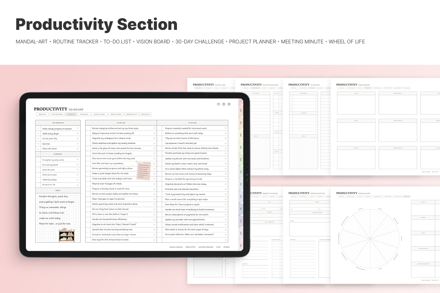 Stay organized and detailed in your daily life with 24 productivity and lifestyle template pages.