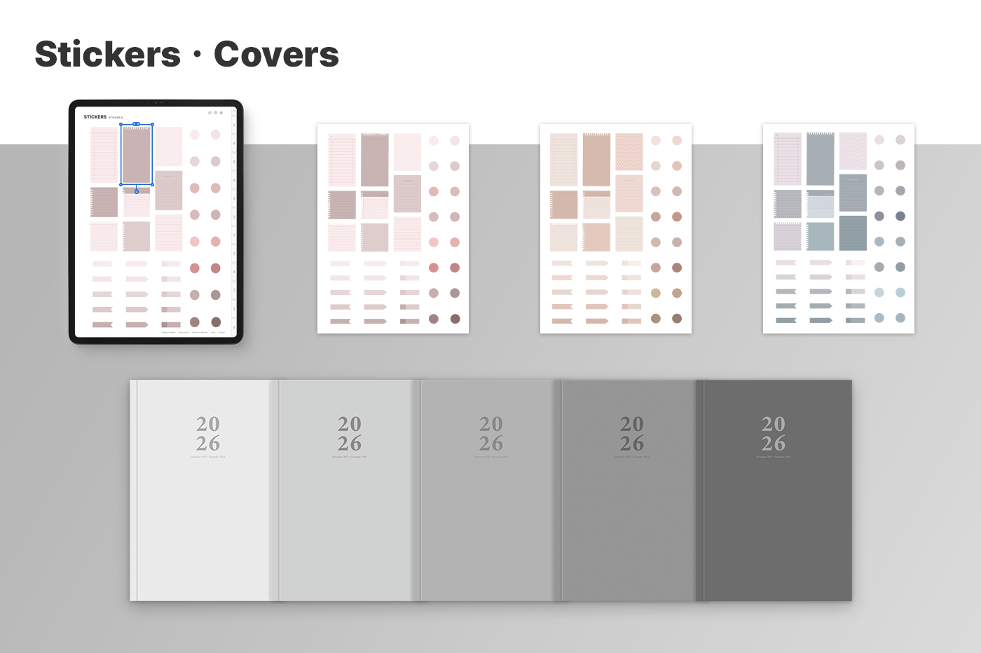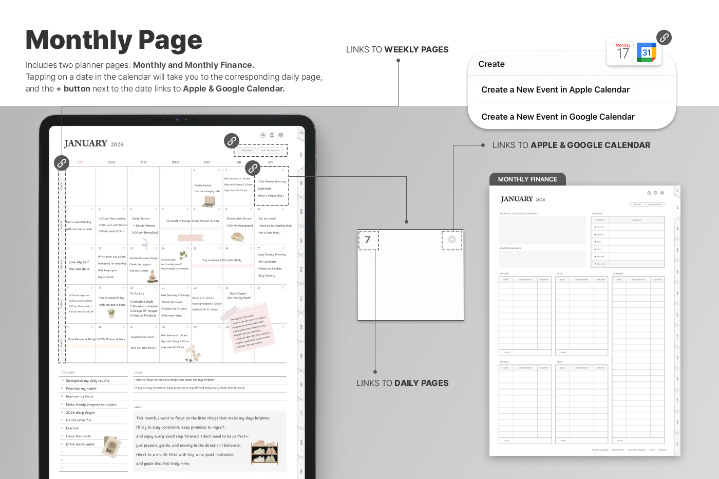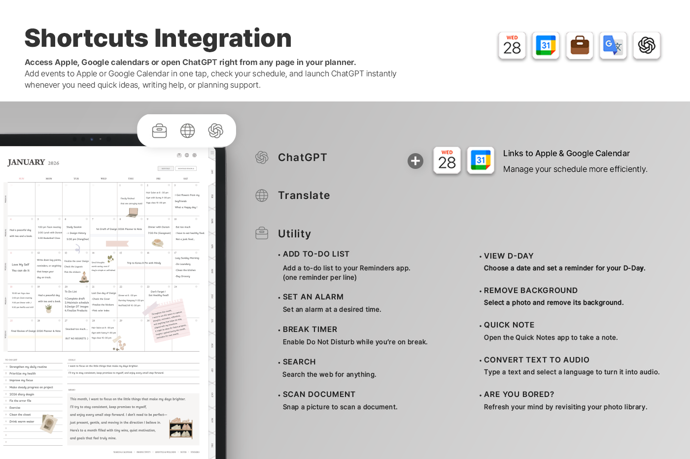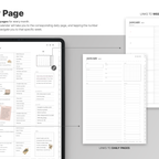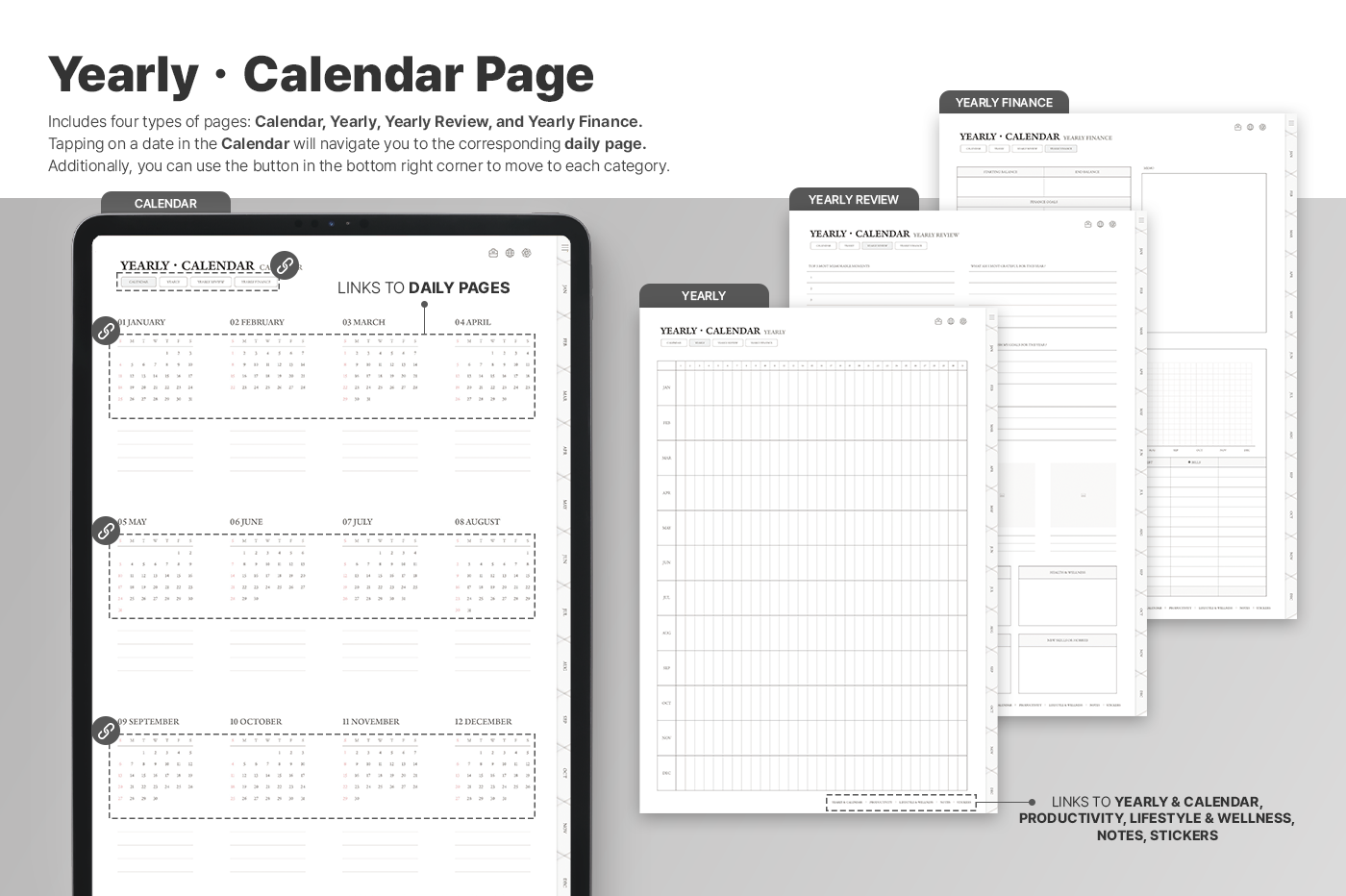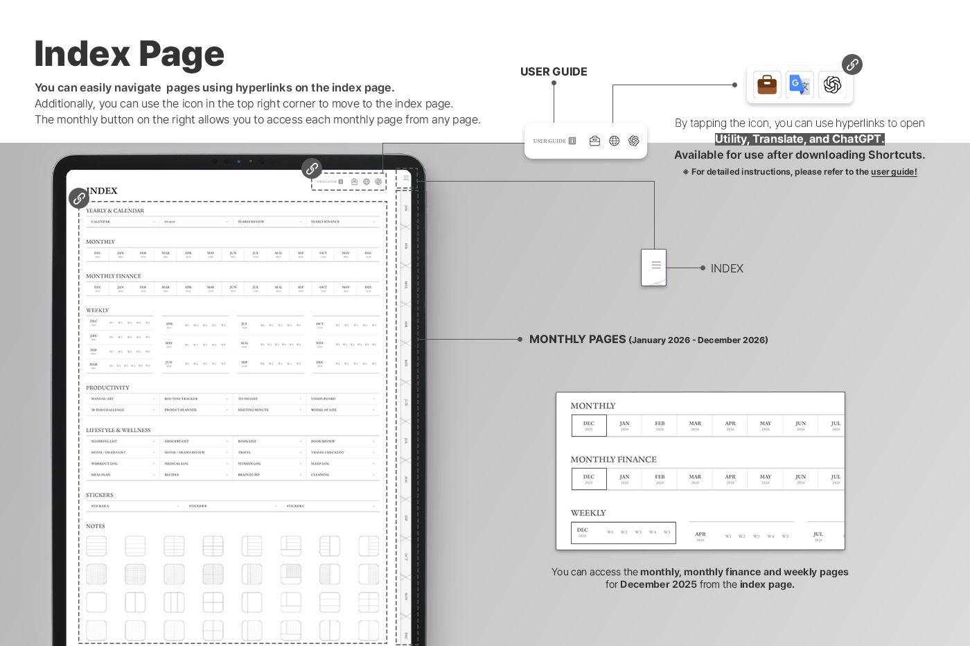 A planner with a simple, intuitive layout that makes it easy to manage goals, schedules, and tasks. [Page Composition] - Hyperlinks - User Guide - Apple & Google Calendar Integration - Shortcuts Integration (Utility, Google Translate, ChatGPT) - Dec '25 Included - Covers (5) - Yearly / Monthly / Weekly / Daily - Monthly Finance - Productivity (8 types) - Lifestyle & Wellness (16 types) - Notes (32 types) - 100+ Stickers