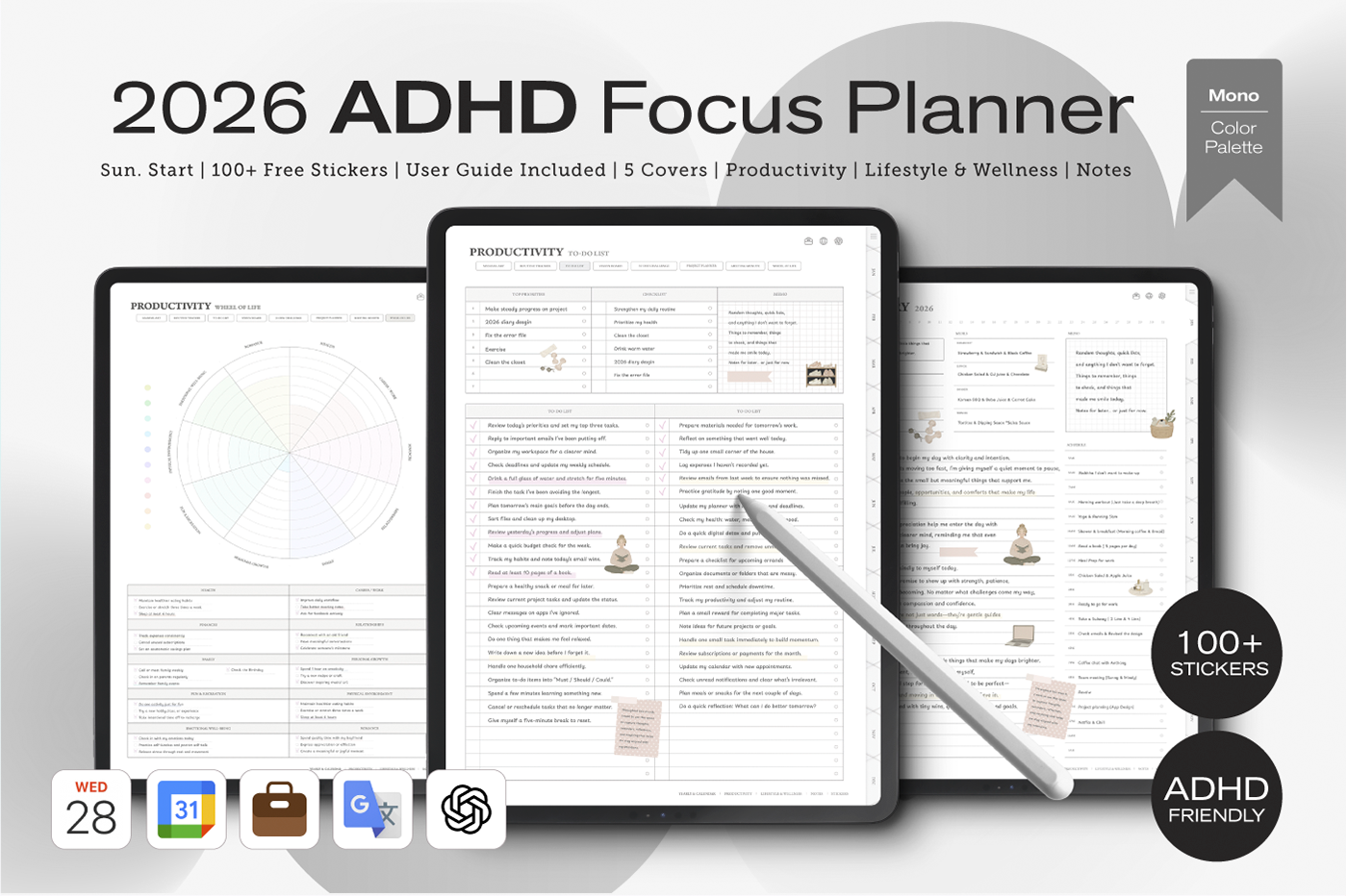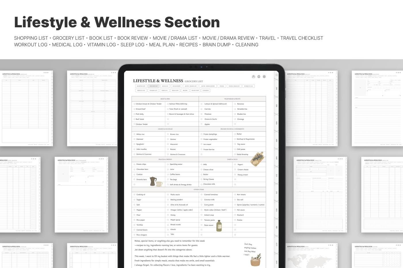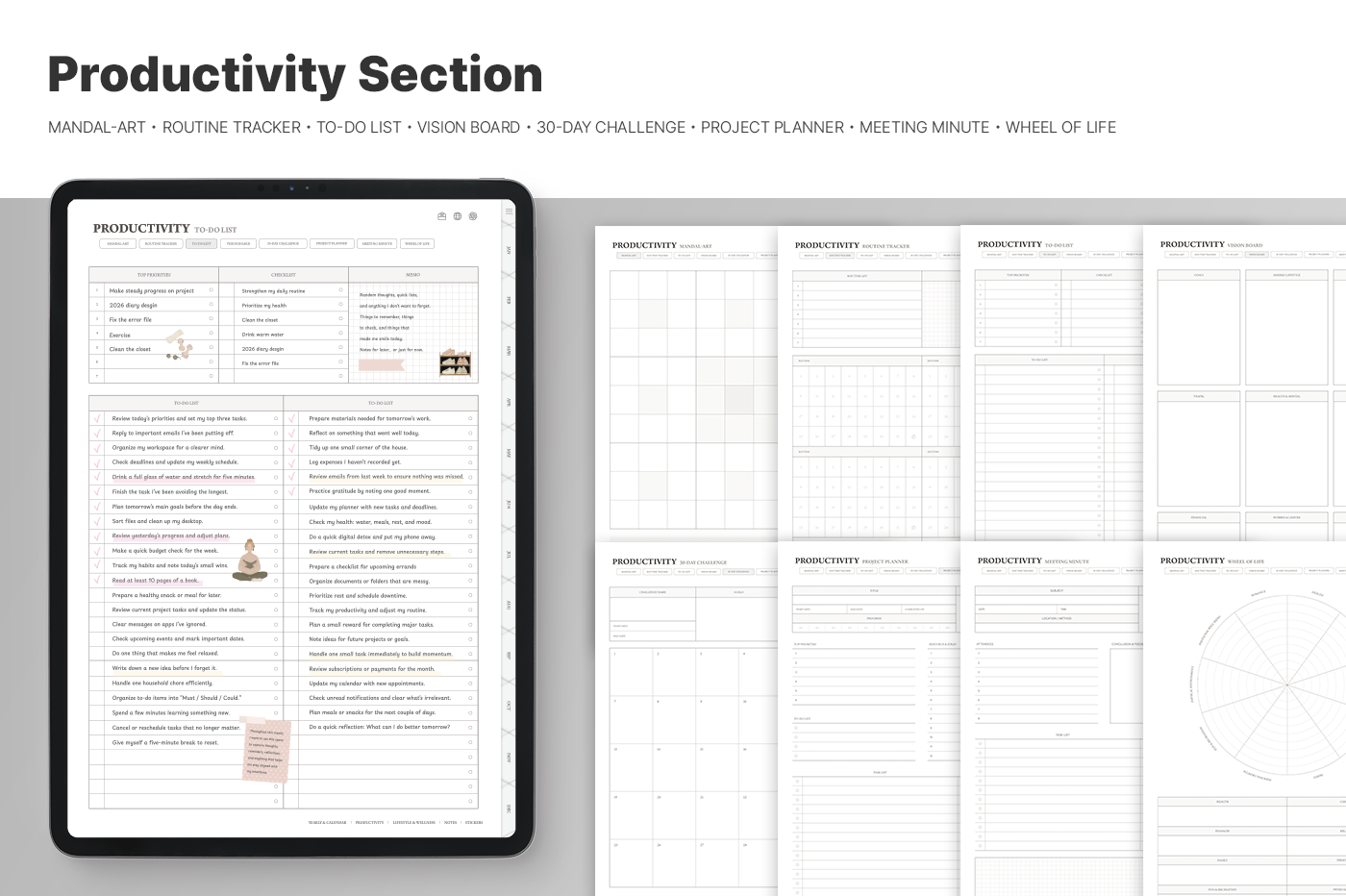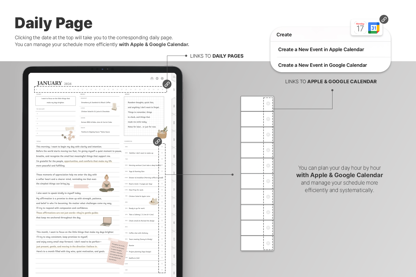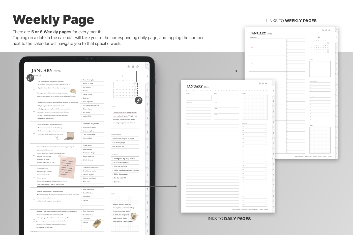 A planner with a simple, intuitive layout that makes it easy to manage goals, schedules, and tasks. [Page Composition] - Hyperlinks - User Guide - Apple & Google Calendar Integration - Shortcuts Integration (Utility, Google Translate, ChatGPT) - Dec '25 Included - Covers (5) - Yearly / Monthly / Weekly / Daily - Monthly Finance - Productivity (8 types) - Lifestyle & Wellness (16 types) - Notes (32 types) - 100+ Stickers
