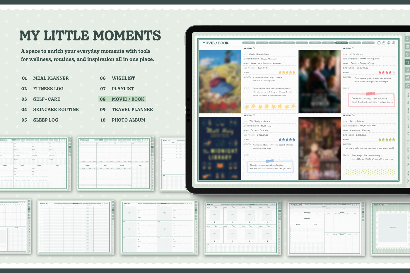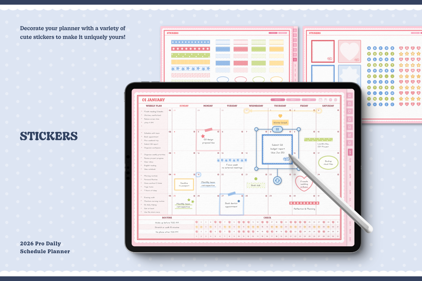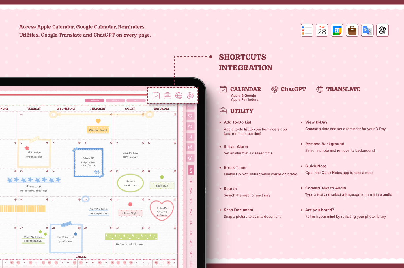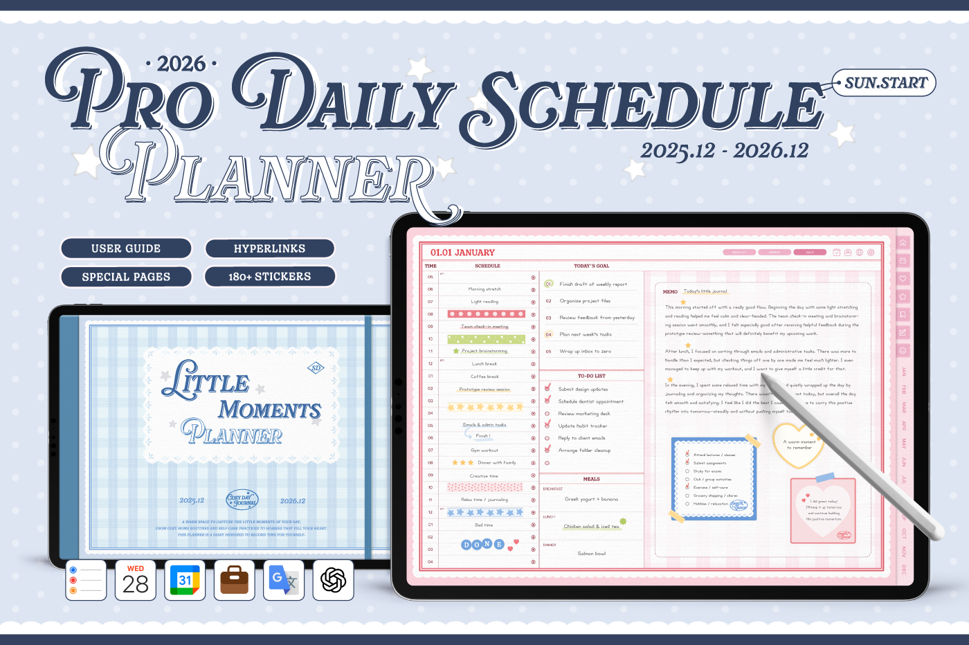 [Page Composition] - Hyperlinks - User Guide - Apple & Google Calendar Integration - Shortcuts Integration (Utility, Google Translate, ChatGPT) - Dec '25 Included - Cover (3) - Yearly / Monthly / Weekly / Daily Plans - Life & Wellness (16 types) - Note Binders (6) - Notes (5 types) - 180+ Stickers