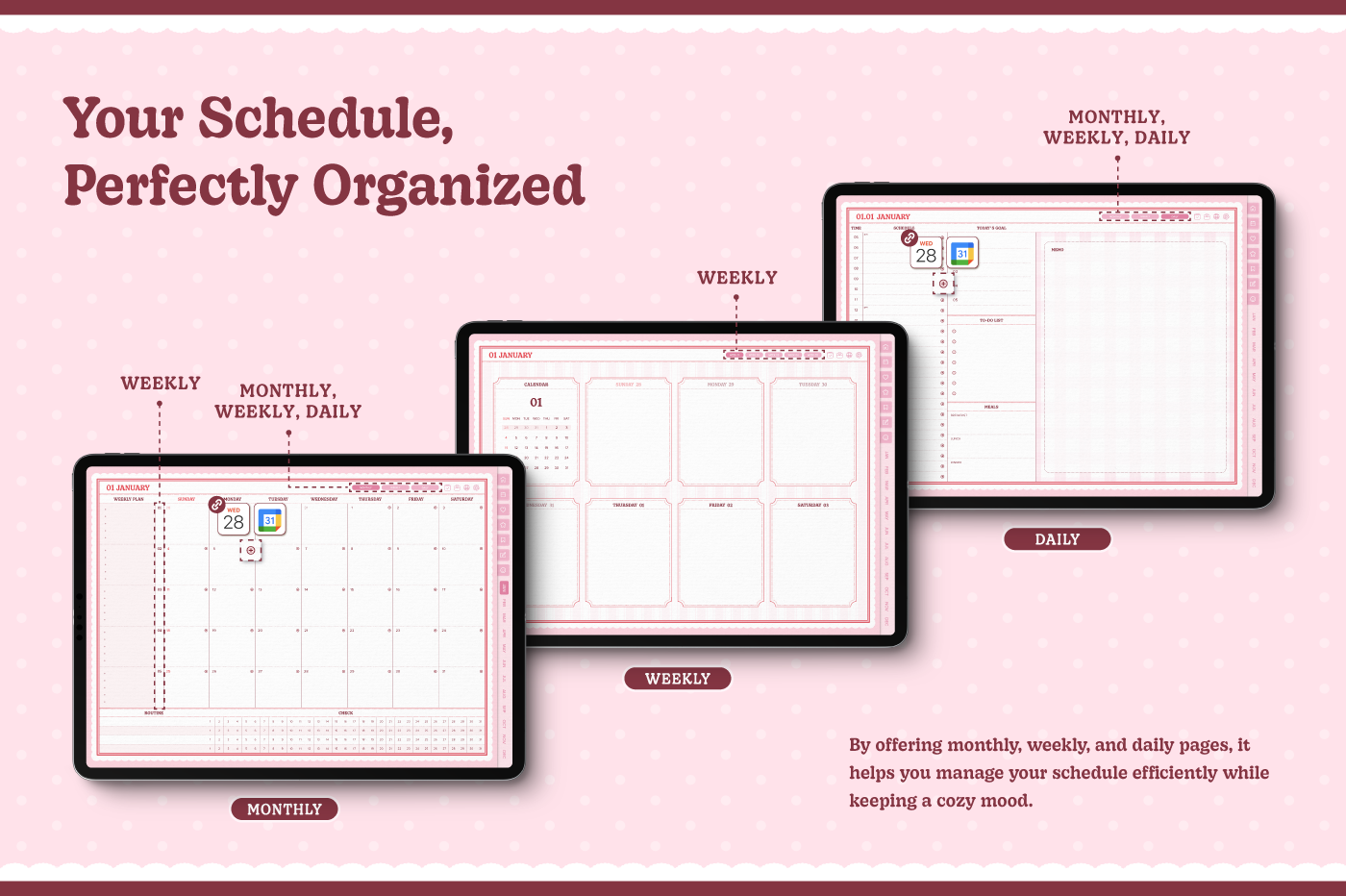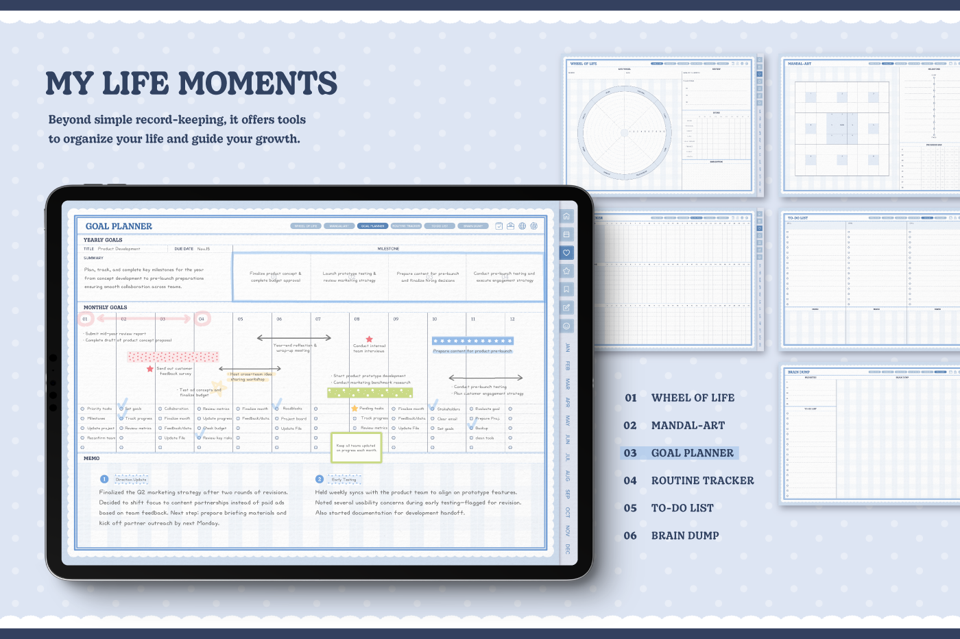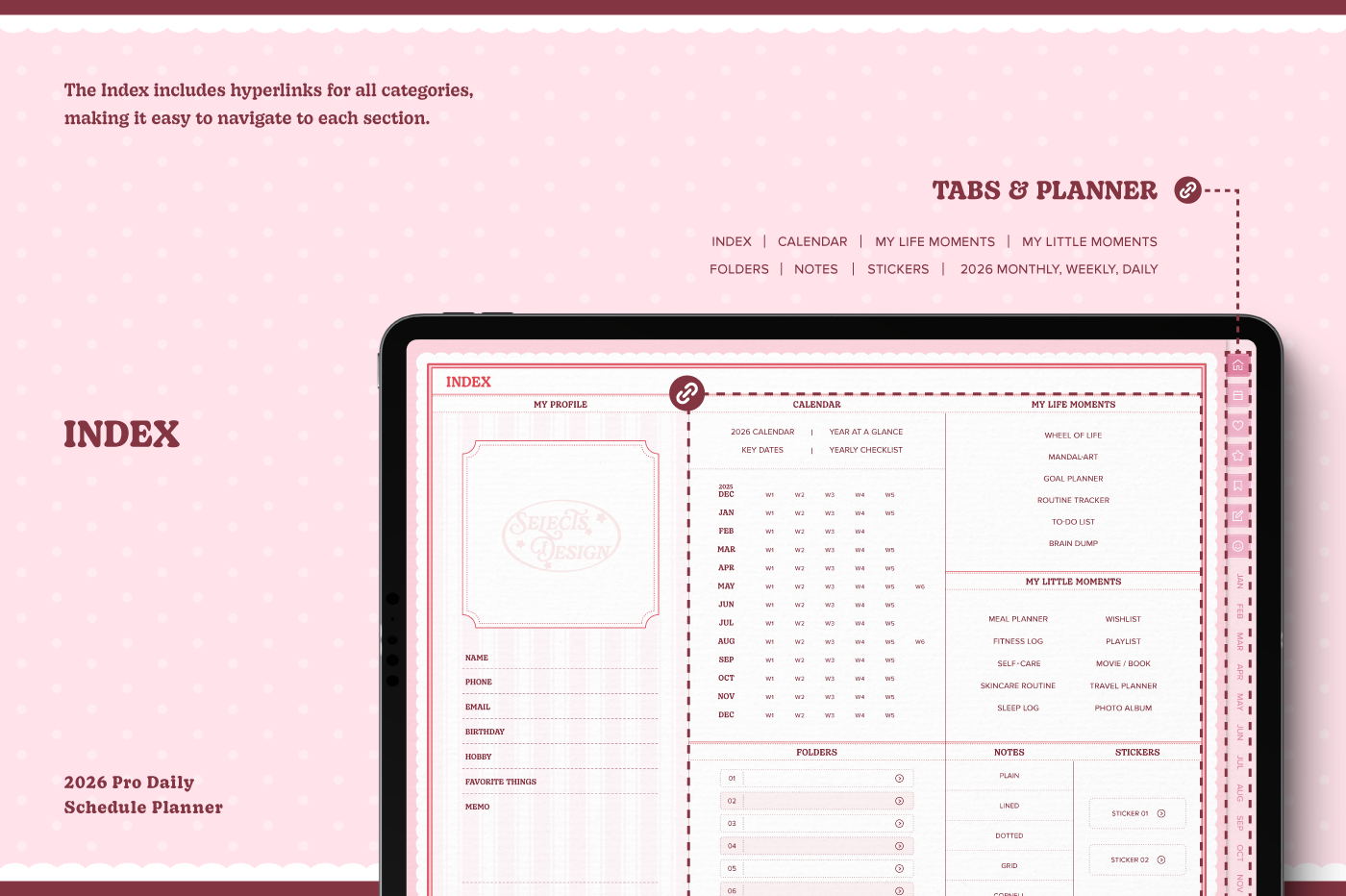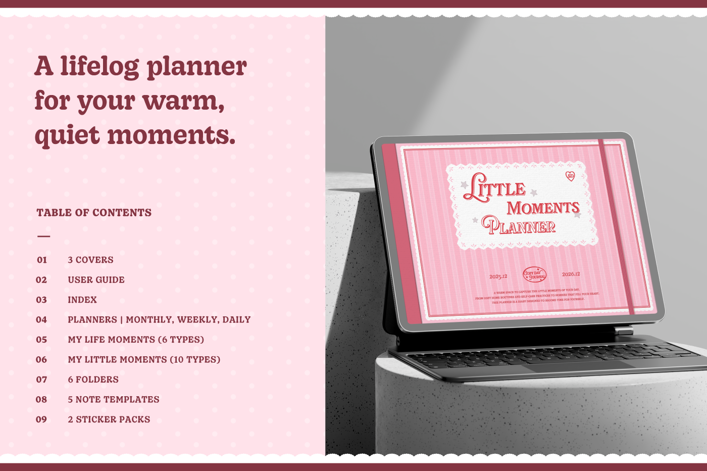 [Page Composition] - Hyperlinks - User Guide - Apple & Google Calendar Integration - Shortcuts Integration (Utility, Google Translate, ChatGPT) - Dec '25 Included - Cover (3) - Yearly / Monthly / Weekly / Daily Plans - Life & Wellness (16 types) - Note Binders (6) - Notes (5 types) - 180+ Stickers