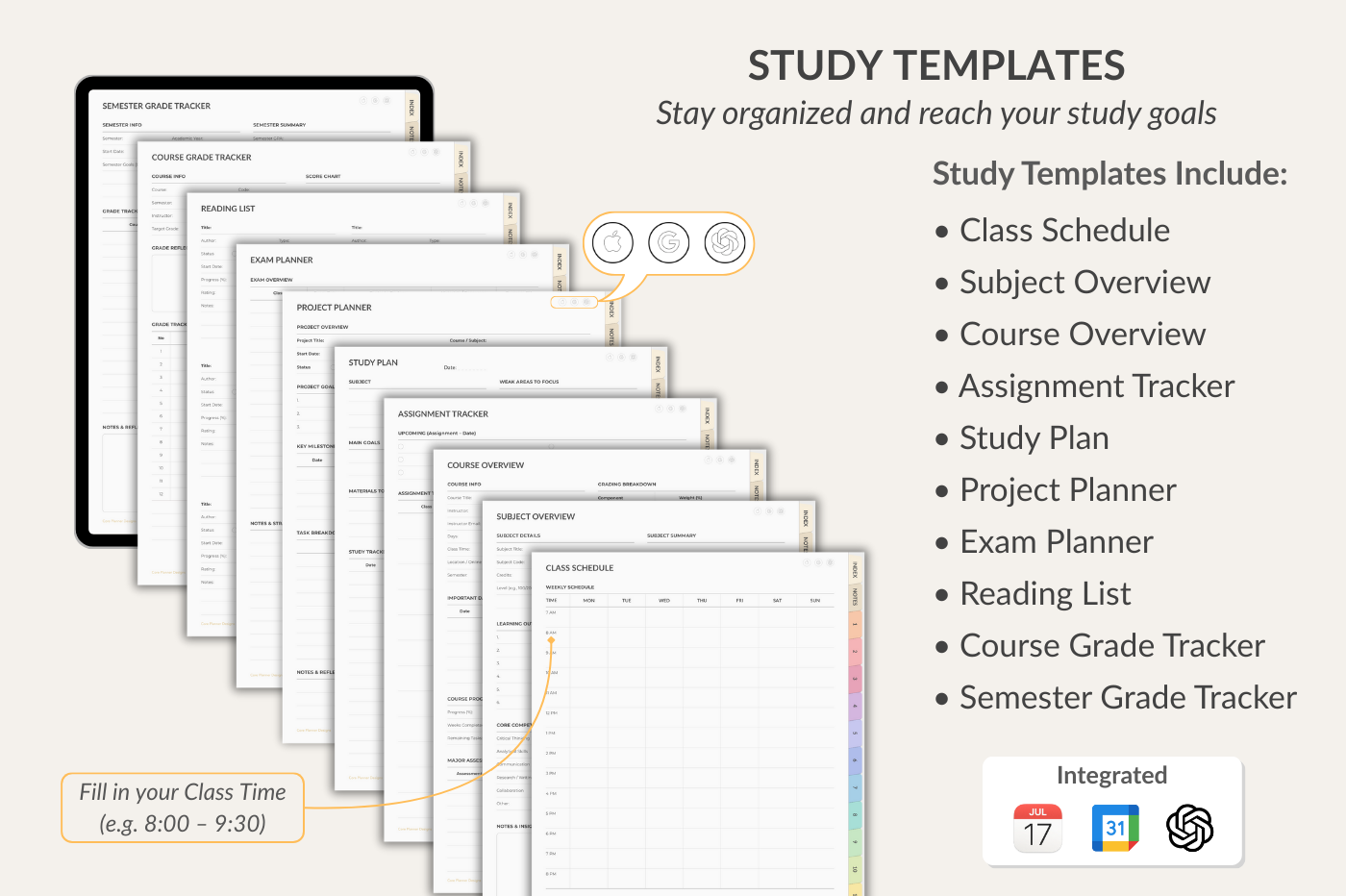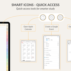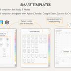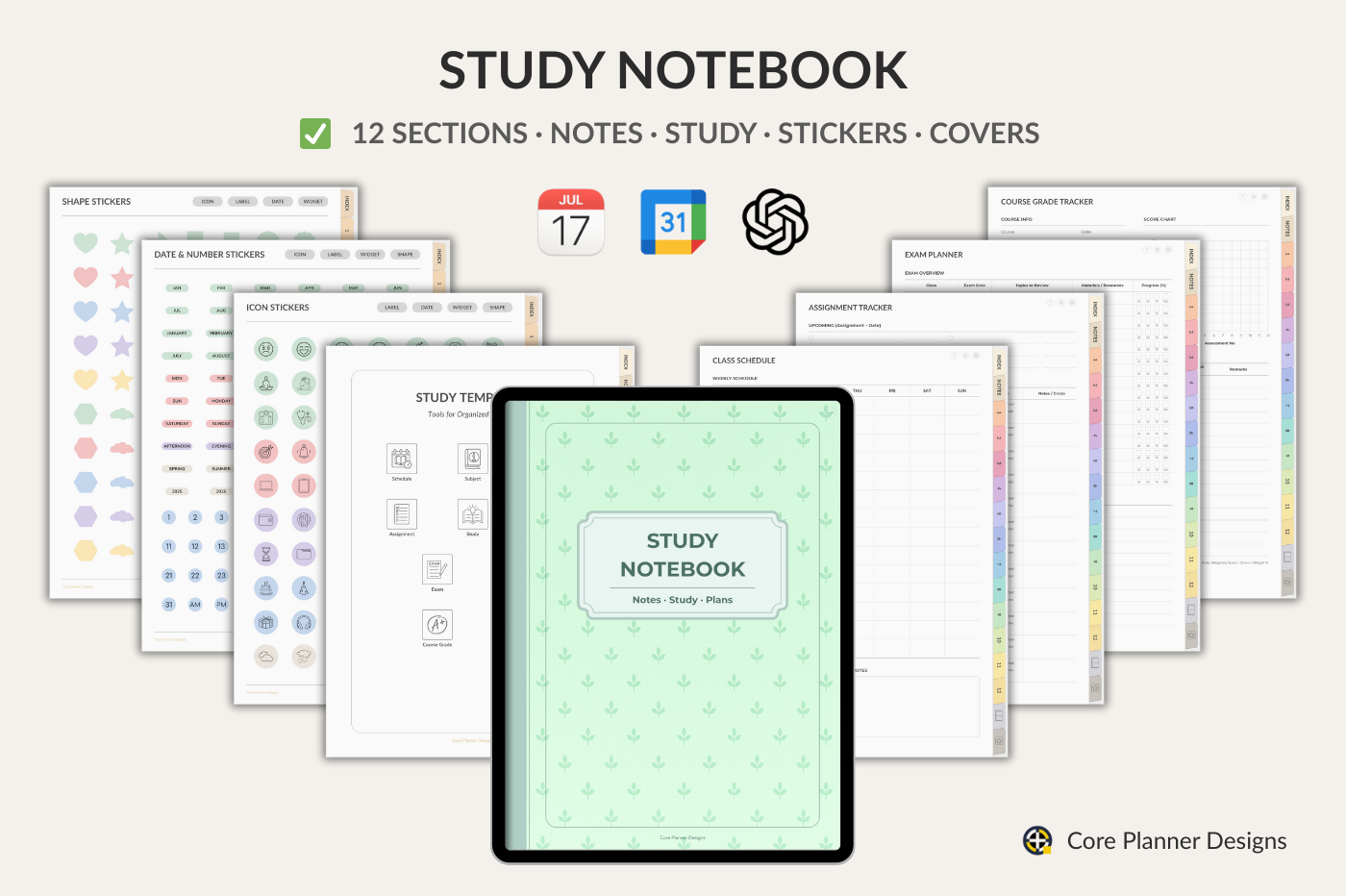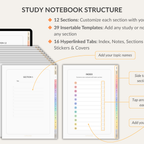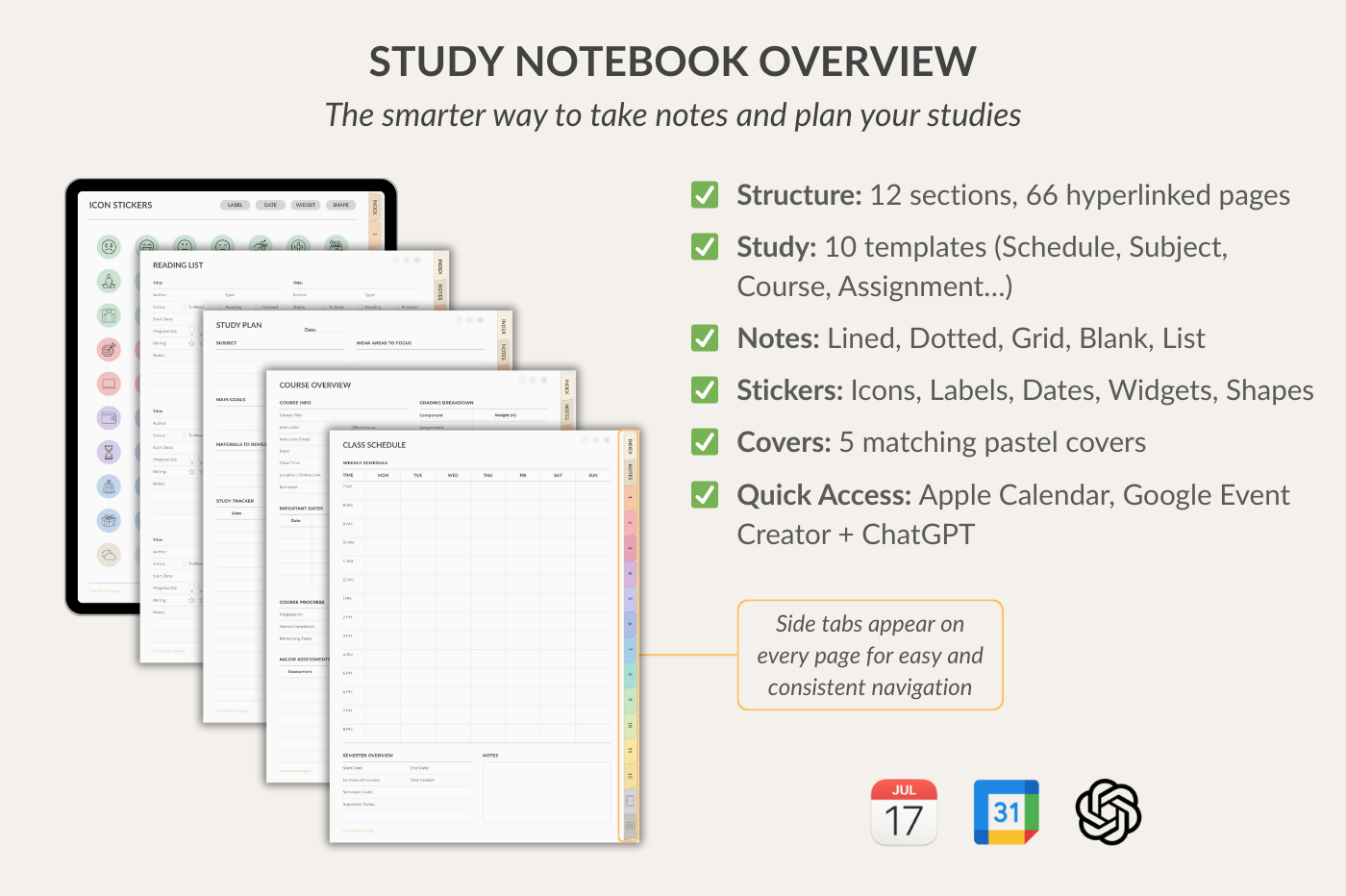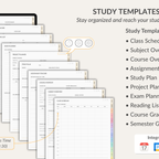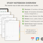Study Notebook for GoodNotes with 12 sections and 39 insertable templates. Includes key study templates: Schedule, Subject, Course Overview, Assignment, Study Plan, Project, Reading, Exam, Course Grade, Semester Grade. Comes with 300+ stickers, 5 covers, and smart links to Apple Calendar, Google Event Creator, and ChatGPT.