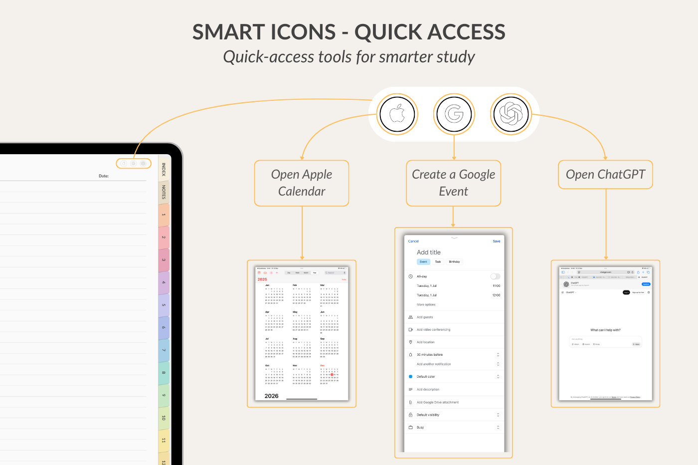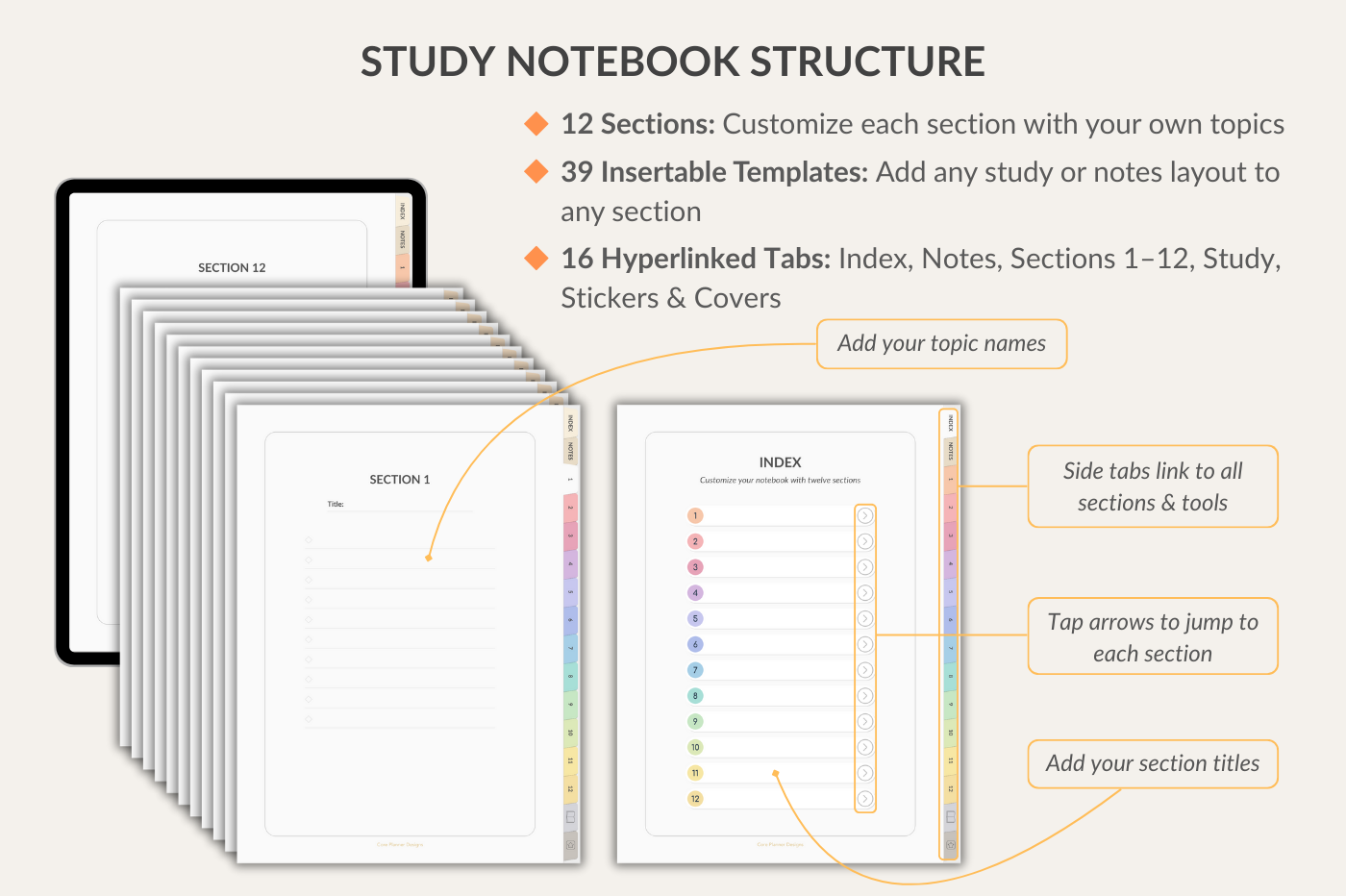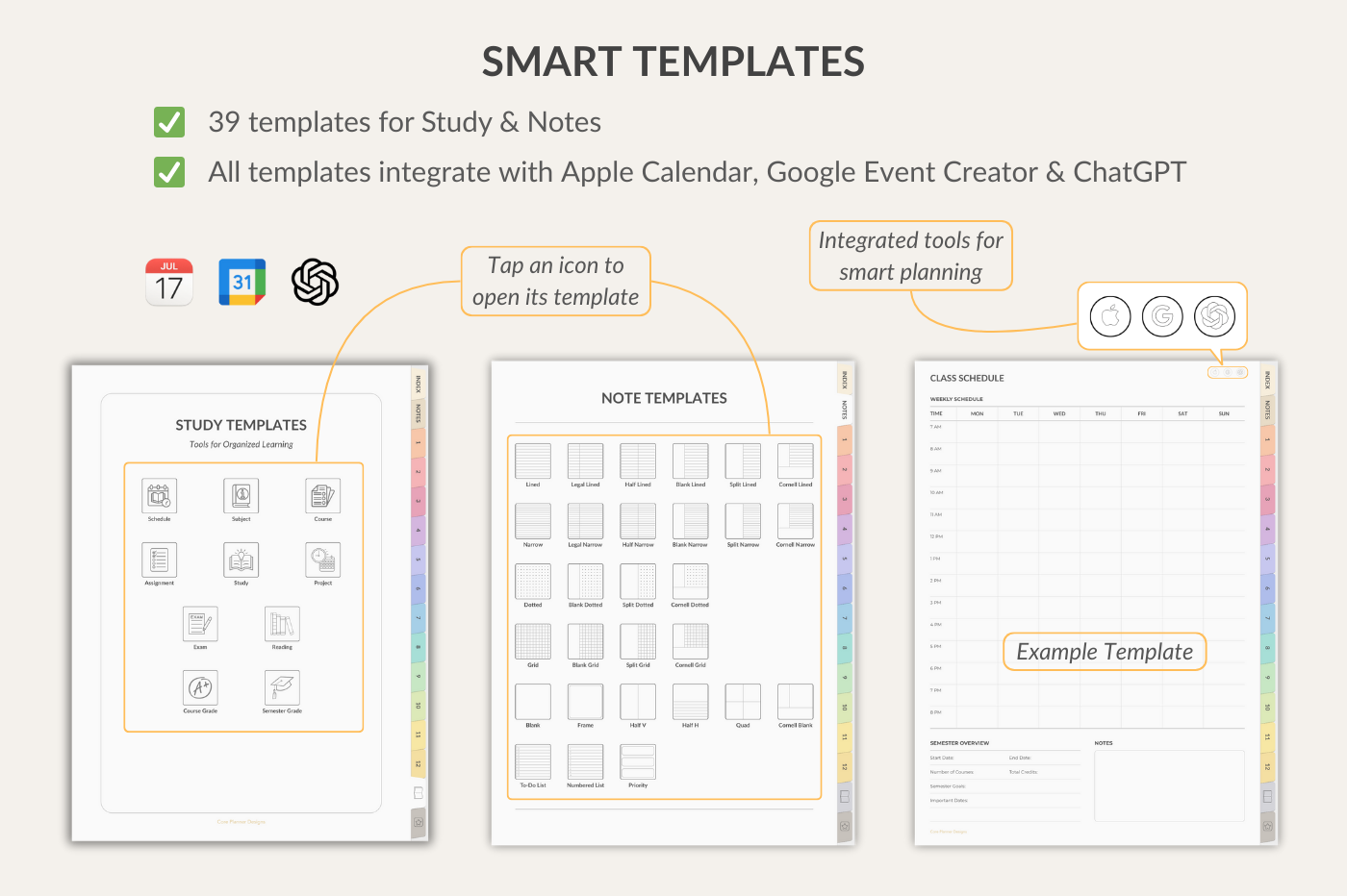 Study Notebook for GoodNotes with 12 sections and 39 insertable templates. Includes key study templates: Schedule, Subject, Course Overview, Assignment, Study Plan, Project, Reading, Exam, Course Grade, Semester Grade. Comes with 300+ stickers, 5 covers, and smart links to Apple Calendar, Google Event Creator, and ChatGPT.