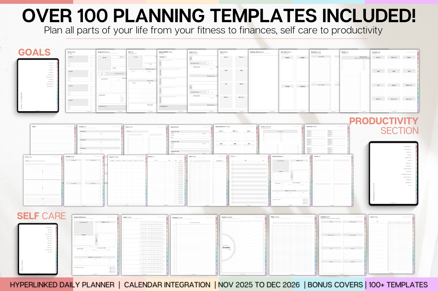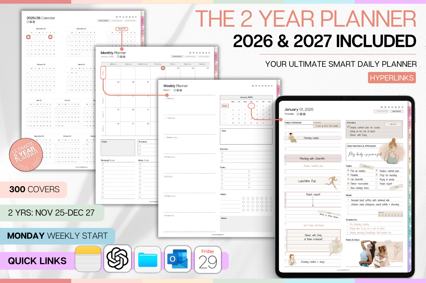 Two years, one planner, endless progress ✨ Running from Nov 2025 to Dec 2027, this two-year planning system is designed to support your life, goals, and routines long-term • Daily, weekly & monthly planning across two full years • Time-blocking layouts for productivity & balance • 100+ lifestyle templates, 12 notebooks & 40 page templates • 300+ bonus digital covers 🔗 Apple & Google Calendar integration plus ChatGPT, Outlook, Notes, Mail & Reminders