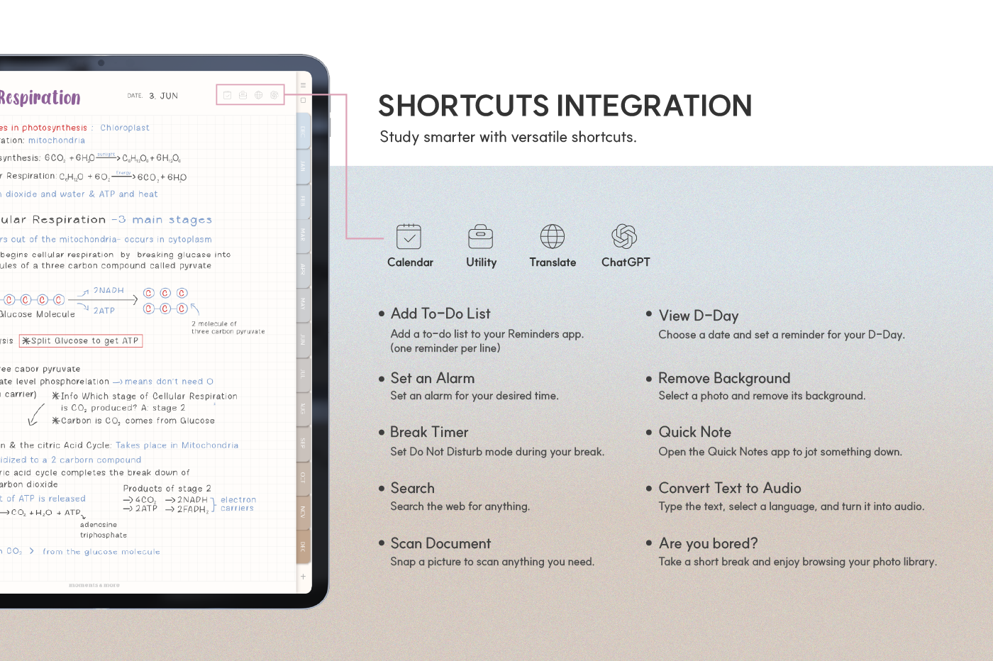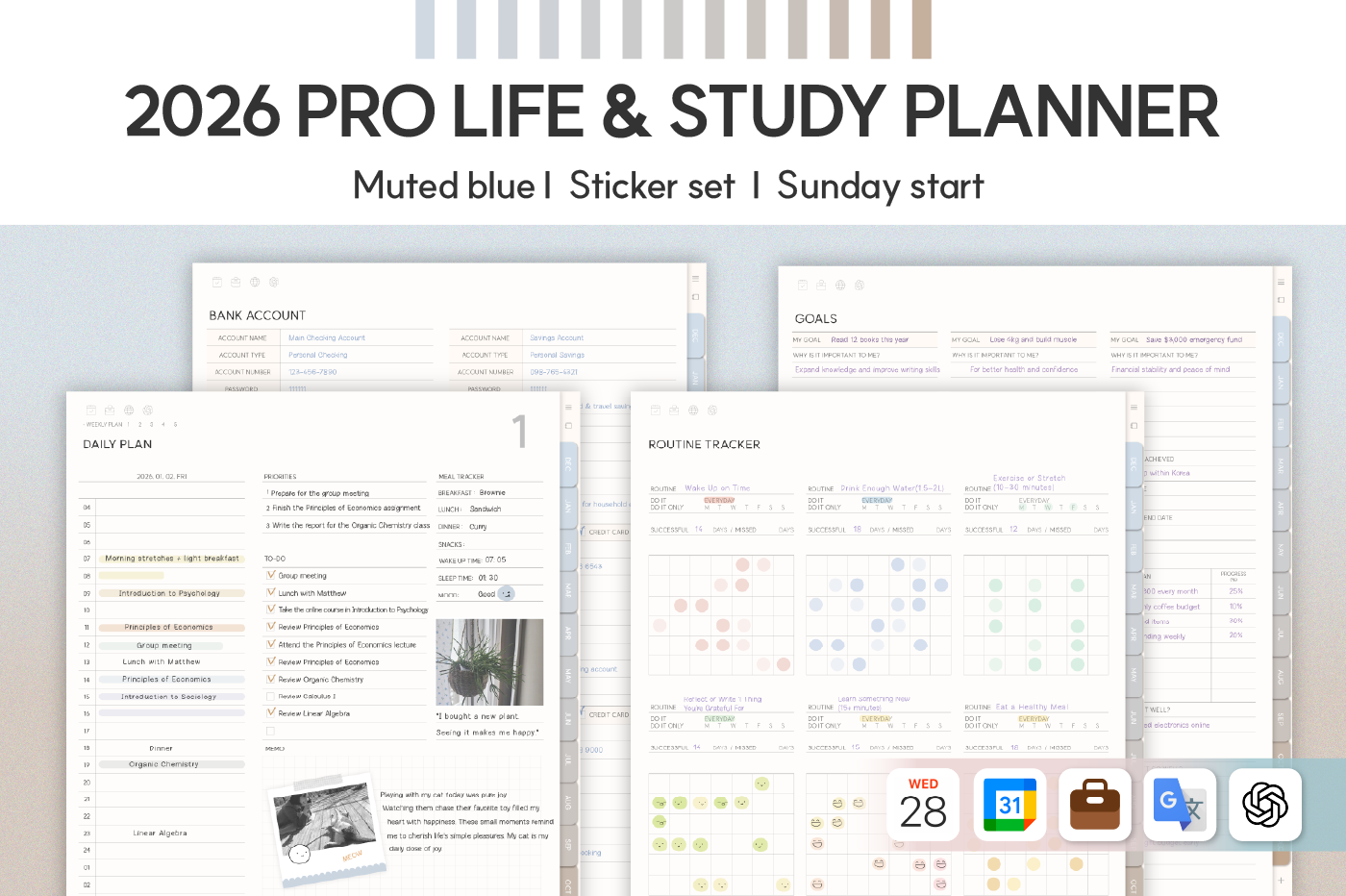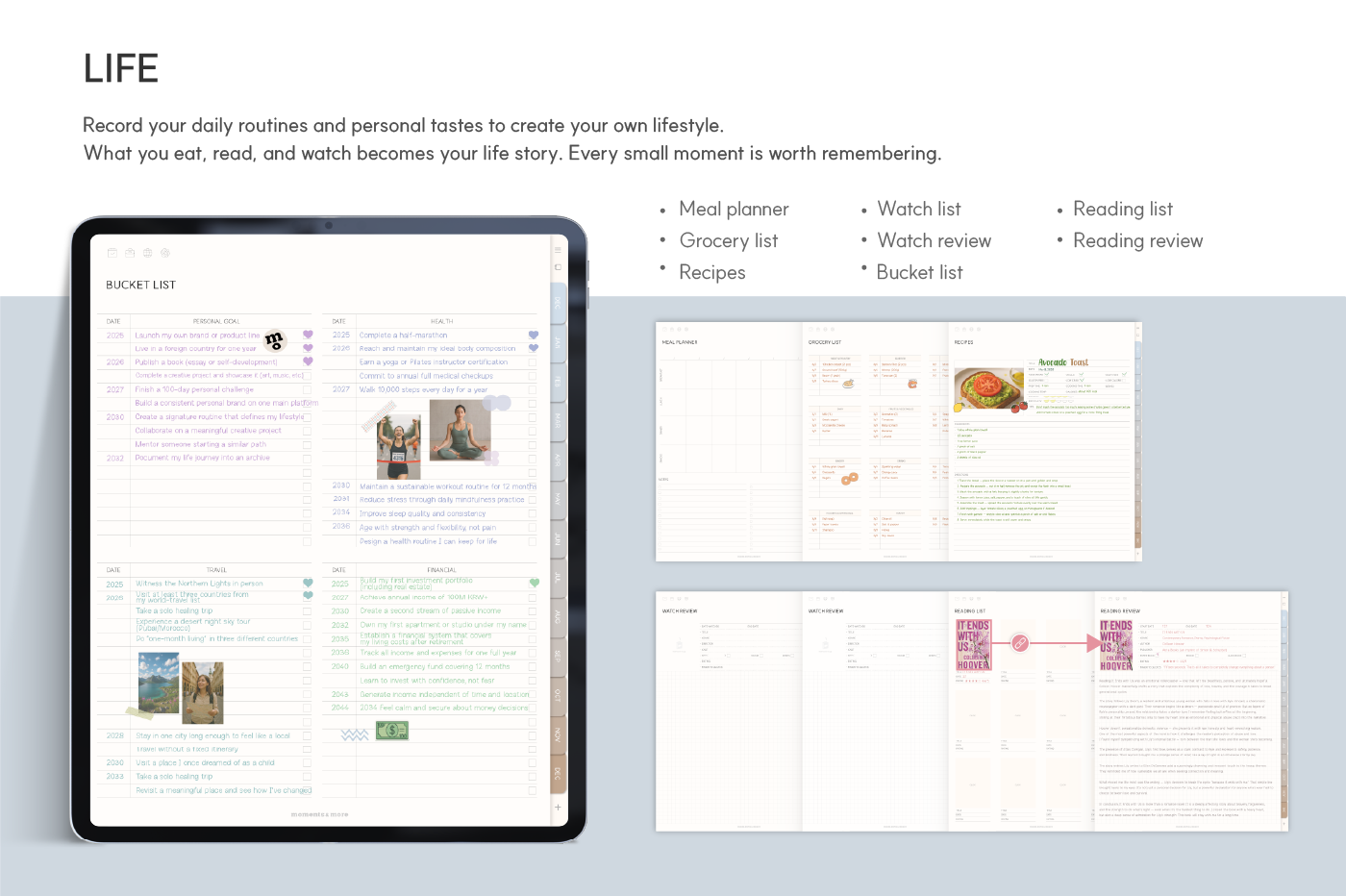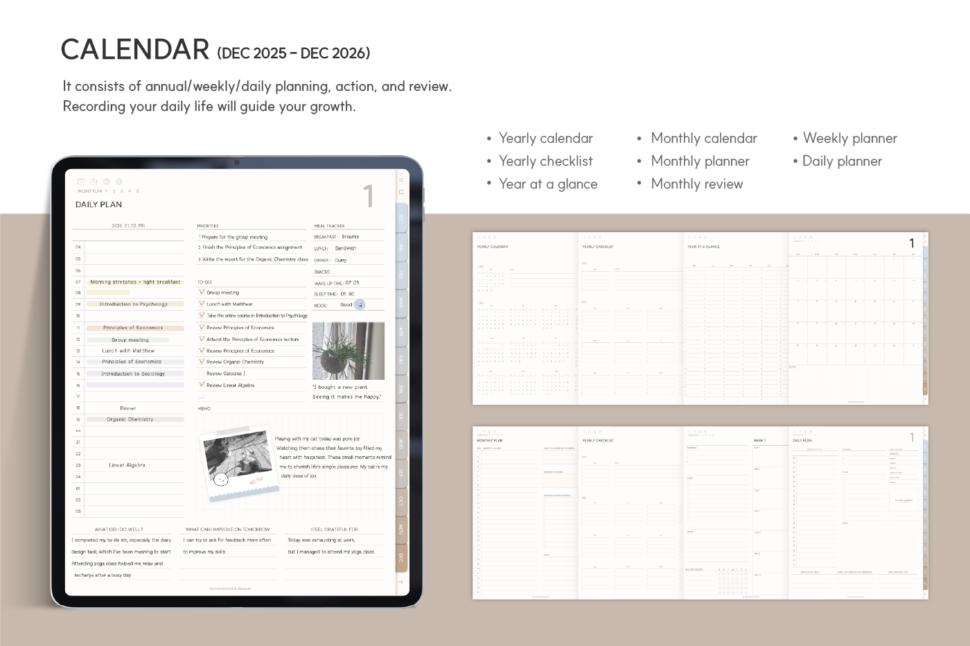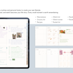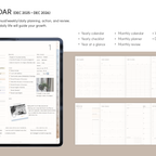 [Page Composition] - Hyperlinks - User Guide - Apple & Google Calendar Integration - Shortcuts Integration (Utility, Google Translate, ChatGPT) - Dec '25 Included - Covers (9) - Yearly / Monthly / Weekly / Daily - Finance (4 types) - Productivity (6 types) - Life (8 types) - Notes (45 types) - Stickers