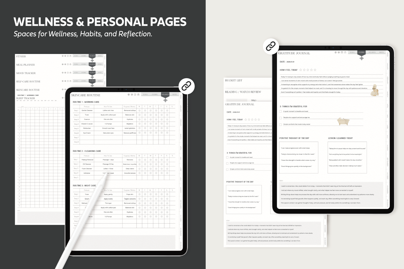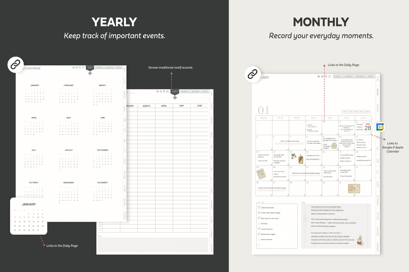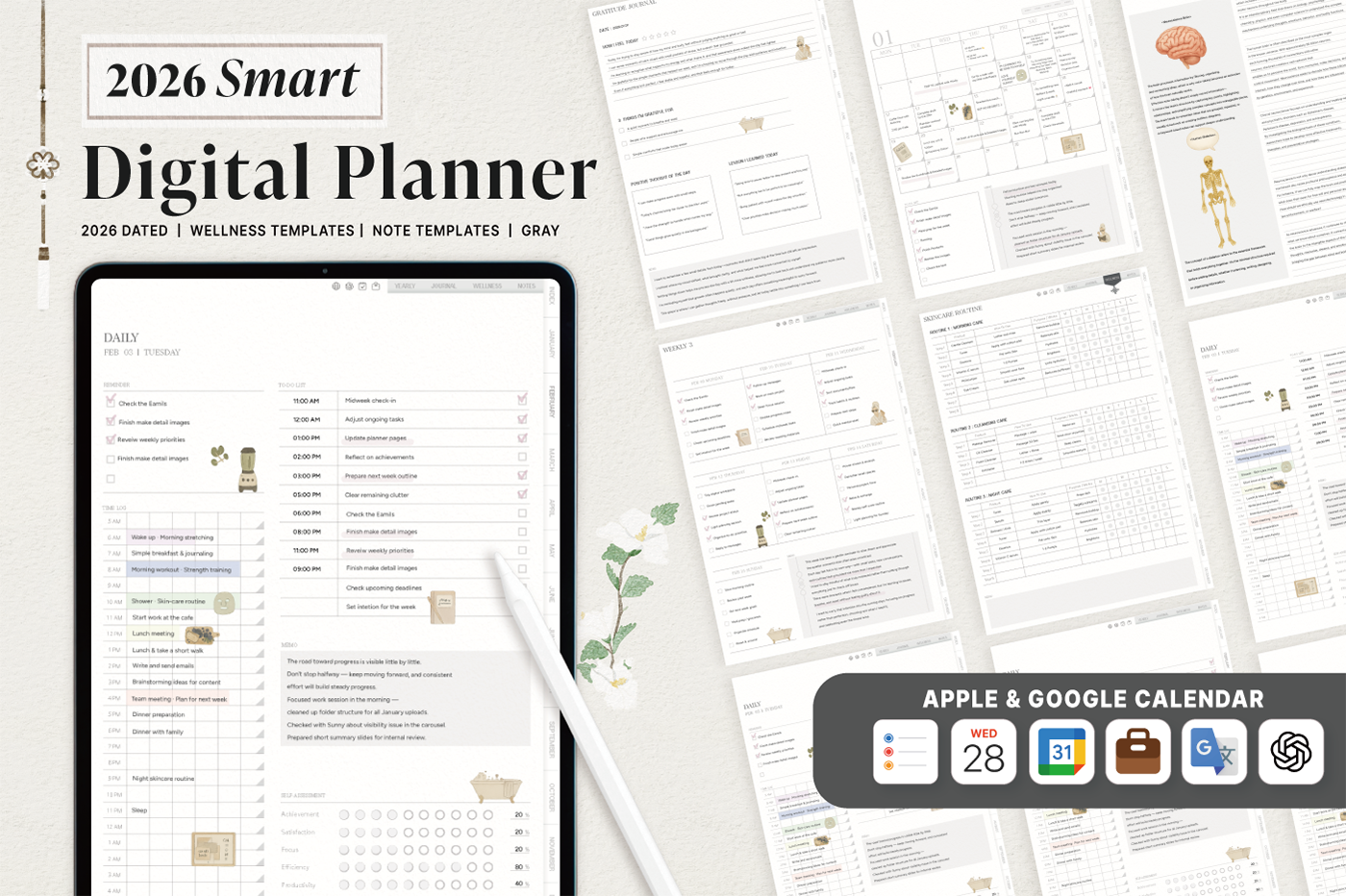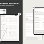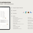[Page Composition] - Hyperlinks - User Guide - Apple & Google Calendar Integration - Shortcuts Integration (Utility, Google Translate, ChatGPT) - Covers (3) - Yearly / Monthly / Weekly / Daily - Journal (3 types) - Wellness (6 types) - Notes (28 types)