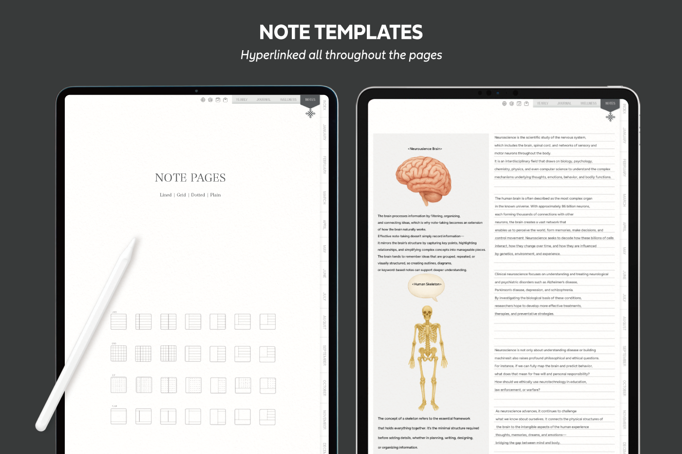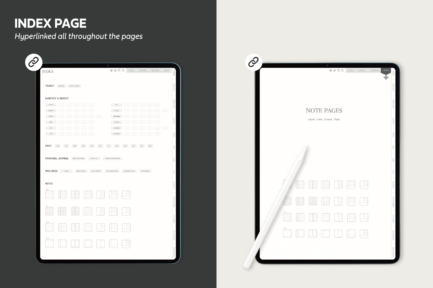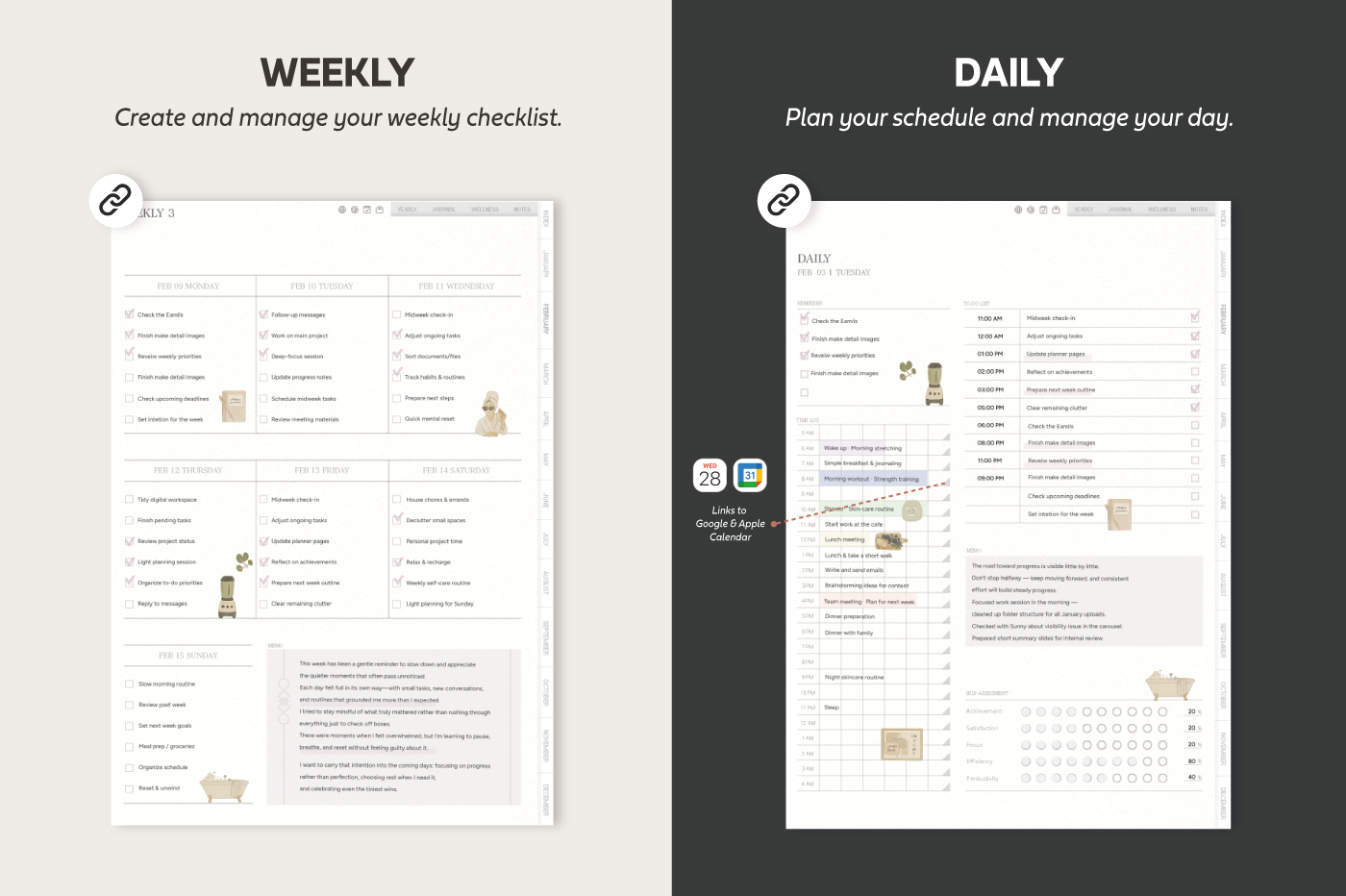[Page Composition] - Hyperlinks - User Guide - Apple & Google Calendar Integration - Shortcuts Integration (Utility, Google Translate, ChatGPT) - Covers (3) - Yearly / Monthly / Weekly / Daily - Journal (3 types) - Wellness (6 types) - Notes (28 types)
