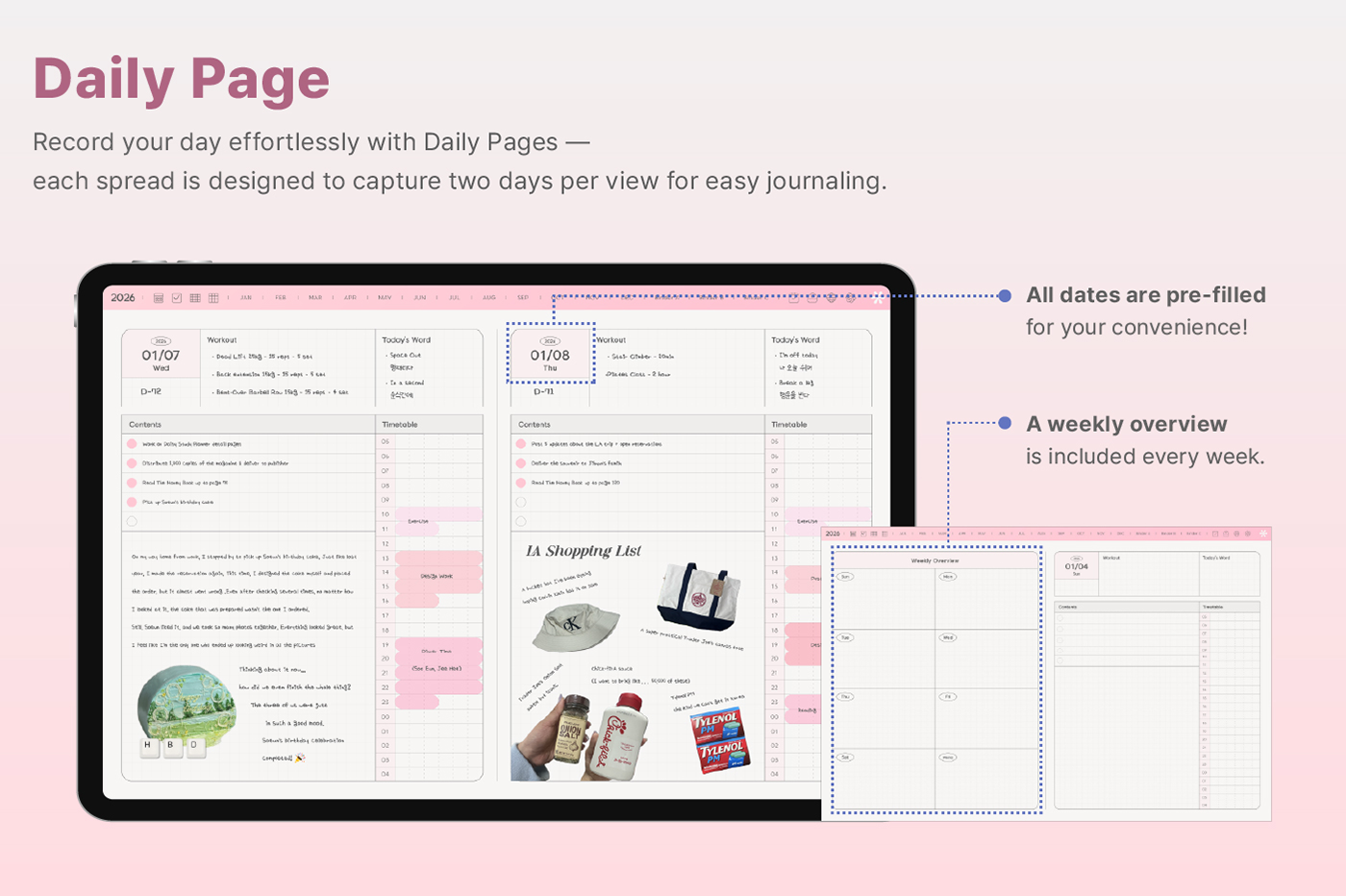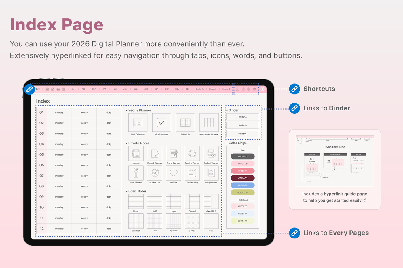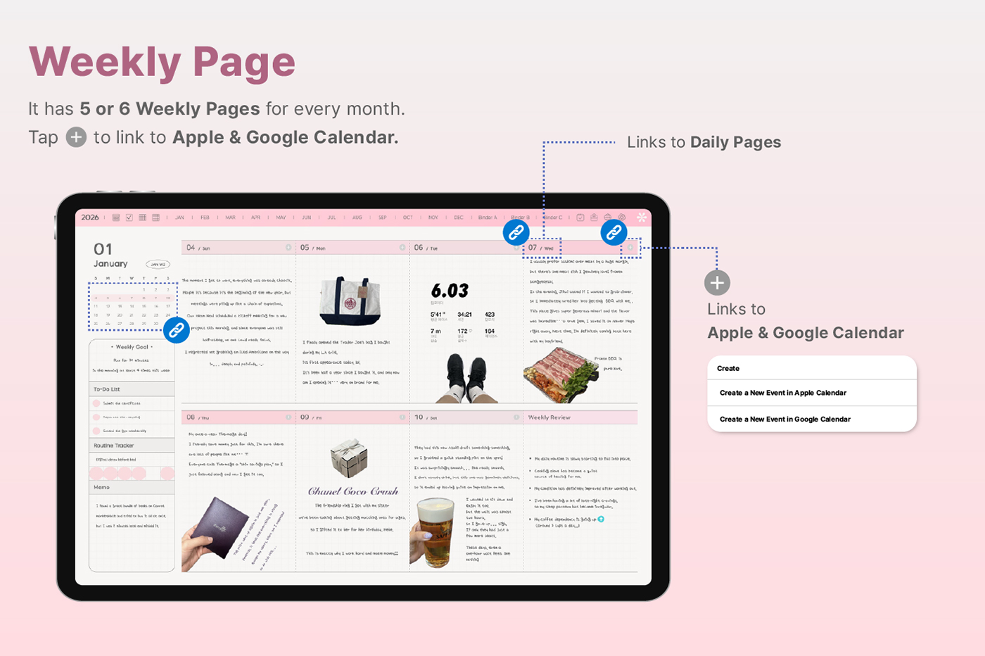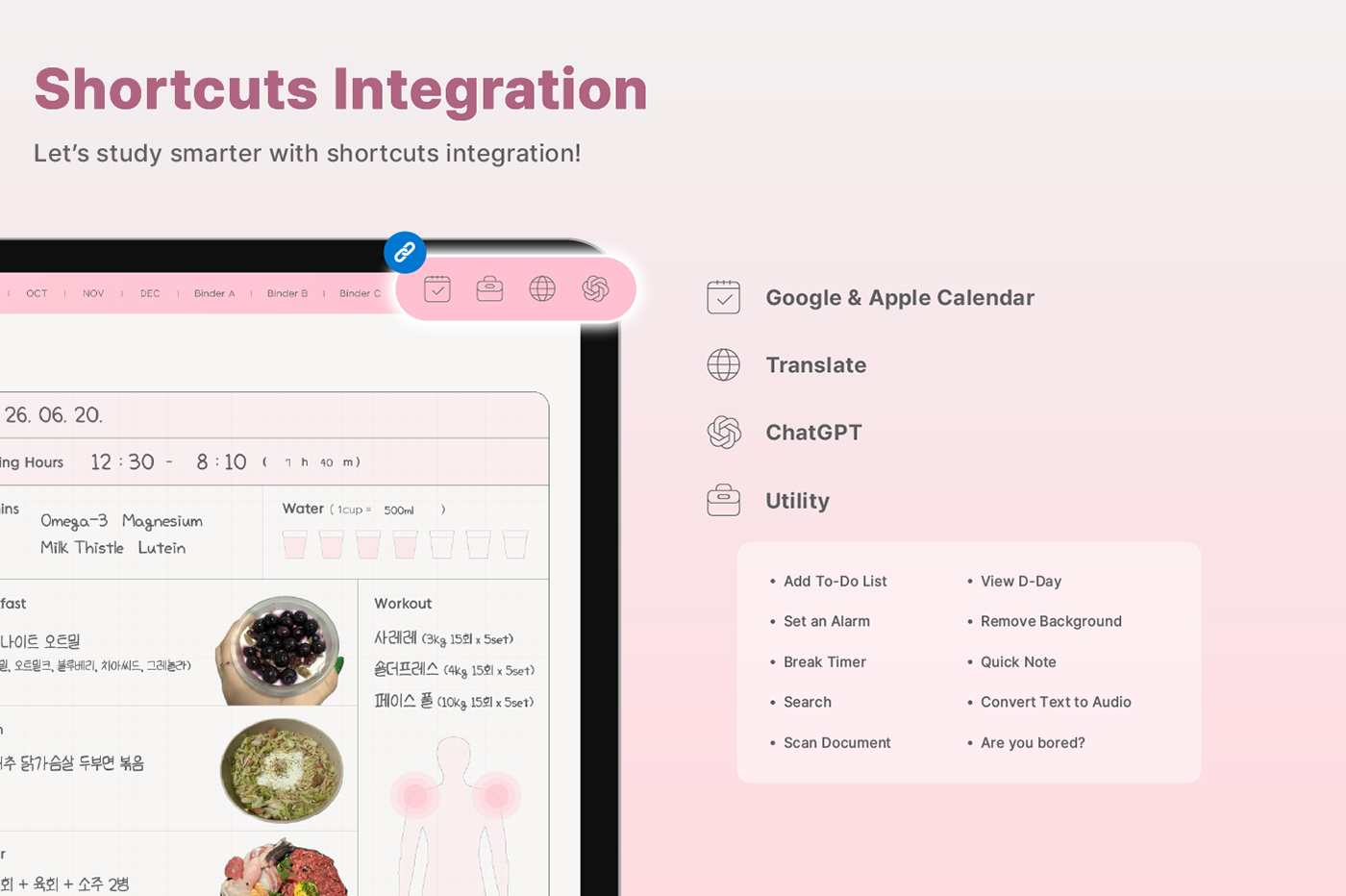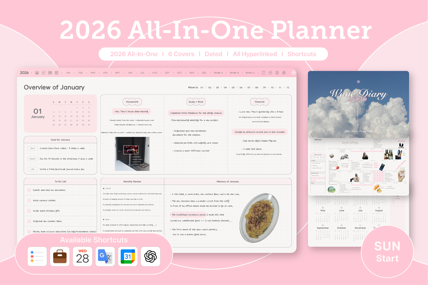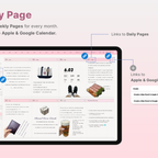 Its clean layout and shortcut integration make journaling even easier. [Page Composition] - Hyperlinks - User Guide - Apple & Google Calendar Integration - Shortcuts Integration (Utility, Google Translate, ChatGPT) - Covers (11) - Index - Yearly / Monthly / Weekly / Daily - Personal : Journal, Project, Study, Tracker, Meal Plan, Bucket List, Wishlist, Review, Recipe - Note Binders (3) - Notes (10 types)