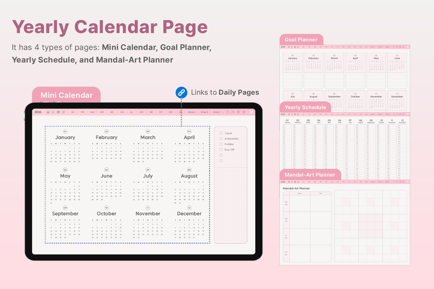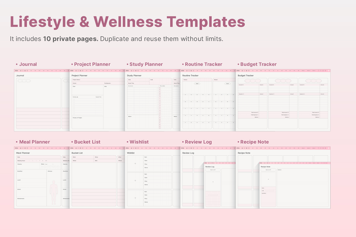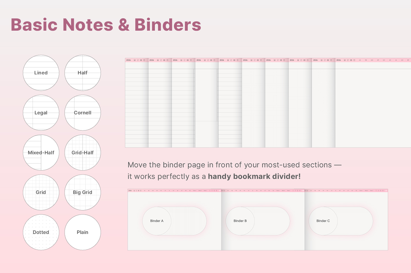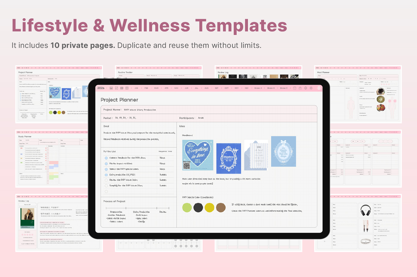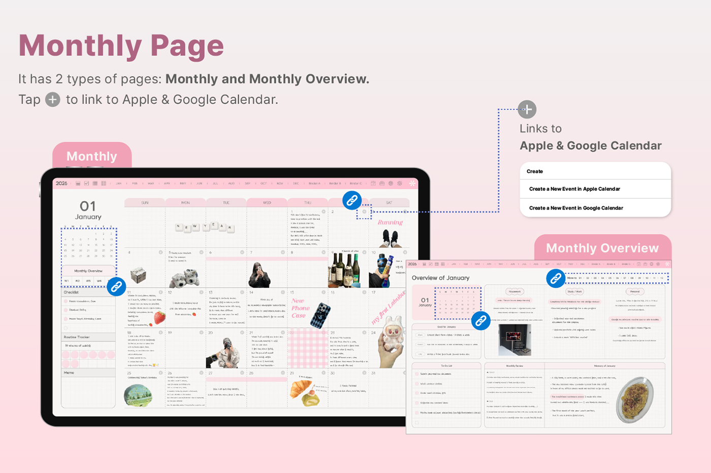 Its clean layout and shortcut integration make journaling even easier. [Page Composition] - Hyperlinks - User Guide - Apple & Google Calendar Integration - Shortcuts Integration (Utility, Google Translate, ChatGPT) - Covers (11) - Index - Yearly / Monthly / Weekly / Daily - Personal : Journal, Project, Study, Tracker, Meal Plan, Bucket List, Wishlist, Review, Recipe - Note Binders (3) - Notes (10 types)