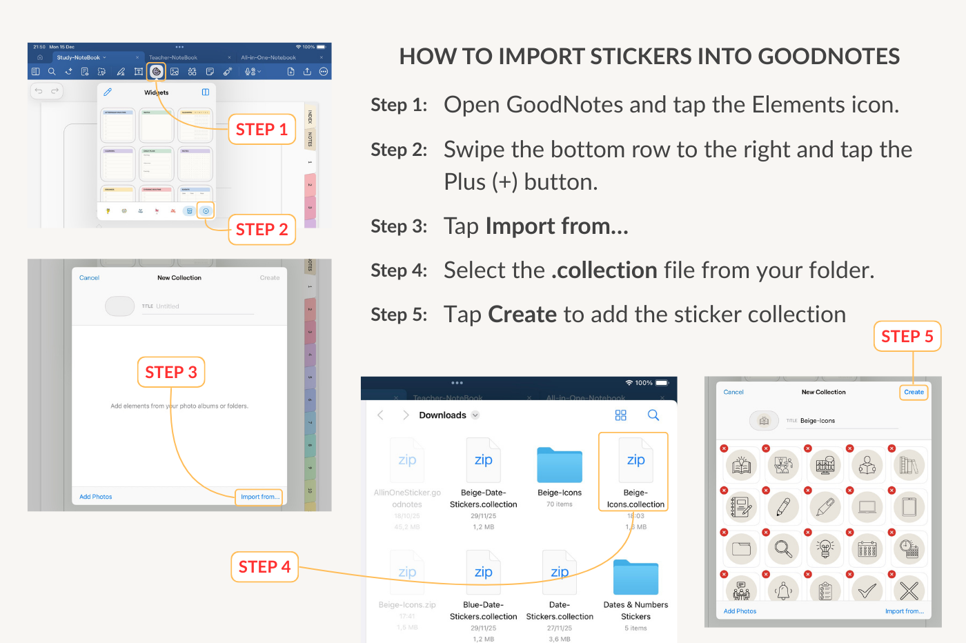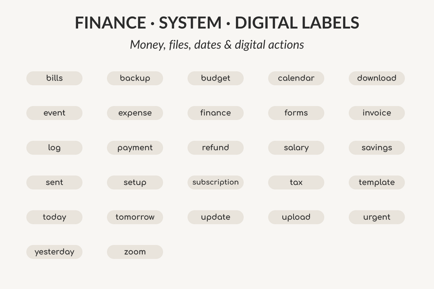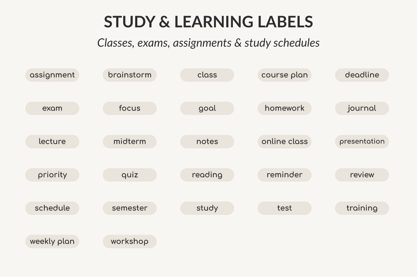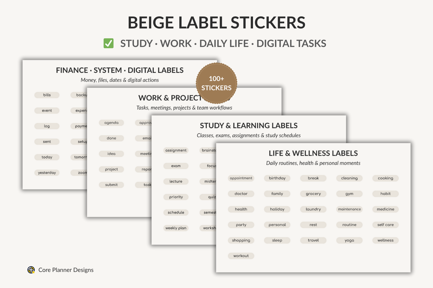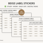 Beige Label Stickers includes 104 minimal beige text labels designed for study, work, daily life, wellness, finance, and digital tasks. Delivered as a ready-to-use GoodNotes sticker collection (.collection file) for fast import and repeated use in digital planners and notebooks.