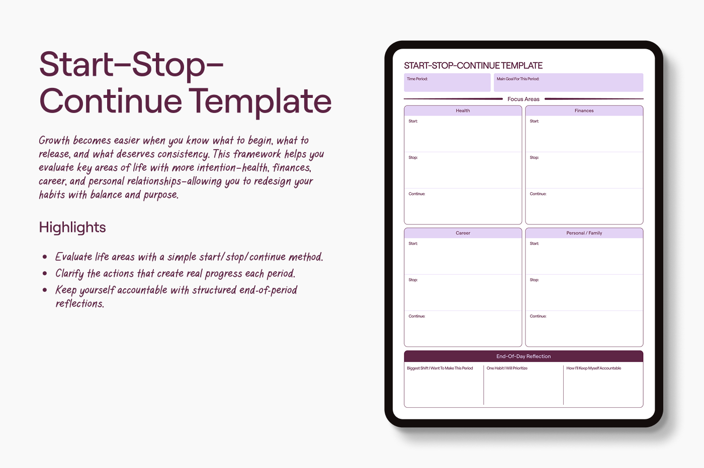 Quickly note what to start,stop,and continue to stay aligned with your goals.