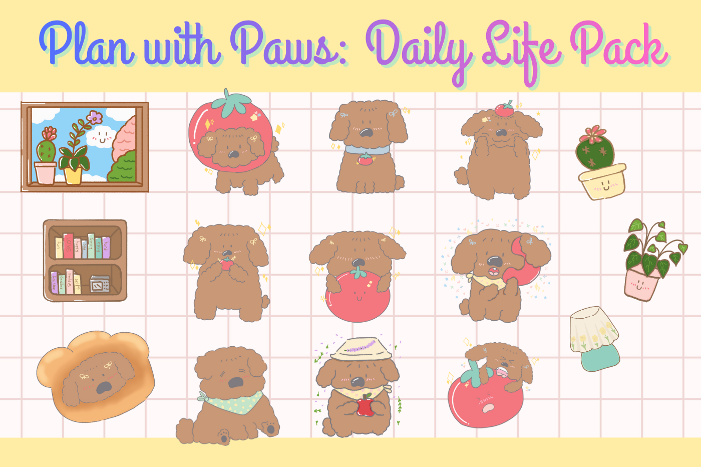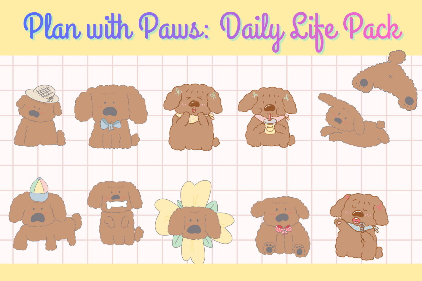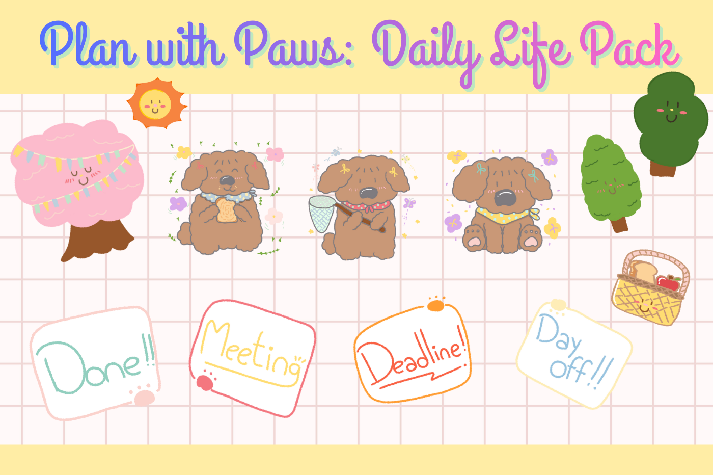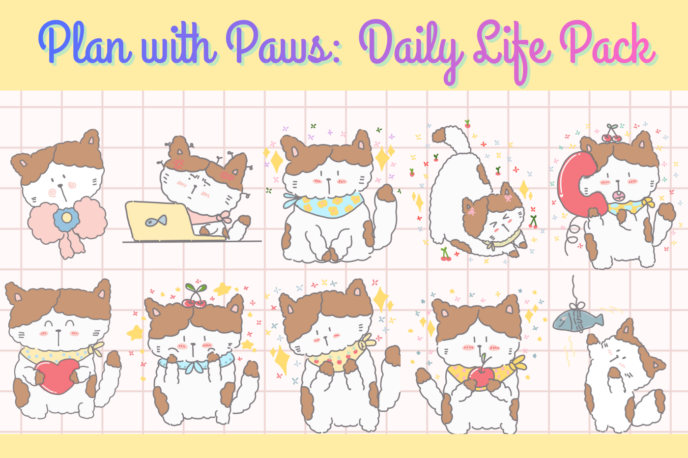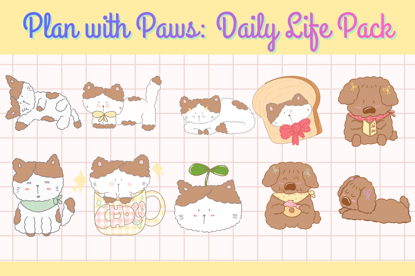 Planning is more fun with friends! 🐾 Meet the Plan with Paws: Daily Life Pack, a mega-set of 58 stickers featuring a chaotic cat & dog duo. Whether it's a 'Deadline!', 'Meeting', or 'Day off!!', these furry muses are here to help. From cozy snacks to lazy naps, this pack covers all your needs with a touch of whimsy. Inside: - 58 Unique stickers - Functional phrases ('Done!!', 'Meeting') - Cozy icons (Flowers, trees) Add some 'Paws-itivity' to your planner today! ✨