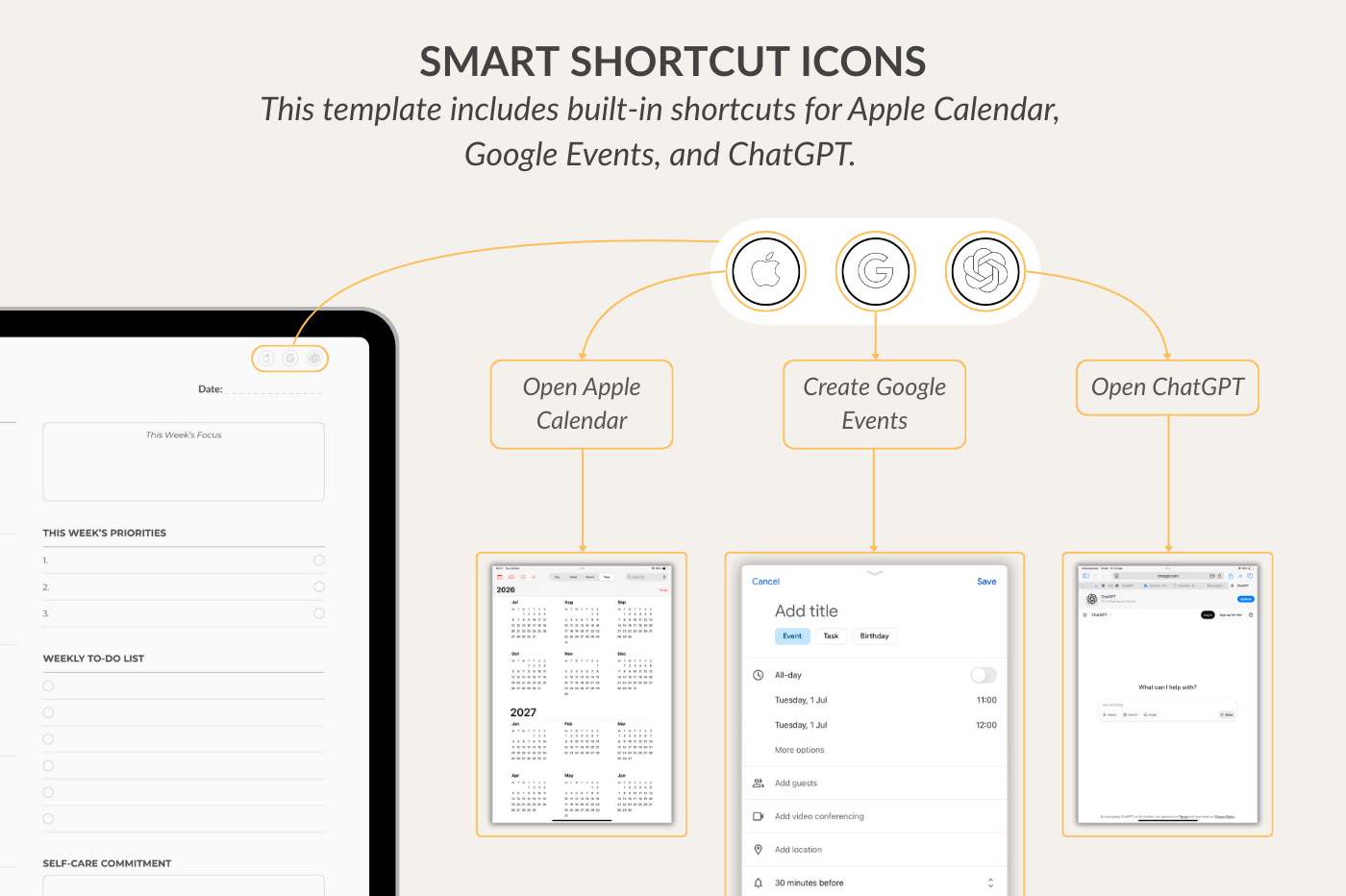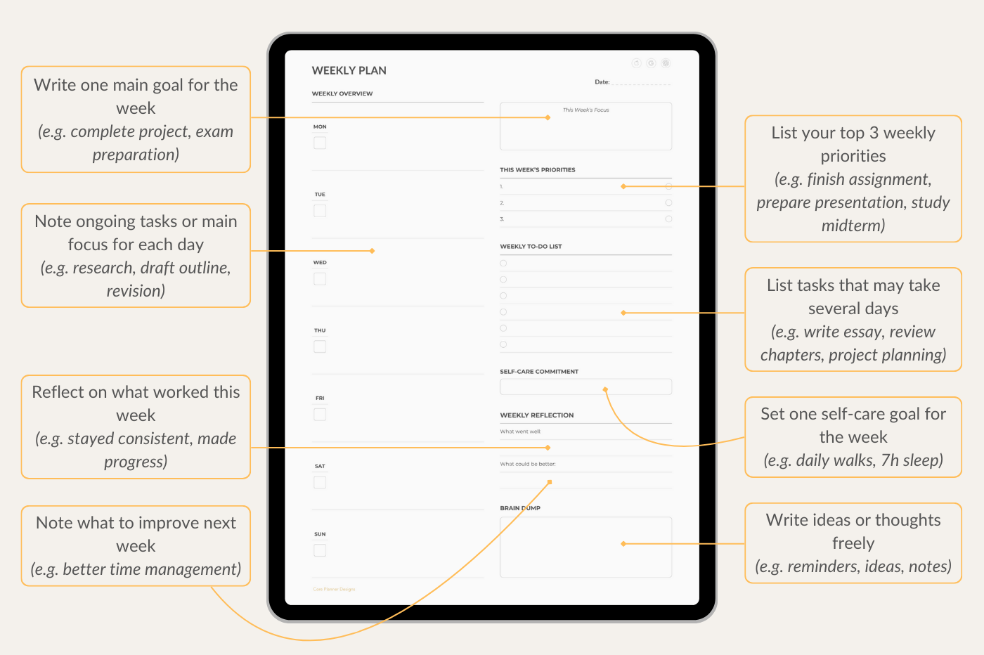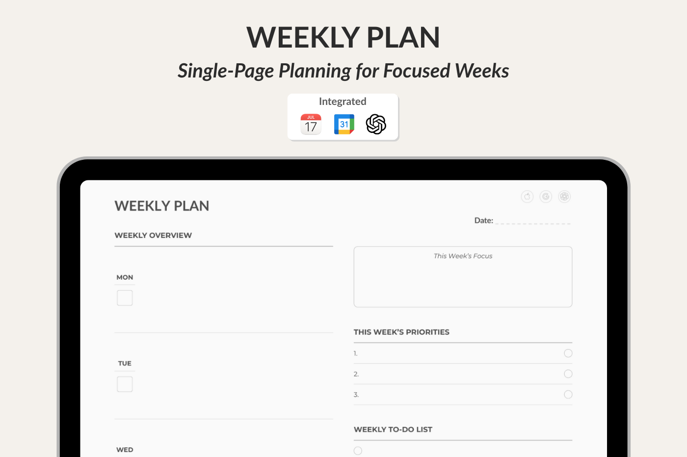 A clean weekly planning template to help you organize your week at a higher level. Set one main focus, define weekly priorities, track ongoing tasks, and reflect on progress — all in one page. Integrated with Apple Calendar, Google Events, and ChatGPT.