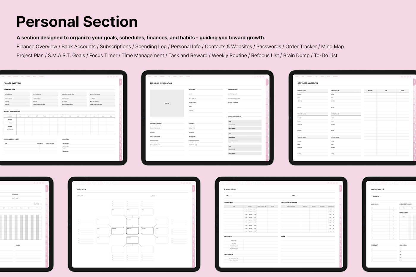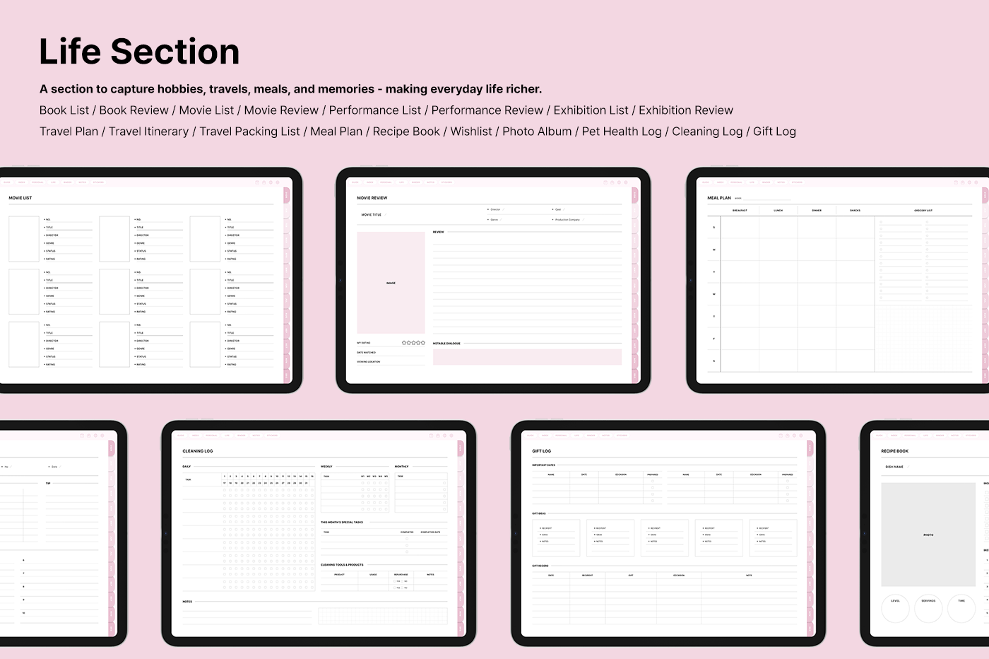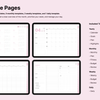 It includes a variety of templates, such as goal setting, routine tracking, and notes, for you to use them efficiently based on your needs. [Page Composition] - Hyperlinks - User Guide - Apple & Google Calendar Integration - Shortcuts Integration (Utility, Google Translate, ChatGPT) - Covers (6) - Index - Yearly (4 types) - Monthly (5 types) - Weekly (3 types) - Daily - Personal Templates (18 types) - Life Templates (18 types) - Note Binders (8) - Notes (14 types) - 250+ Stickers