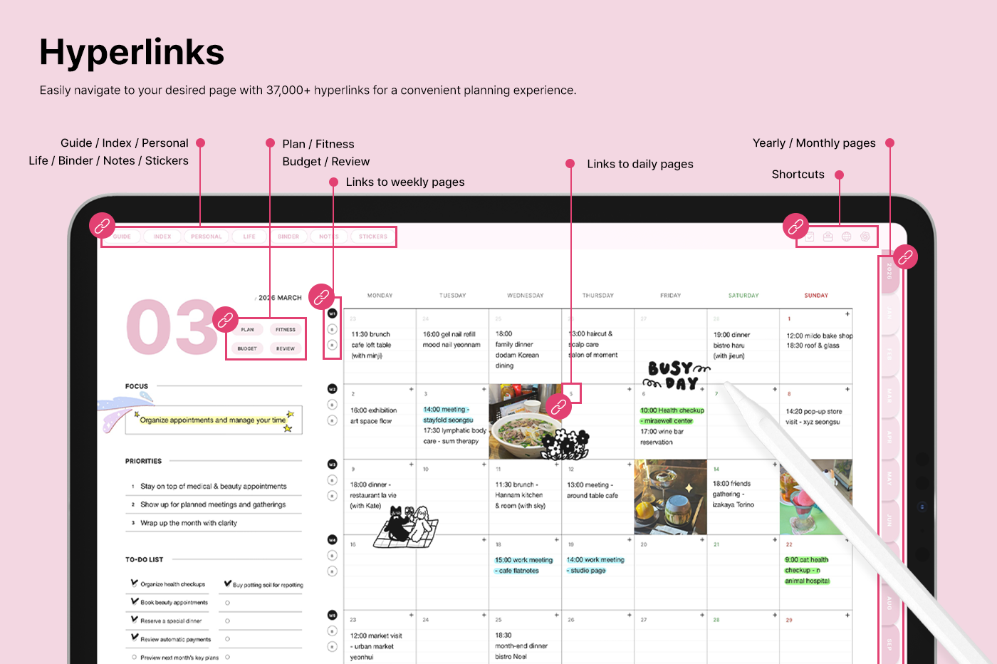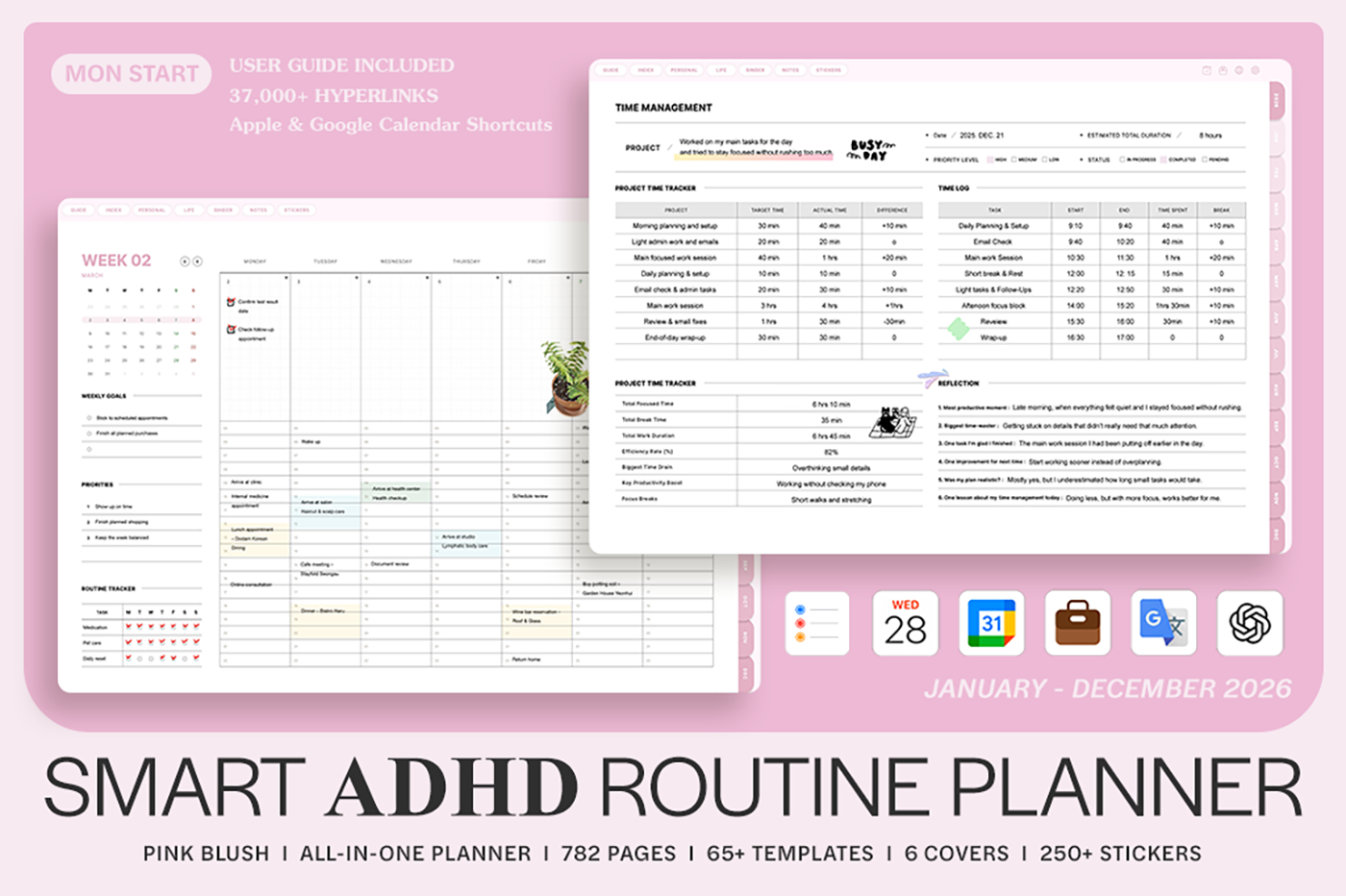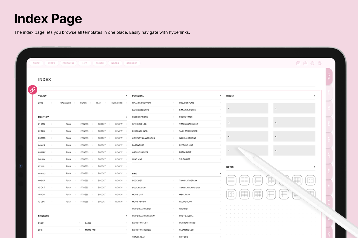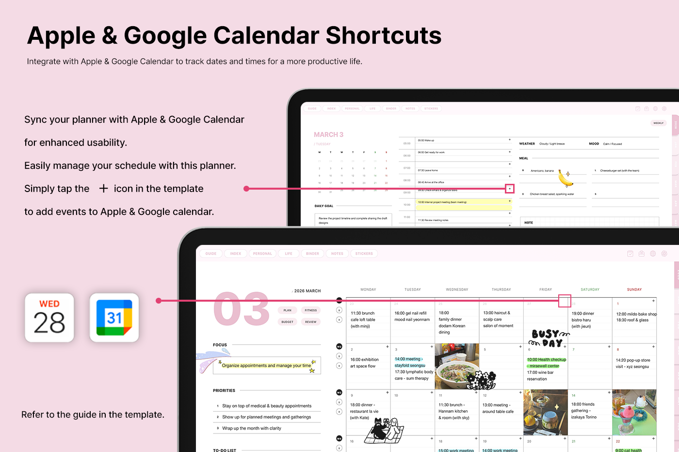 It includes a variety of templates, such as goal setting, routine tracking, and notes, for you to use them efficiently based on your needs. [Page Composition] - Hyperlinks - User Guide - Apple & Google Calendar Integration - Shortcuts Integration (Utility, Google Translate, ChatGPT) - Covers (6) - Index - Yearly (4 types) - Monthly (5 types) - Weekly (3 types) - Daily - Personal Templates (18 types) - Life Templates (18 types) - Note Binders (8) - Notes (14 types) - 250+ Stickers
