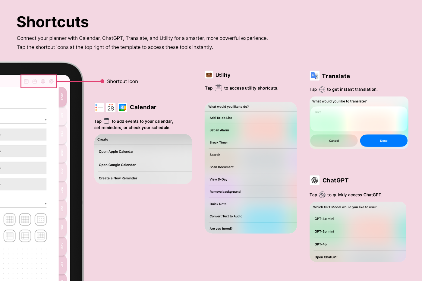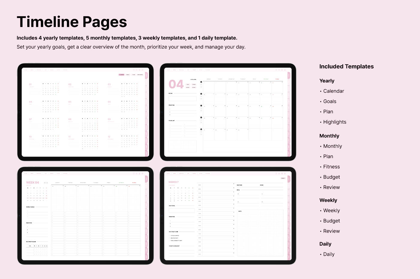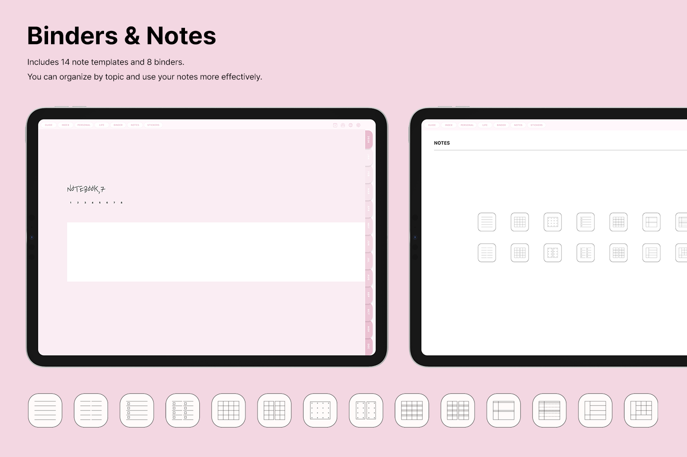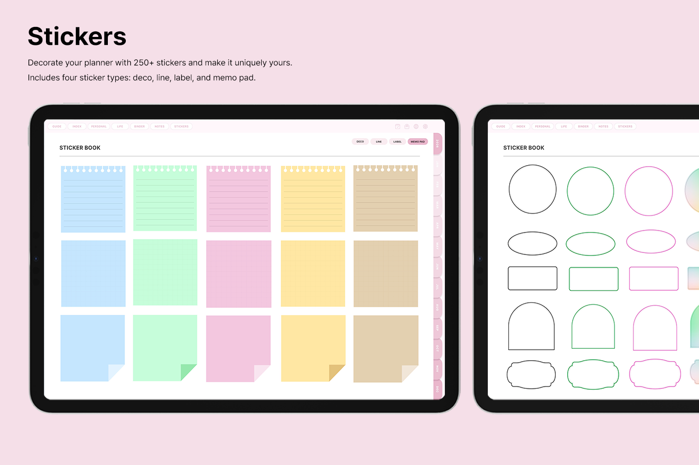 It includes a variety of templates, such as goal setting, routine tracking, and notes, for you to use them efficiently based on your needs. [Page Composition] - Hyperlinks - User Guide - Apple & Google Calendar Integration - Shortcuts Integration (Utility, Google Translate, ChatGPT) - Covers (6) - Index - Yearly (4 types) - Monthly (5 types) - Weekly (3 types) - Daily - Personal Templates (18 types) - Life Templates (18 types) - Note Binders (8) - Notes (14 types) - 250+ Stickers