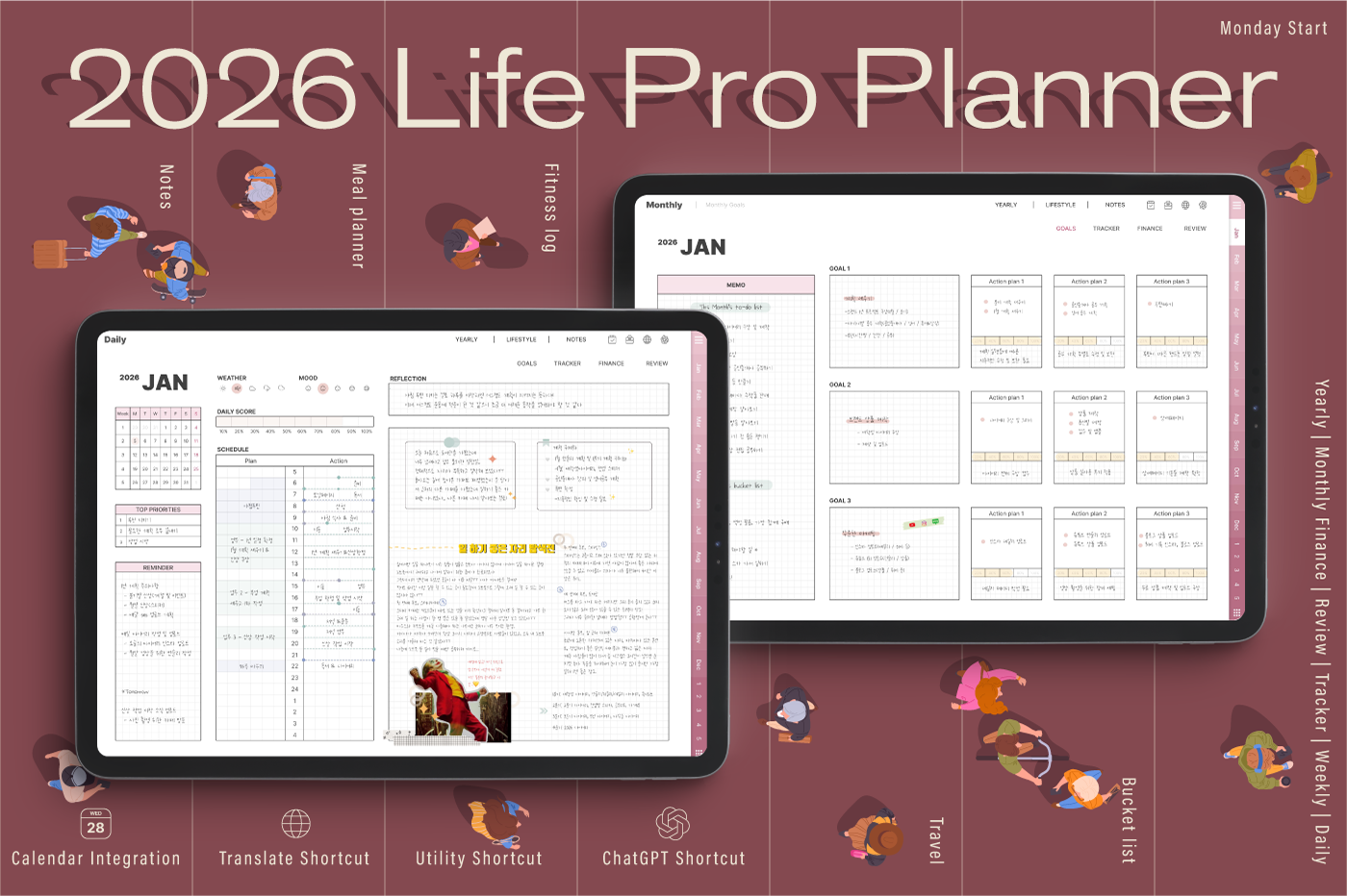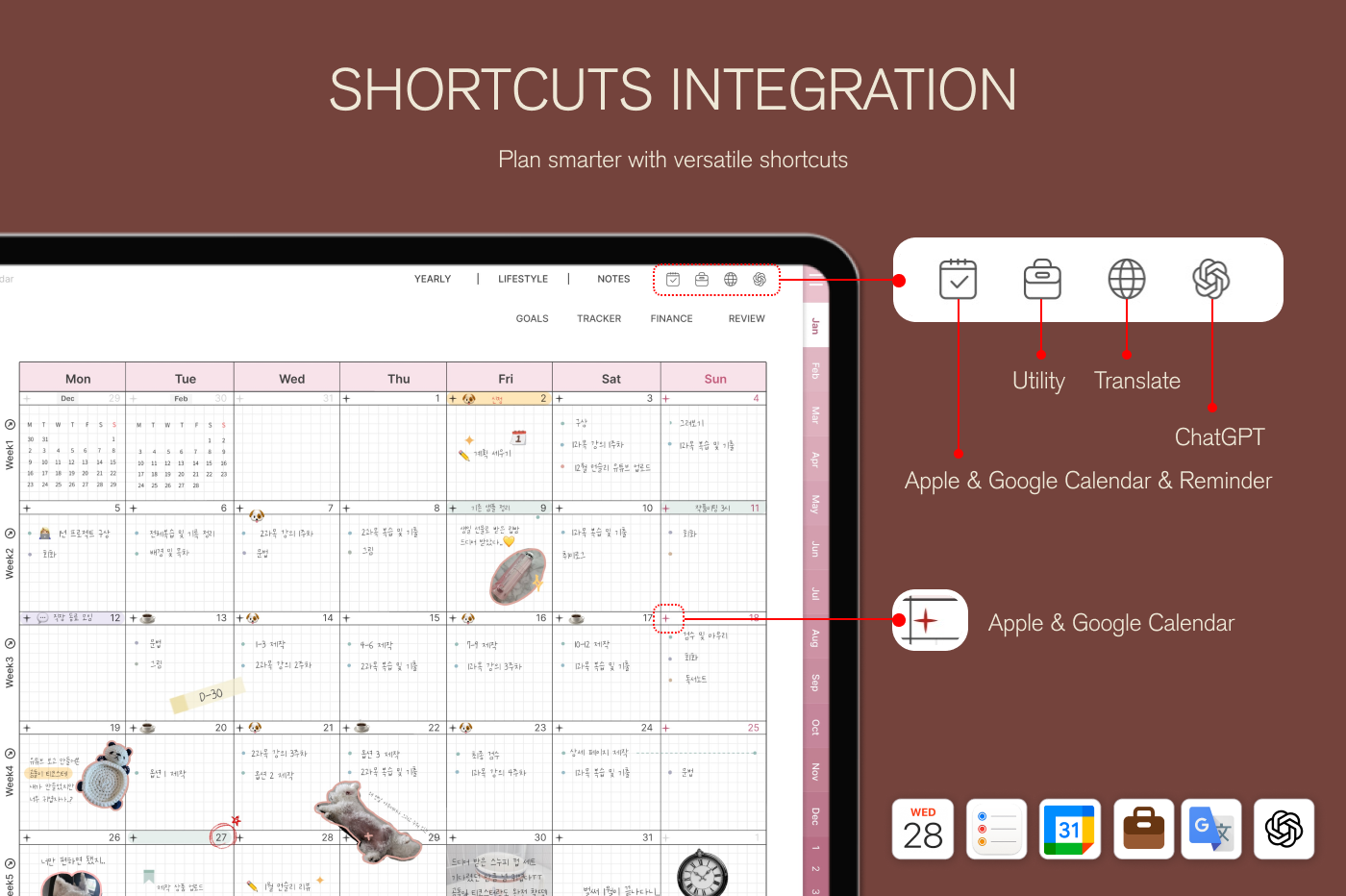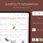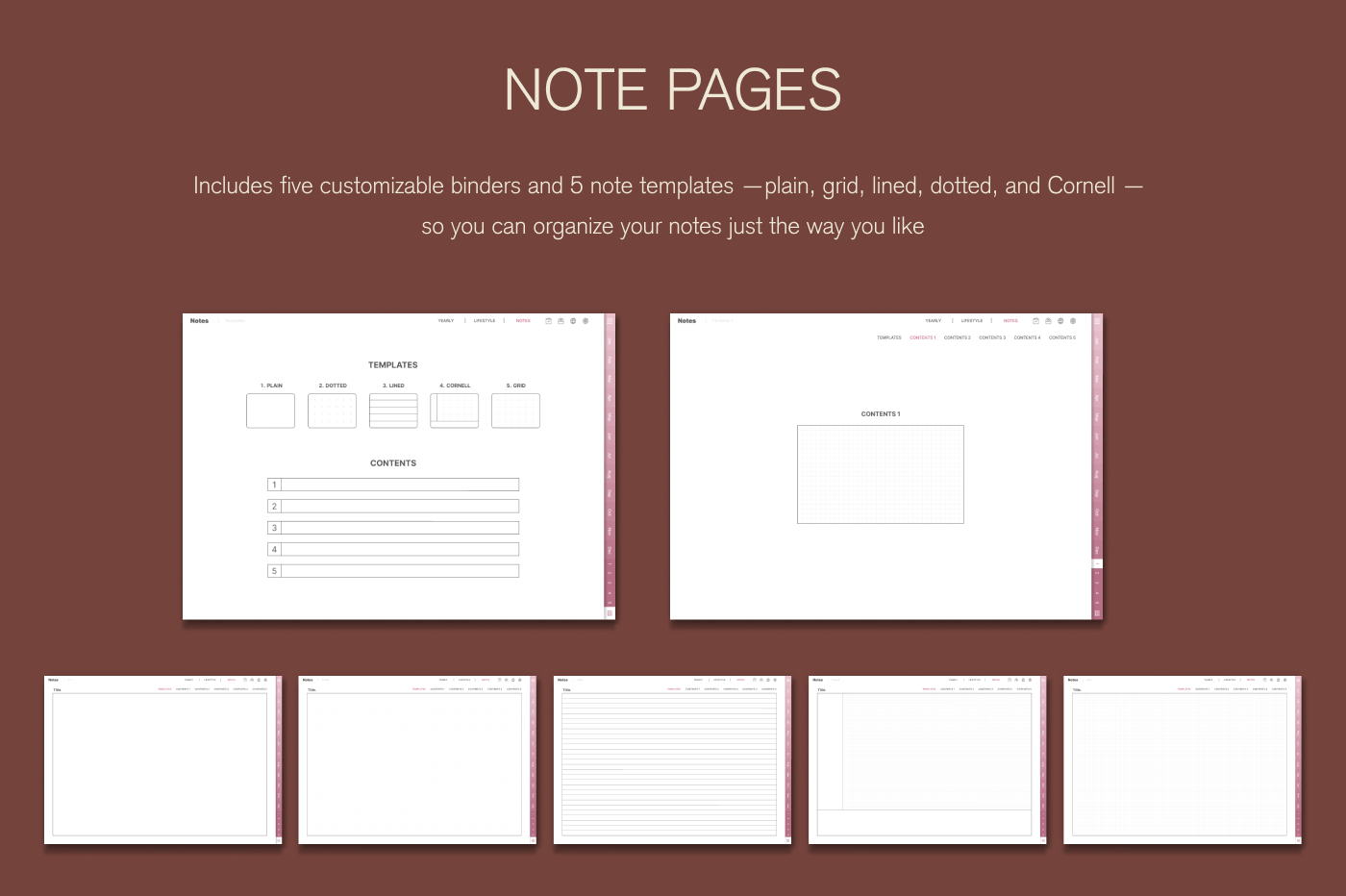 [Page Composition] - Hyperlinks - User Guide - Apple & Google Calendar Integration - Shortcuts Integration (Utility, Google Translate, ChatGPT) - Covers (2) - Index - Yearly / Monthly / Weekly / Daily - Monthly Goals / Tracker / Finance - Lifestyle (4 types) - Note Binders (5) - Notes (5 types)