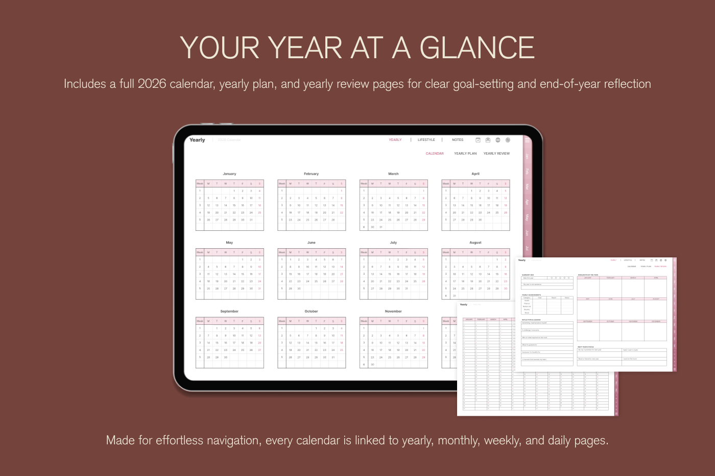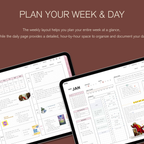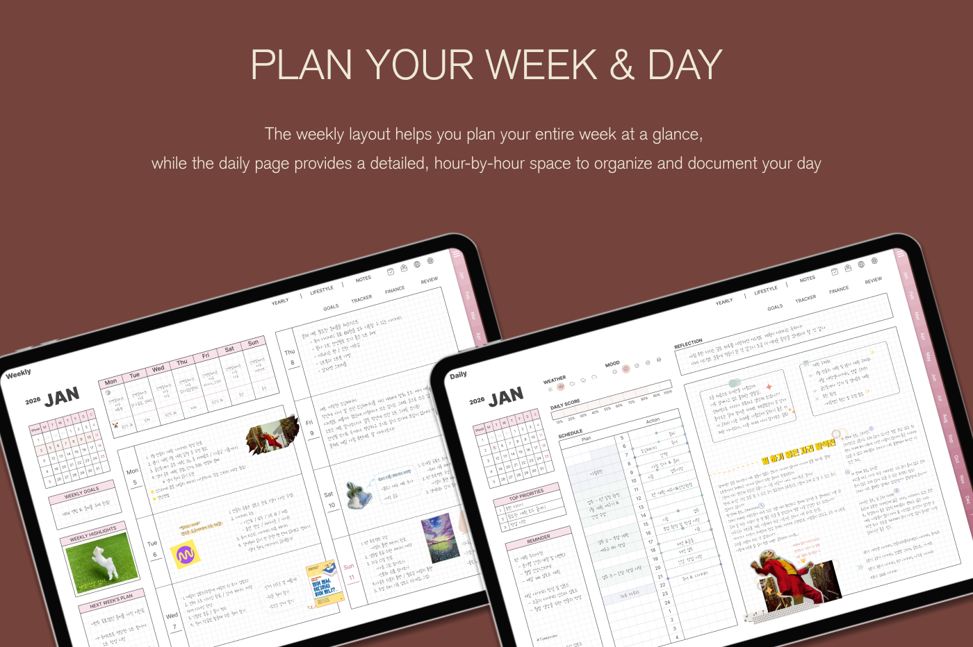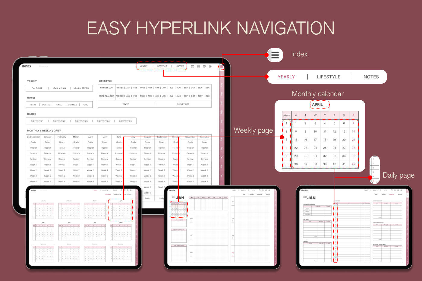 [Page Composition] - Hyperlinks - User Guide - Apple & Google Calendar Integration - Shortcuts Integration (Utility, Google Translate, ChatGPT) - Covers (2) - Index - Yearly / Monthly / Weekly / Daily - Monthly Goals / Tracker / Finance - Lifestyle (4 types) - Note Binders (5) - Notes (5 types)