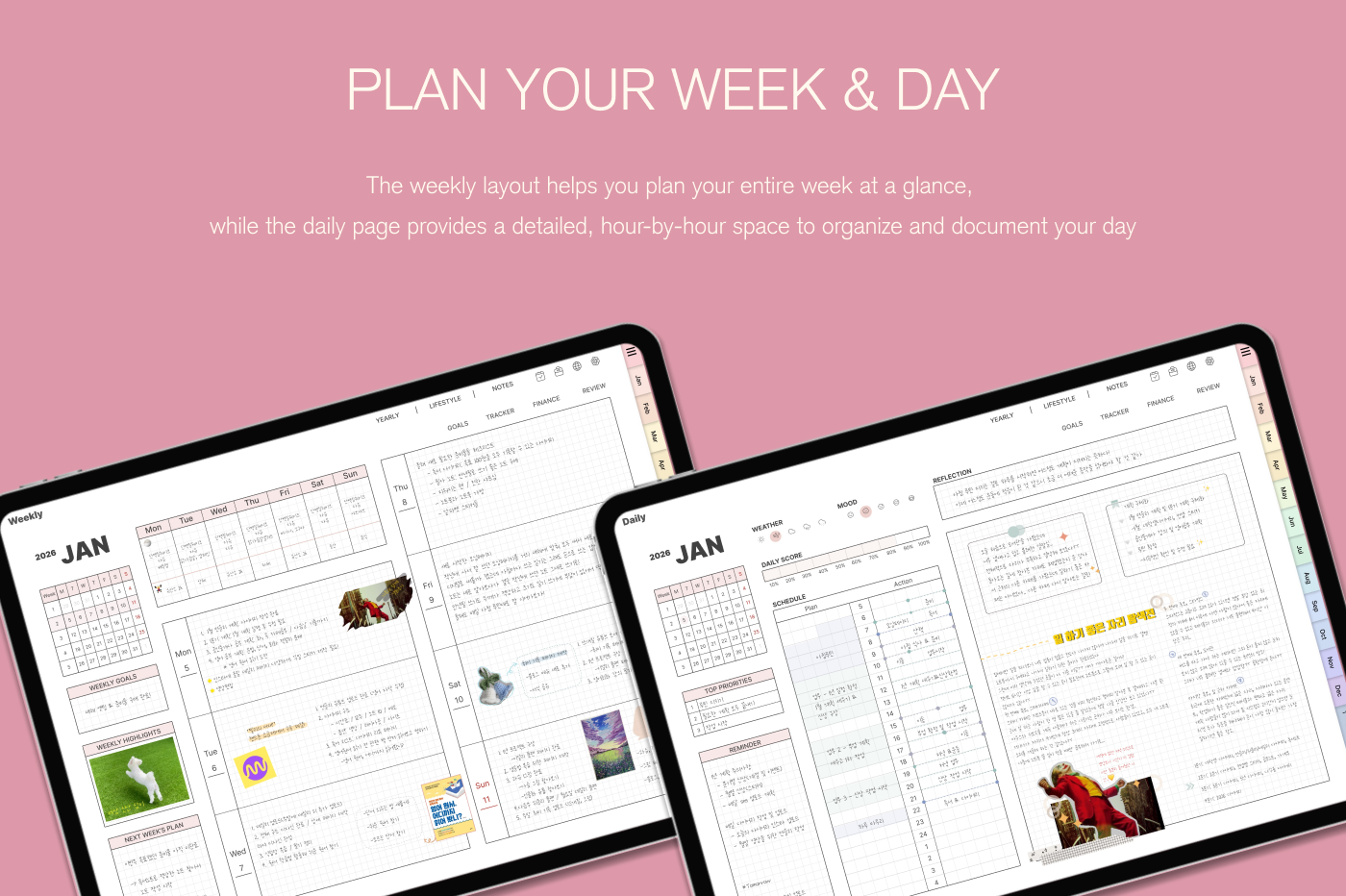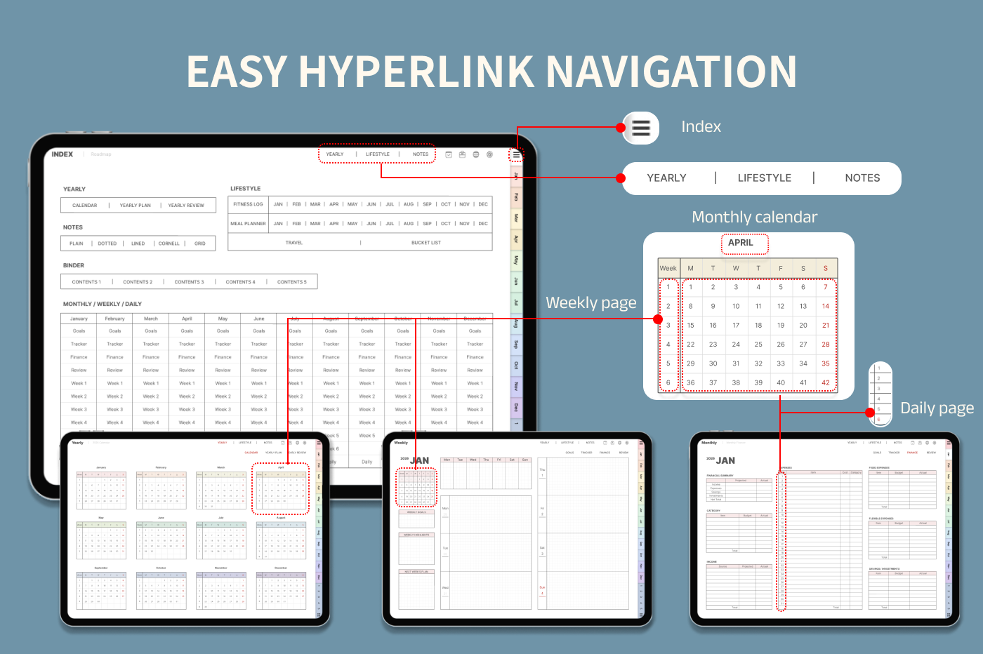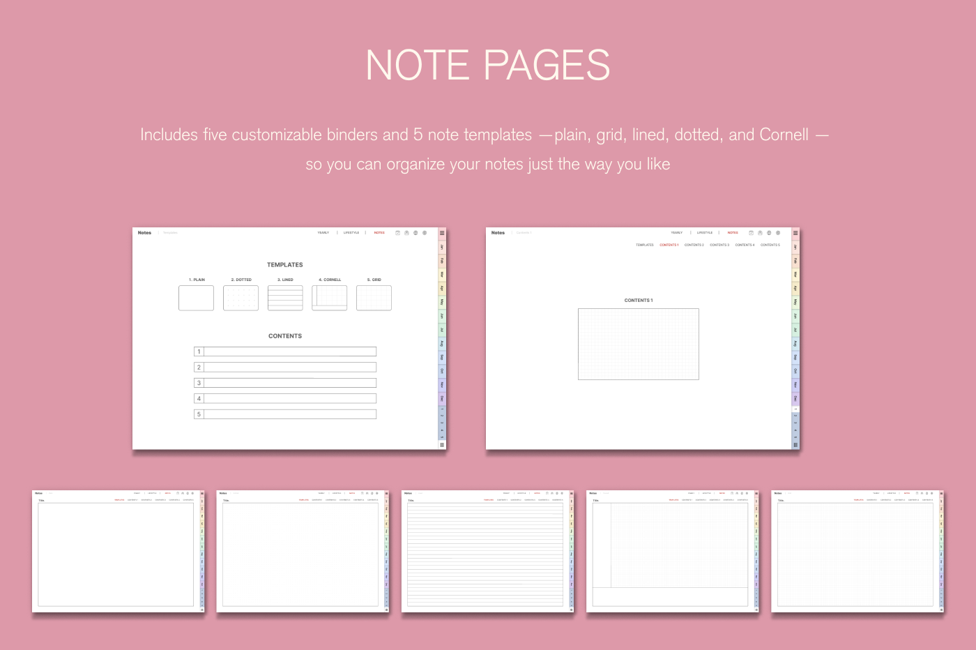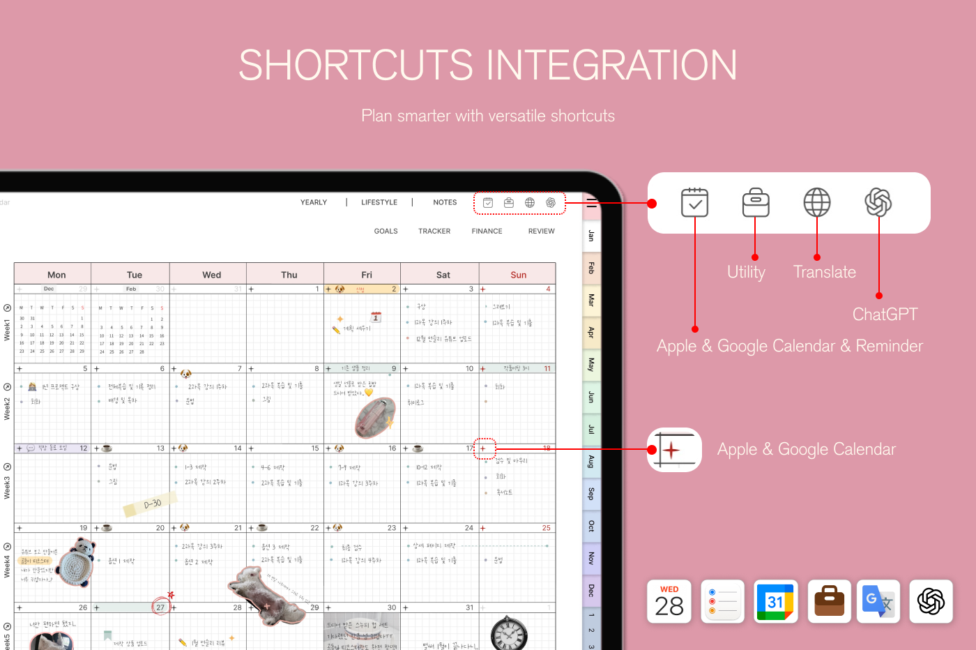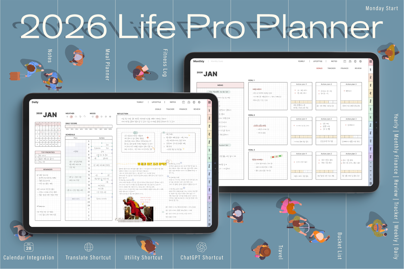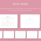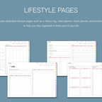 [Page Composition] - Hyperlinks - User Guide - Apple & Google Calendar Integration - Shortcuts Integration (Utility, Google Translate, ChatGPT) - Covers (2) - Index - Yearly / Monthly / Weekly / Daily - Monthly Goals / Tracker / Finance - Lifestyle (4 types) - Note Binders (5) - Notes (5 types)