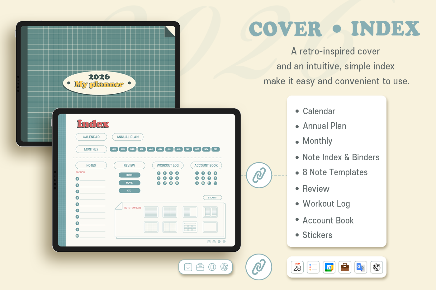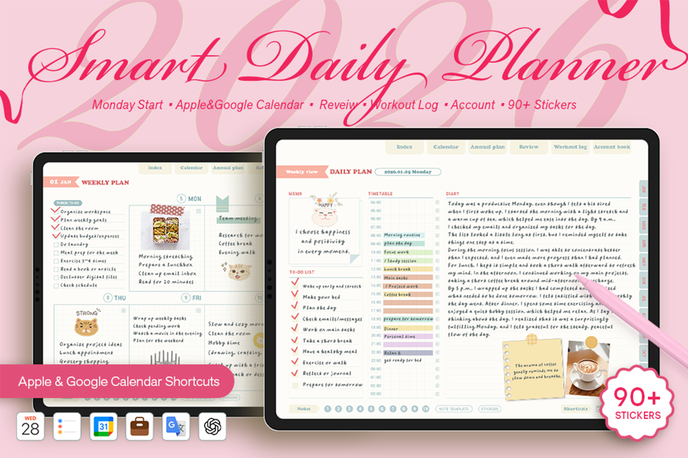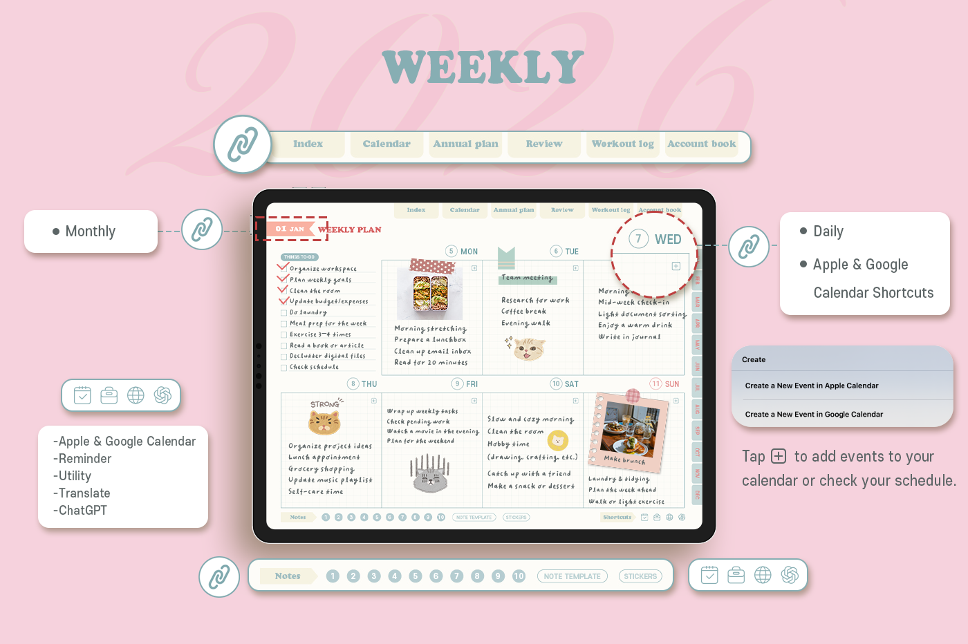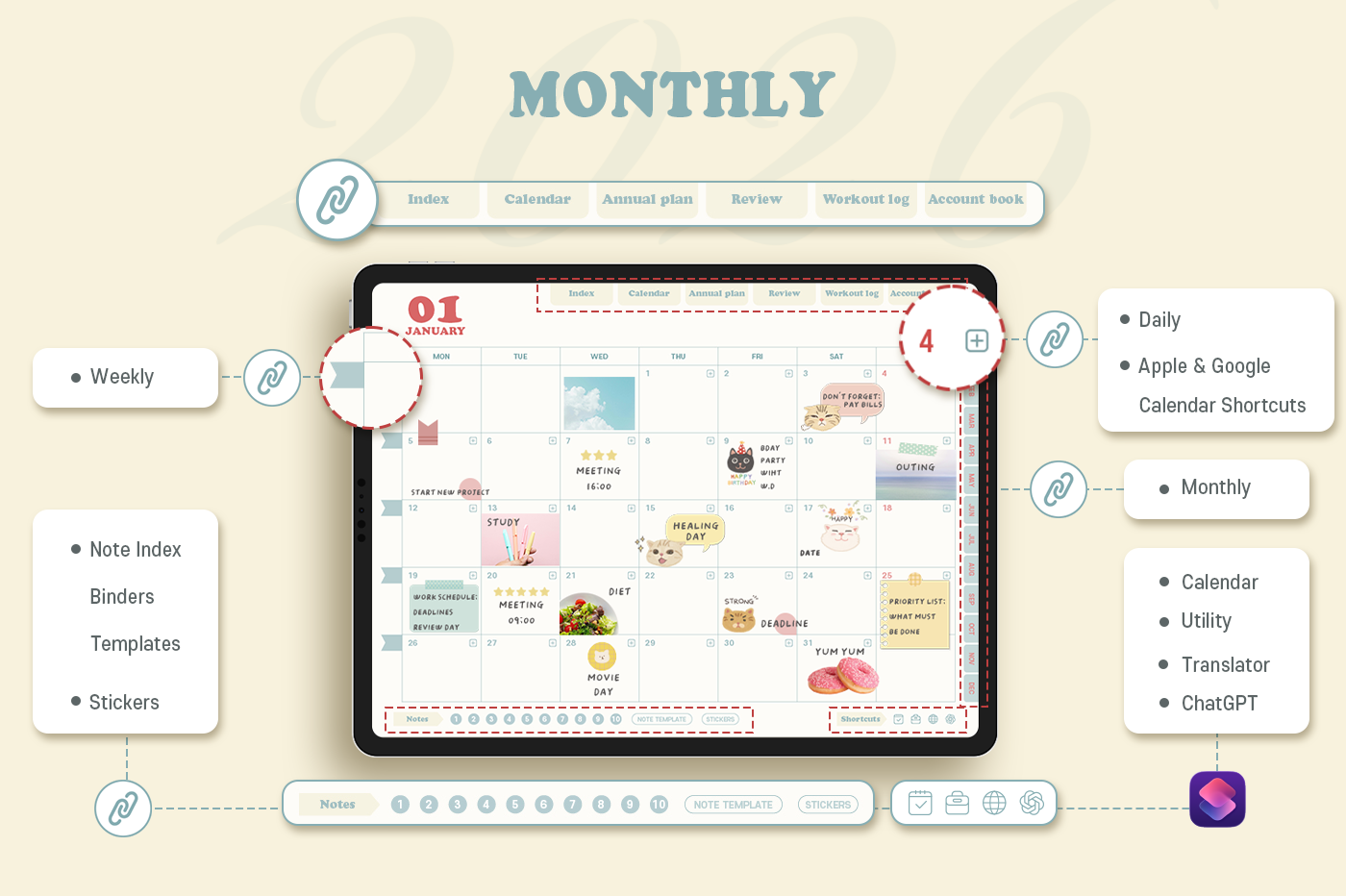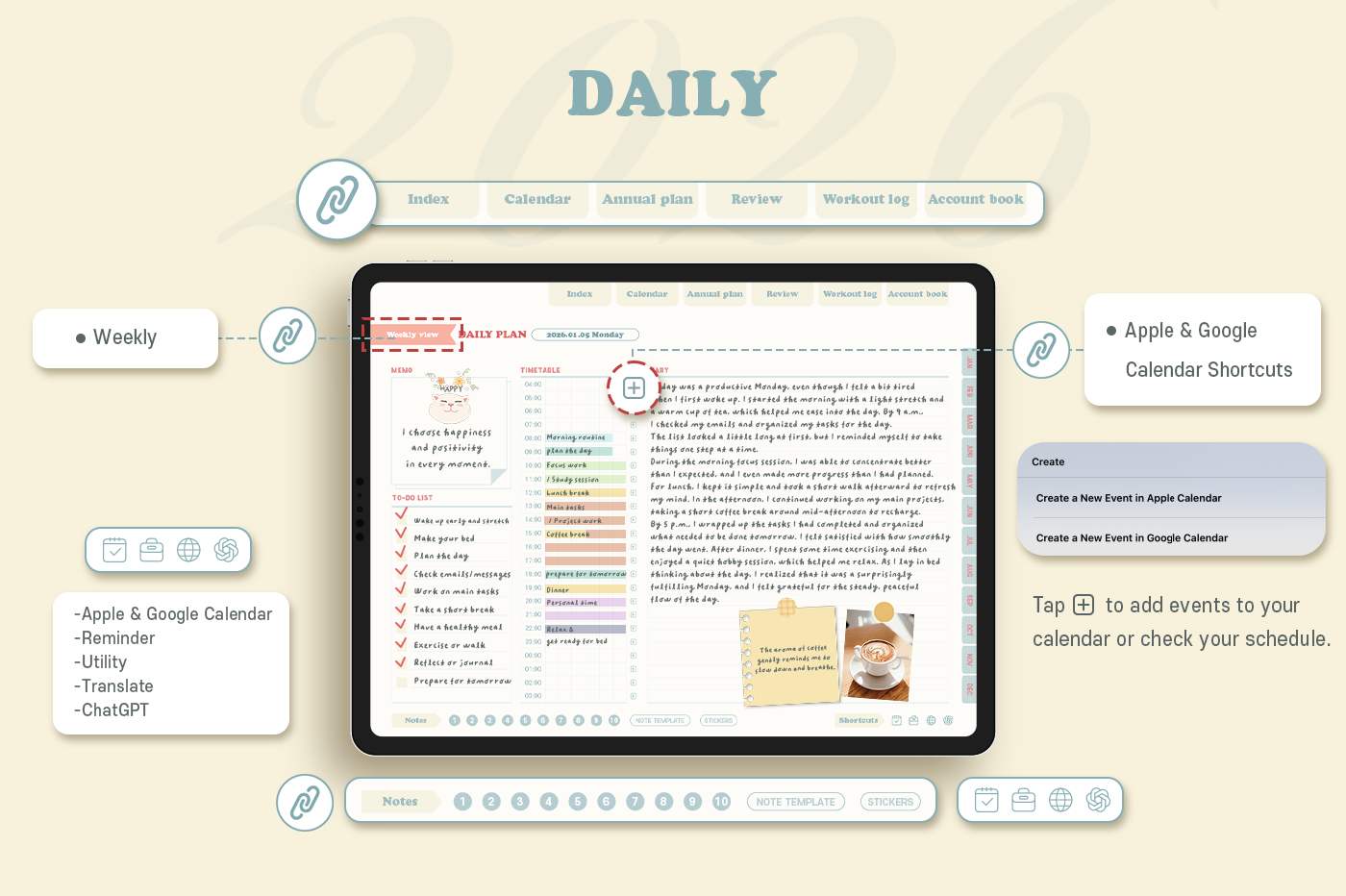[Page Composition] - Hyperlinks - User Guide - Apple & Google Calendar Integration - Shortcuts Integration (Utility, Google Translate, ChatGPT) - Cover - Index - Yearly / Monthly / Weekly / Daily - Review (3 types) - Monthly Workout Log - Monthly Account Book - Note Binders (10) - Notes (8 types) - 90+ Stickers