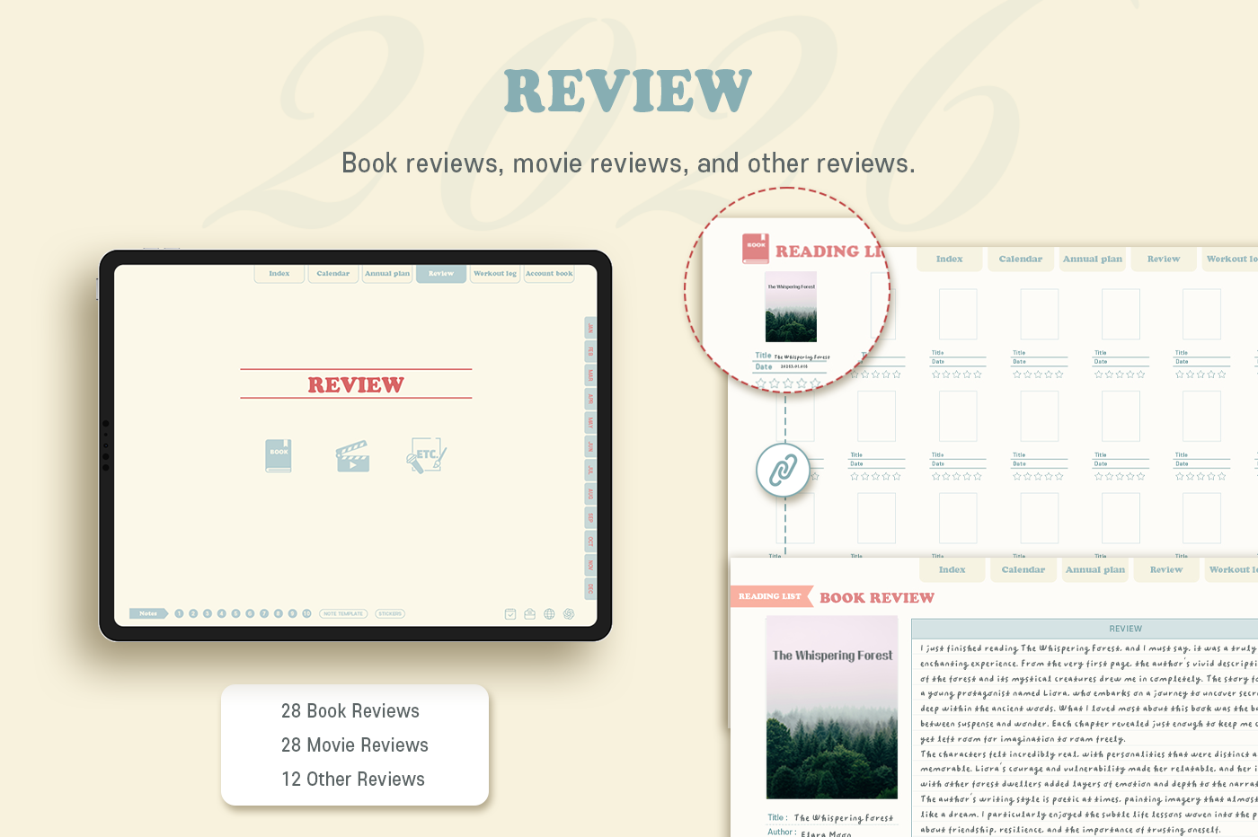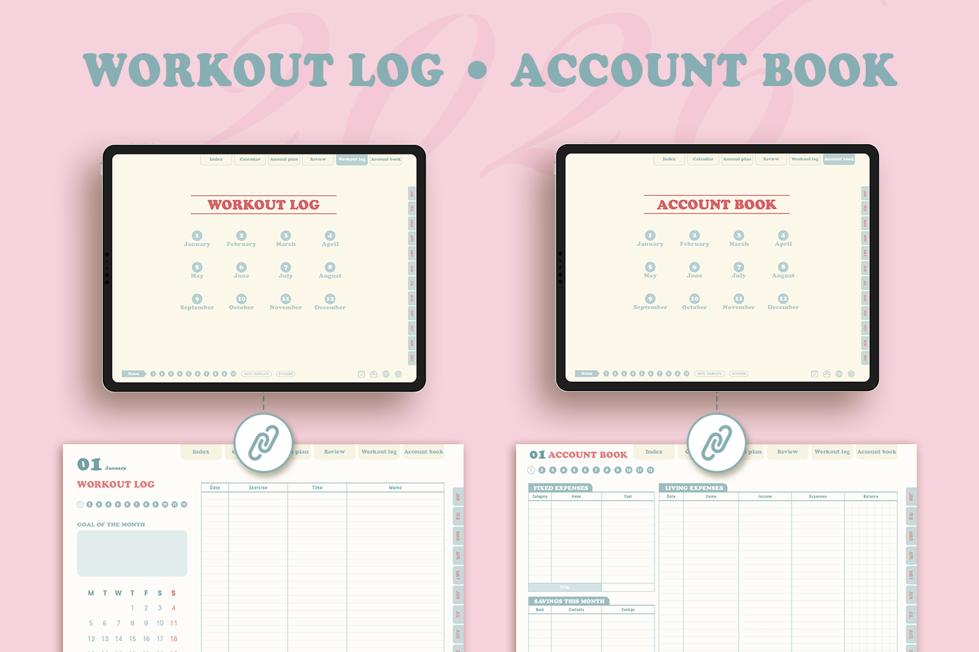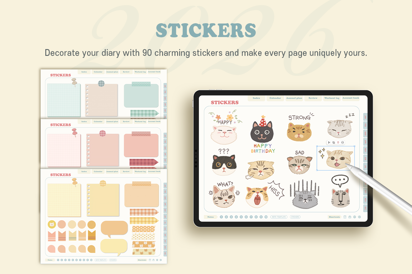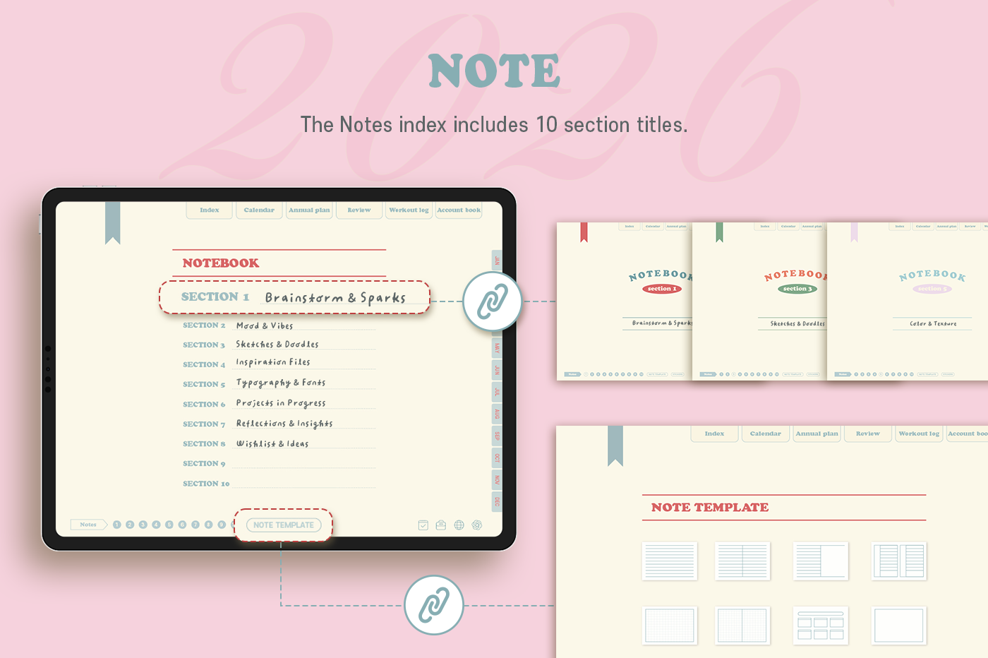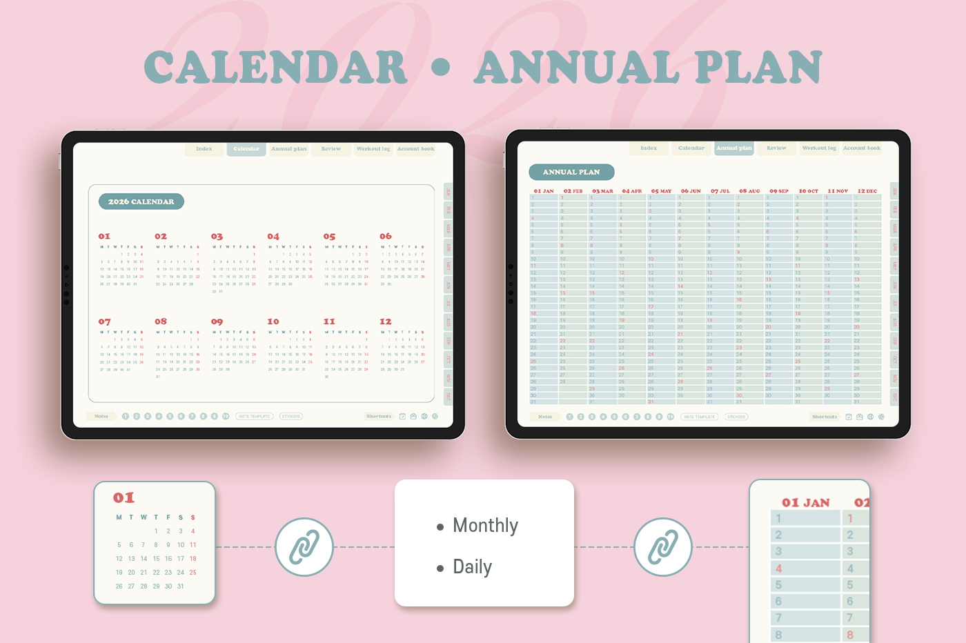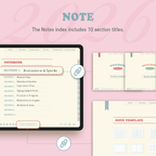[Page Composition] - Hyperlinks - User Guide - Apple & Google Calendar Integration - Shortcuts Integration (Utility, Google Translate, ChatGPT) - Cover - Index - Yearly / Monthly / Weekly / Daily - Review (3 types) - Monthly Workout Log - Monthly Account Book - Note Binders (10) - Notes (8 types) - 90+ Stickers
