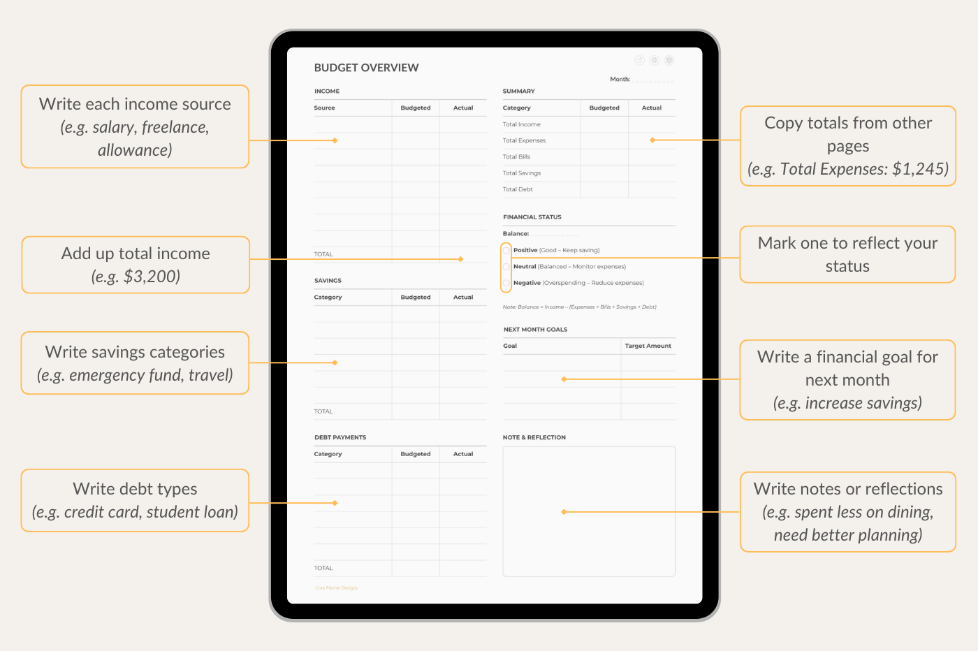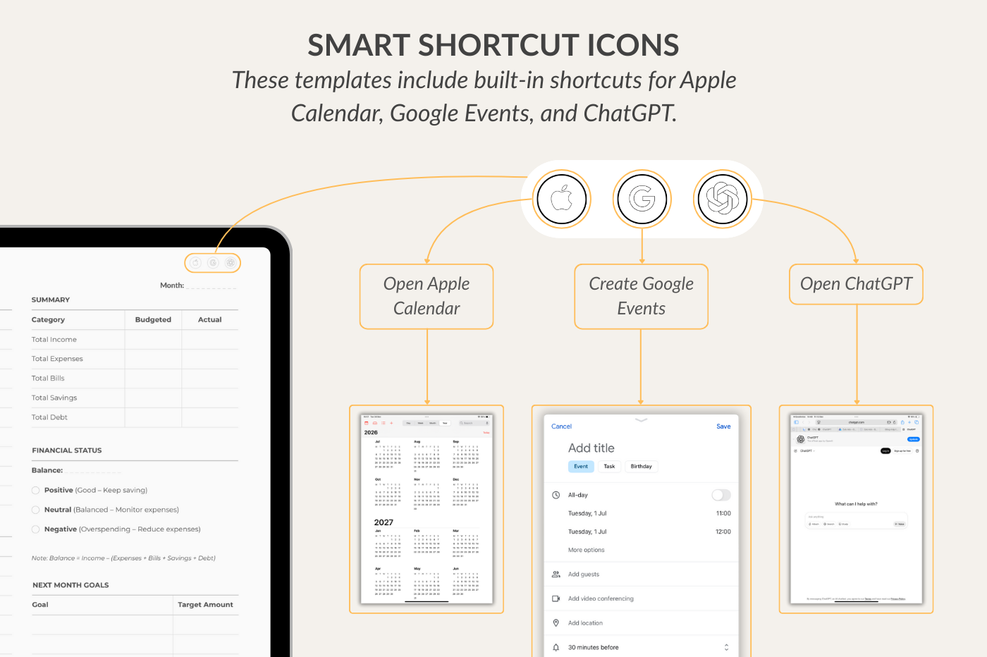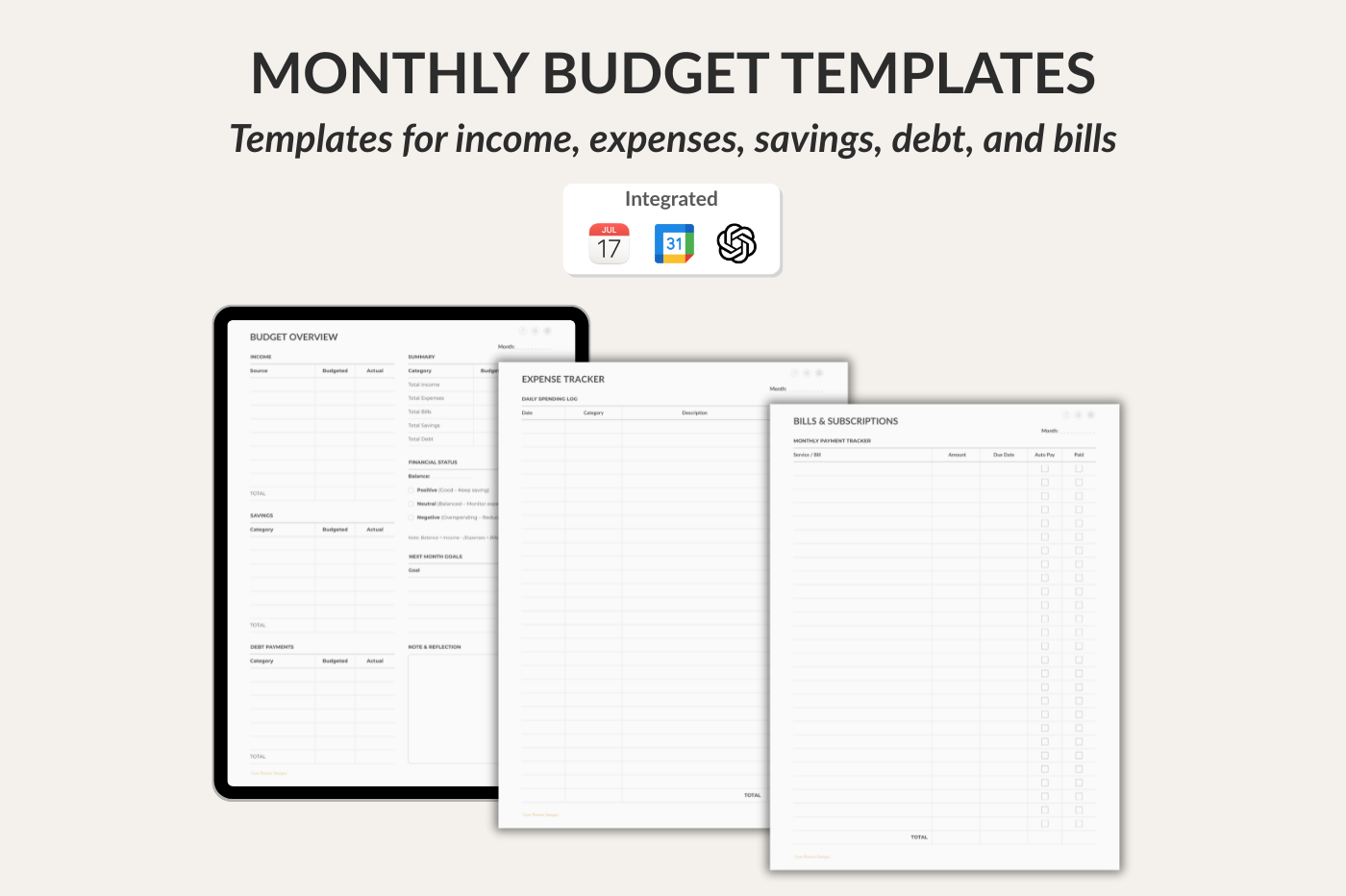 A clean set of monthly budget templates to help you manage your finances with clarity. Track income, expenses, bills, savings, and debt, and review your overall budget across three coordinated pages. Integrated with Apple Calendar, Google Events, and ChatGPT.