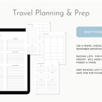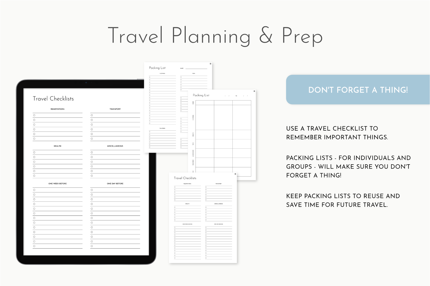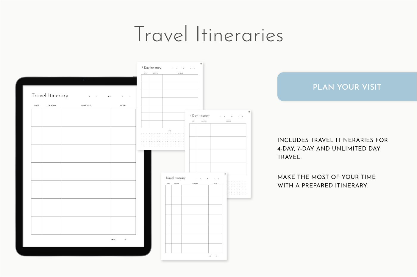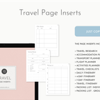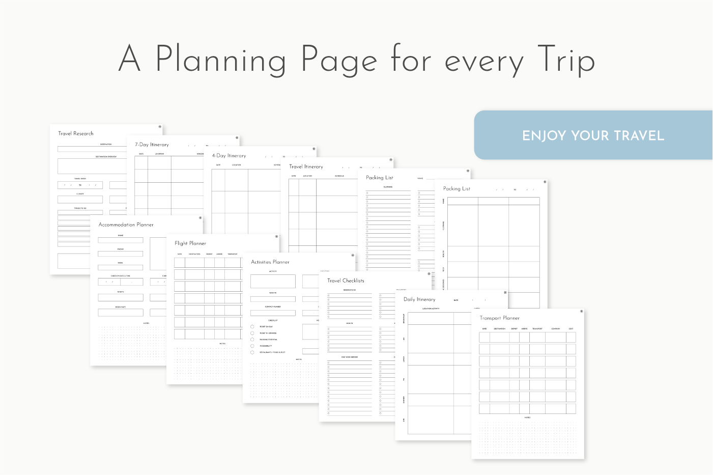 Pages included: Travel Research, Accommodation Planner, Transport Planner, Flight Planner, Activities Planner, Travel Checklists, Daily Itinerary, 4-Day Itinerary, 7-Day Itinerary, Travel Itinerary, Packing List - Individual, Packing Lists - Group