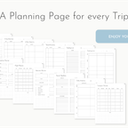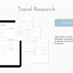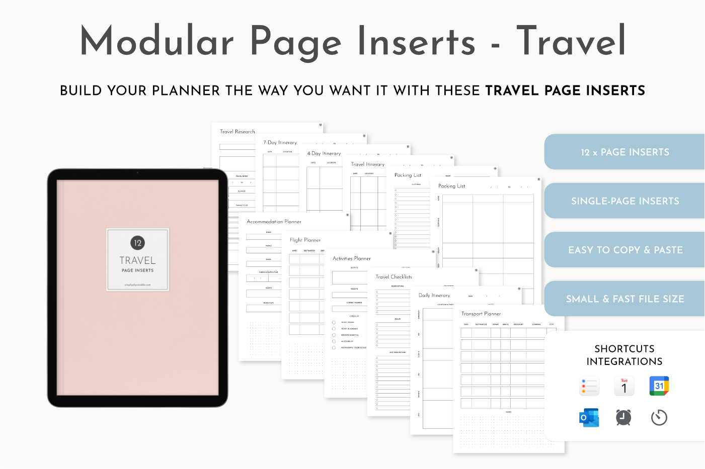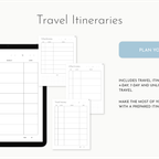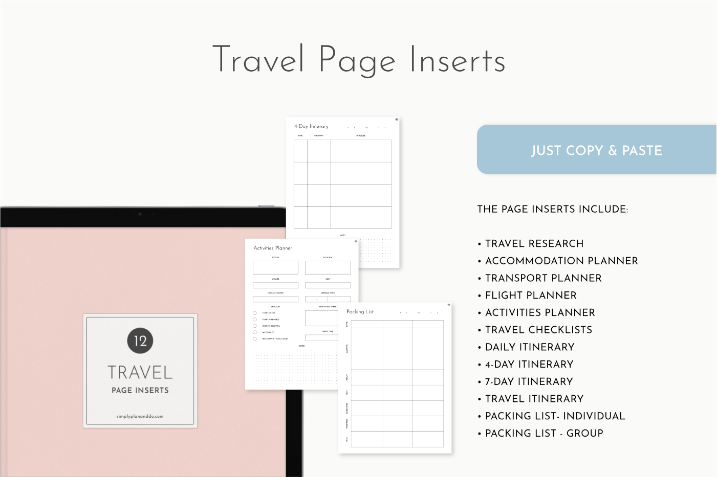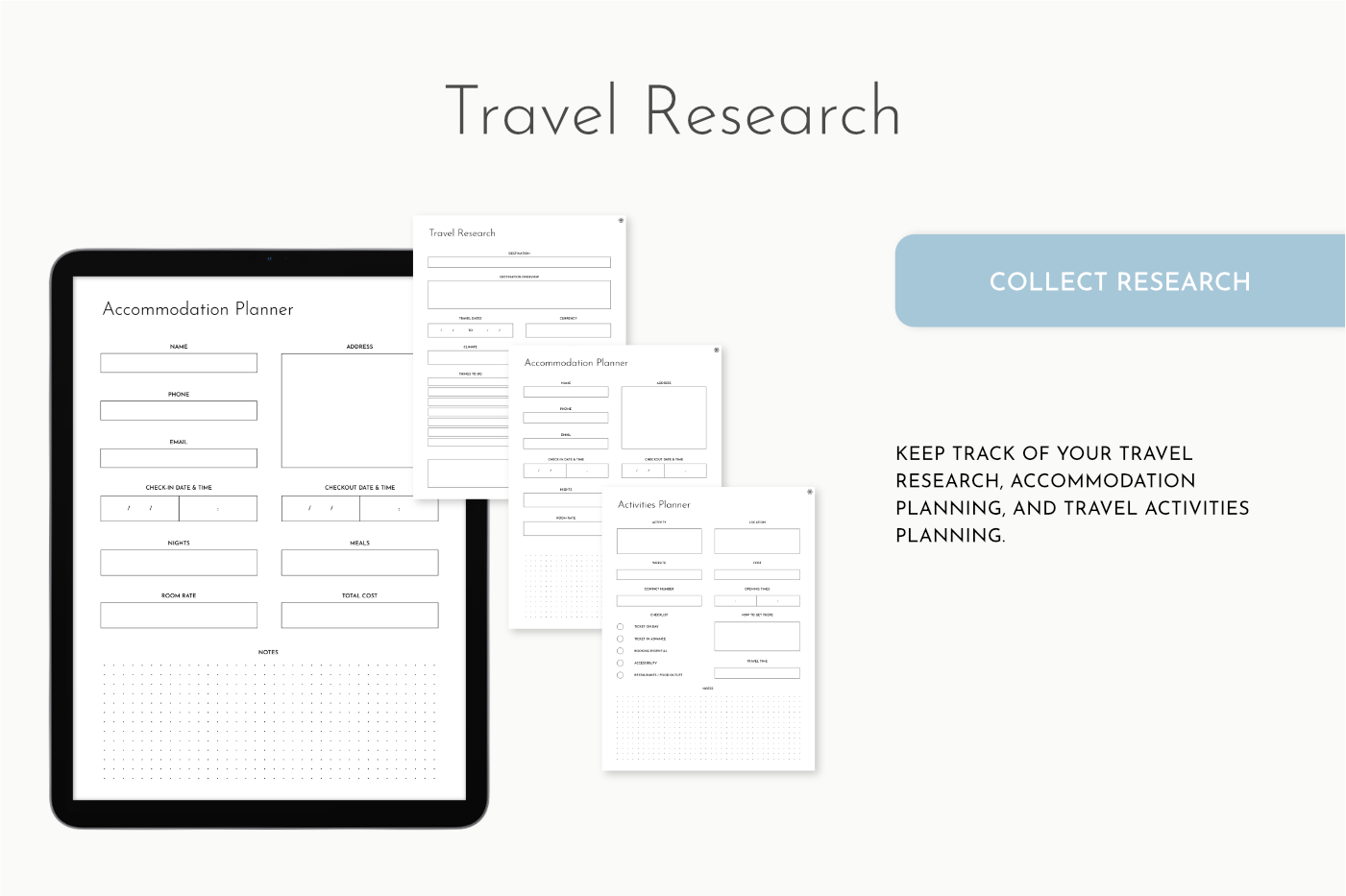 Pages included: Travel Research, Accommodation Planner, Transport Planner, Flight Planner, Activities Planner, Travel Checklists, Daily Itinerary, 4-Day Itinerary, 7-Day Itinerary, Travel Itinerary, Packing List - Individual, Packing Lists - Group