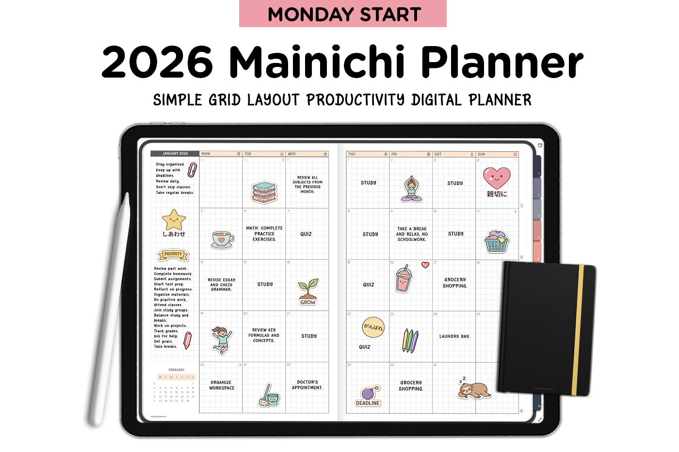 Optimize your year with the Mainichi 2026 Digital Planner, a minimalist, Japanese style planner Featuring daily planning pages, weekly notes, a yearly overview, inspirational quotes, and monthly moon phases, it’s designed to keep you organized, focused, and inspired all year long.