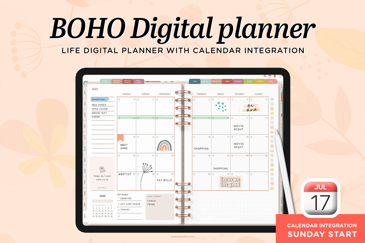 Boho digital planner with Apple Calendar integration for seamless scheduling.