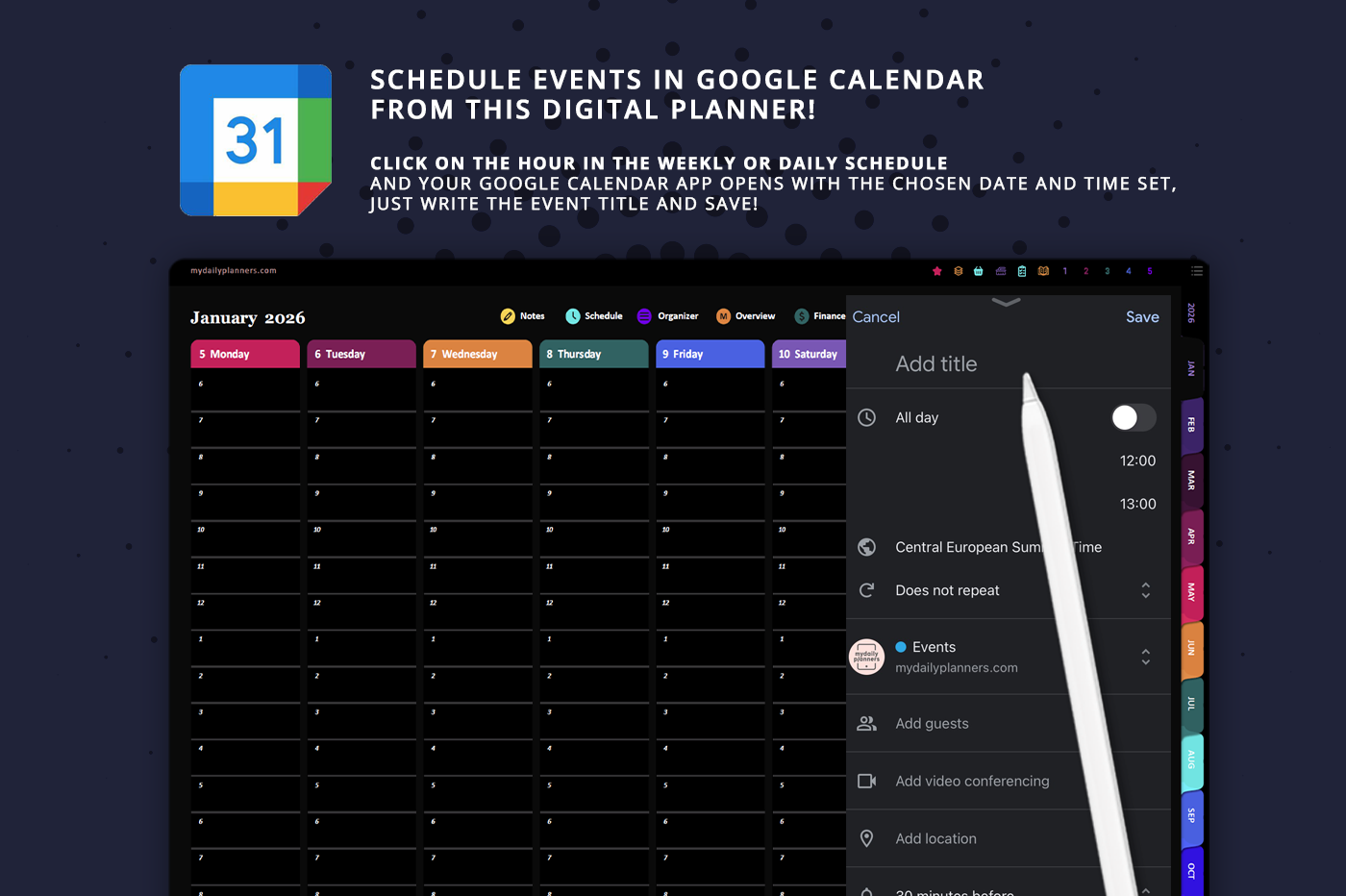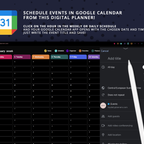 Stay focused and organized with the ADHD Digital Planner, designed to reduce overwhelm and improve productivity. Featuring hyperlinked calendars, structured daily checklists, and category-based task organization, it helps you manage work, personal life, and self-care effortlessly. Includes monthly and weekly planners, budget tracker, routine and meal planners, notes, and more. Seamlessly integrate with Google Calendar to schedule important dates with one click.